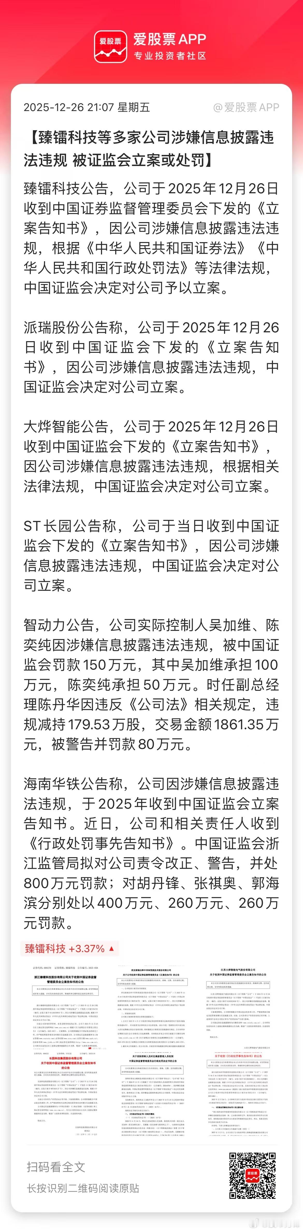 今晚至少5家上市公司被证监会立案或处罚,包括臻镭科技、派瑞股份、大烨智能、智动力、海南华铁等等,这是火力全开啊!臻镭科技9月份董事长被留置,现在公司又被立案调查,改名叫真雷科技算了。公司还是超级大牛股,年内涨幅高达300%。公司2.35万股东要睡不着了,下周一不会20cm跌停吧。(爱股君)