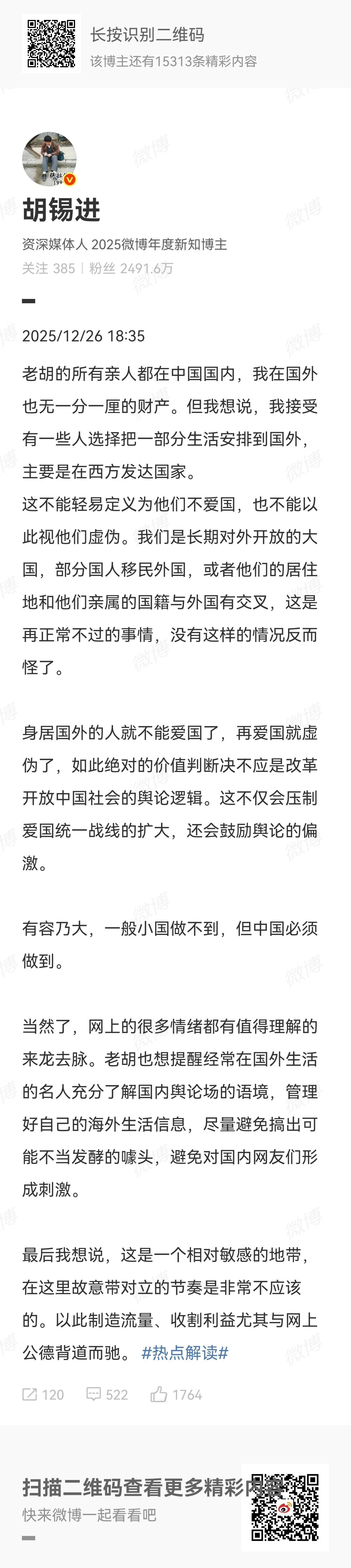 老胡这次说的有点道理:名人们可以在国外有资产,但要低调,不能自己把动静整大了。动静大了,让大家来揪辫子,那是自己跟自己过不去。老胡也再次澄清,自己在国外没有资产,是个忠诚的人。