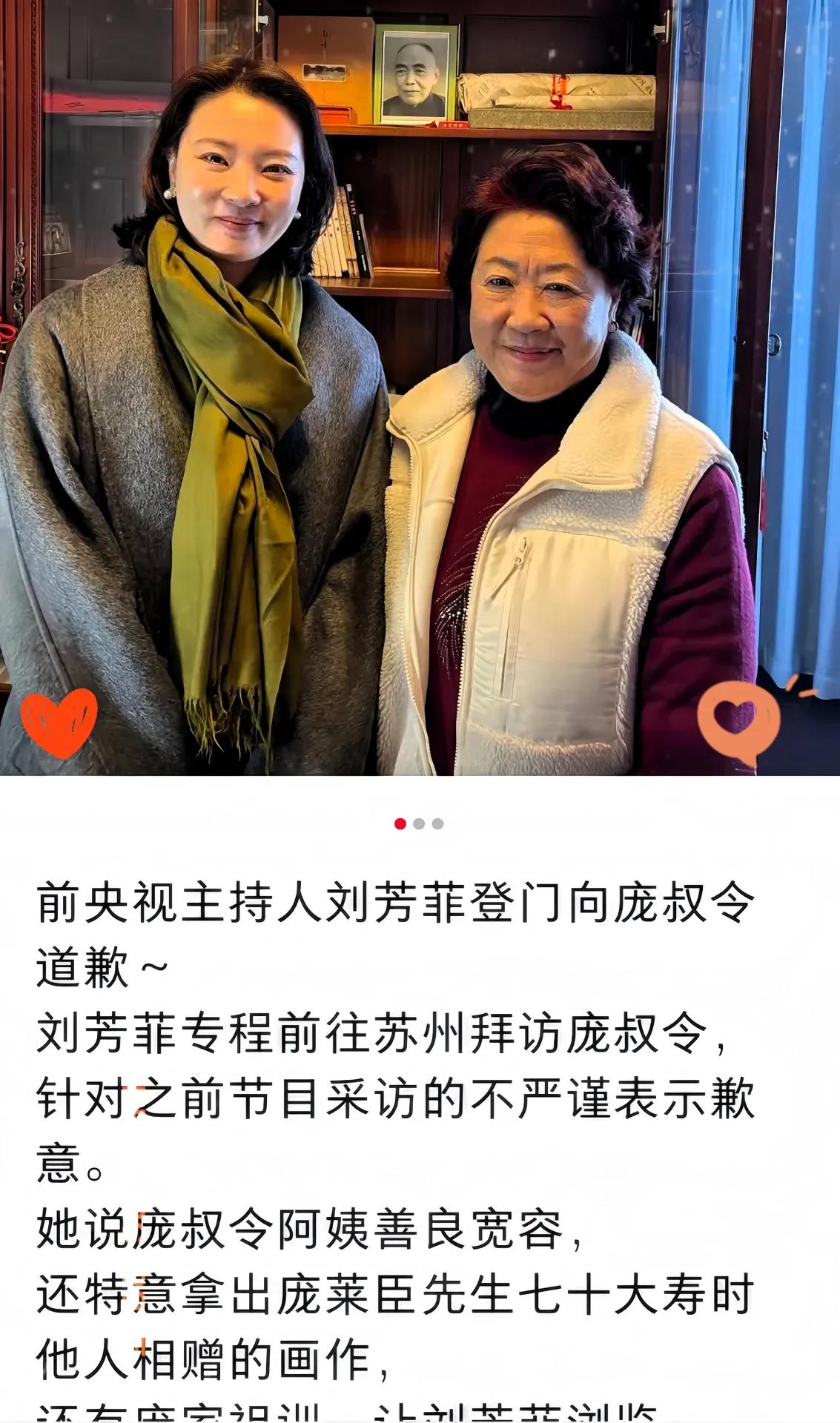 刘芳菲这回动作是真利索,前脚刚被庞家后人指正,后脚人直接就到了苏州。 这事儿办得挺体面,没找公关发通告,而是实打实地登门道歉。 最让人意外的是庞家人的态度。 本以为怎么着也得说道说道,结果庞女士非但没黑脸,反倒是一脸的和气。 现场甚至还拿出了庞莱臣先生当年的祝寿画作一起欣赏,这氛围哪像是去道歉的,倒像是老友叙旧。 看看人家这心胸,这才叫真正的名门底蕴。 换做一般人,被冒犯了哪怕不闹腾,心里多少也有个疙瘩。但在庞家这儿,云淡风轻就过去了。 这种刻在骨子里的涵养,确实装不出来,比网上那些动不动就上纲上线的强太多了。 各位读者朋友你们怎么看呢?欢迎来评论区聊聊呗!