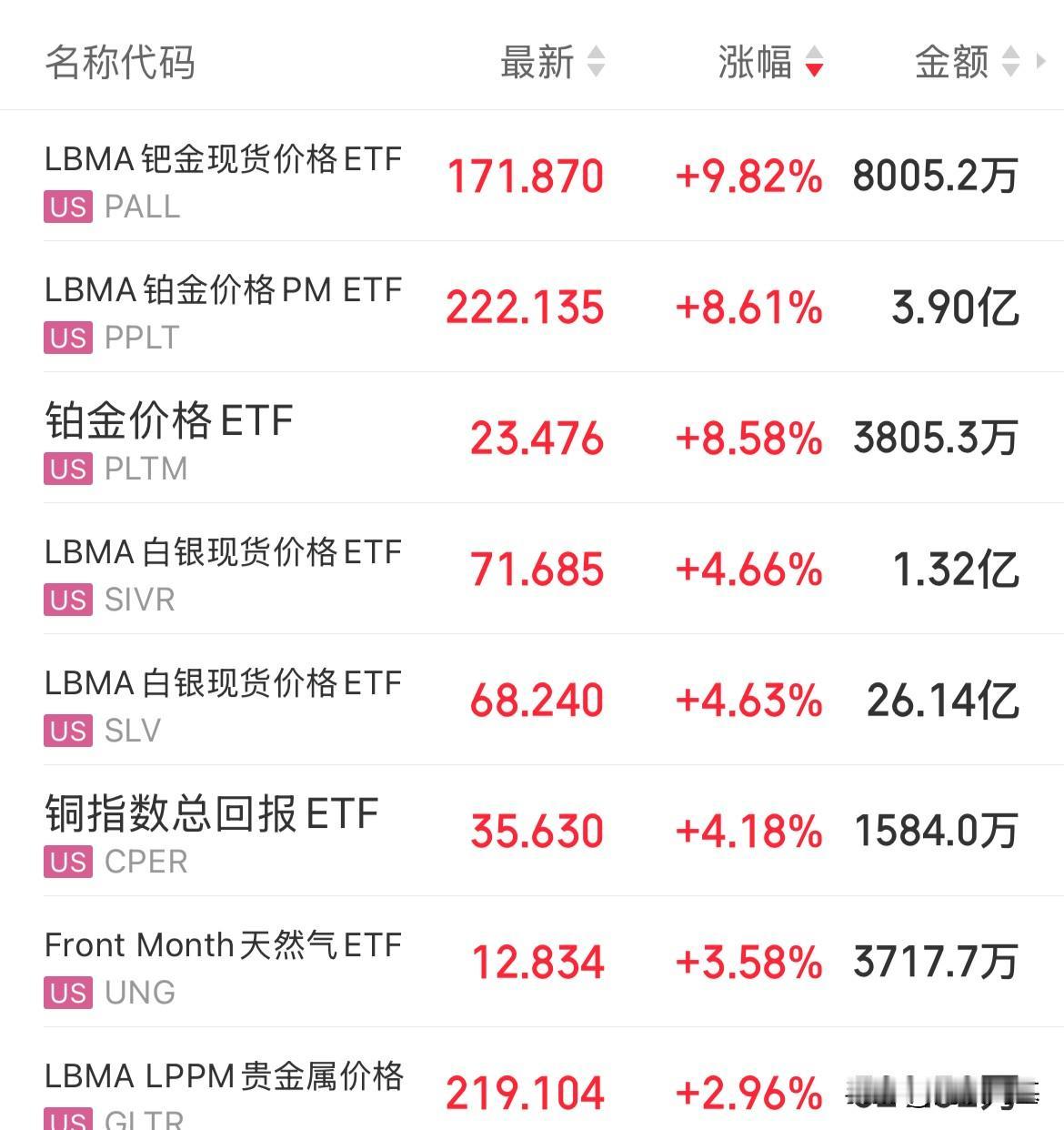 美股开盘,贵金属ETF集体飙升,钯金ETF大涨9%,铂金ETF大涨8%,白银大涨4%,铜都涨幅超4%,白银交易额居首,已超27亿美元了