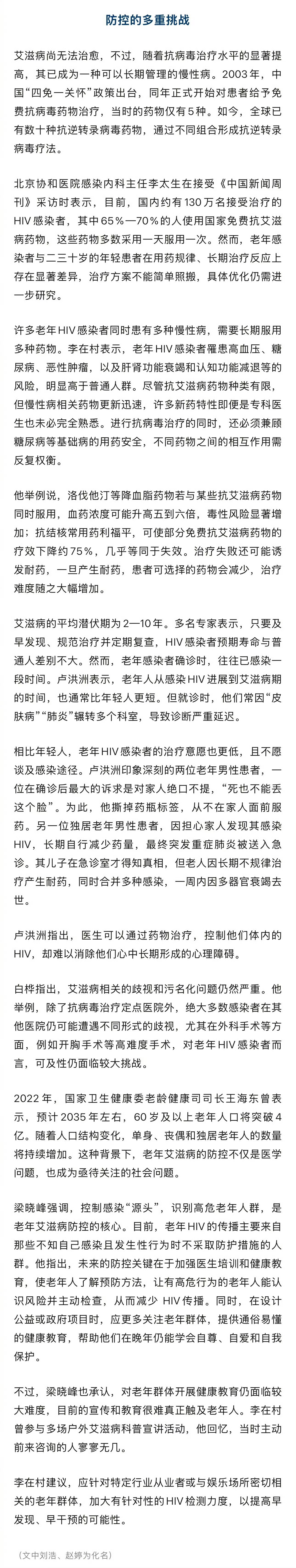 【#8旬老人与保姆发生性关系感染HIV#】#老年男性HIV感染者数量约为女性3倍# 近年来,尽管我国艾滋病疫情总体仍处于低流行水平,但新发的老年HIV感染者和艾滋病患者的占比却持续上升。据报道,今年广东、浙江等地的高龄HIV病例占比均明显增加,其中浙江今年新发HIV病例中,50岁以上的中老年群体已占到39.2%。中国疾病预防控制中心原副主任、暨南大学疾病预防控制研究院院长梁晓峰表示,随着老龄化加剧,老年新发的HIV感染者和艾滋病患者数量可能还会继续增长,应尽早给予足够重视。北京佑安医院感染中心门诊主任医师李在村曾接诊过一名八十多岁的男性HIV感染者。李在村告诉,这名老人后来解释,原因是家中曾雇佣的一名中年保姆因急需用钱,提出“给钱就可以发生关系”。邵英表示,五六十岁的老年群体身体状况良好、生活条件较好,性需求仍然存在,这是不可回避的现实。(中国新闻周刊)