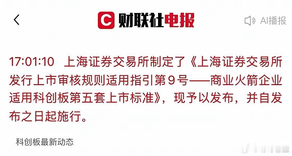 我的天啊!!!!我的天啊!!!!!你们快来瞧瞧!这么下去,商业航天概念得一直持续下去了,啥时候结束我不晓得!我也猜不到!这个新规的核心就是:即使尚未盈利,具备核心技术与广阔前景的商业火箭公司也可申请上市融资!这是啥!这就是说国家正在积极的通过资本市场为商业航天公司注入强大动力。来吧,干吧!继续腾飞吧!我们的征途是星辰大海!