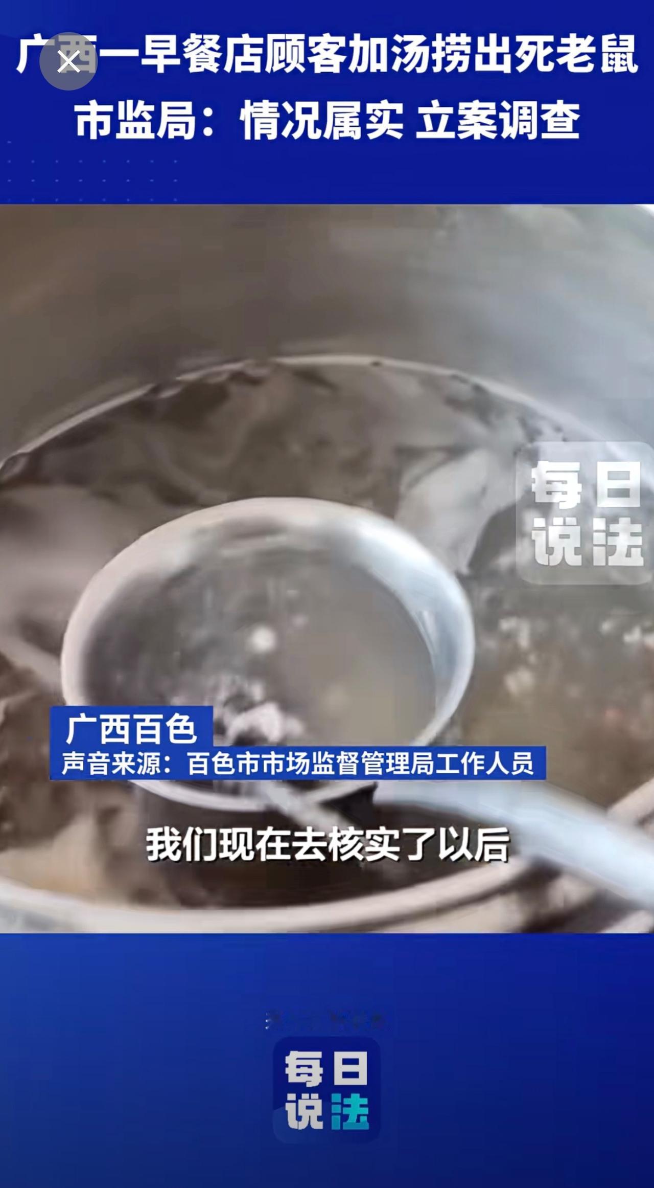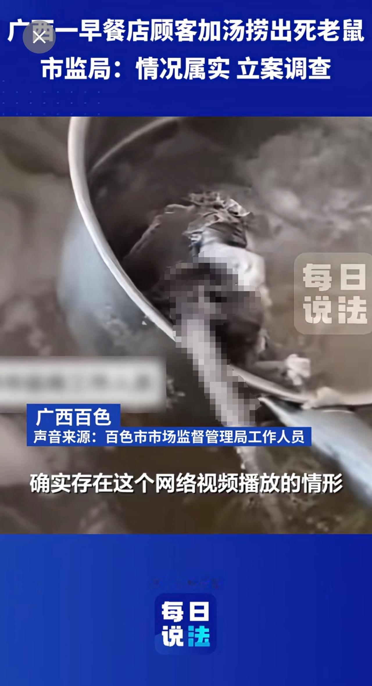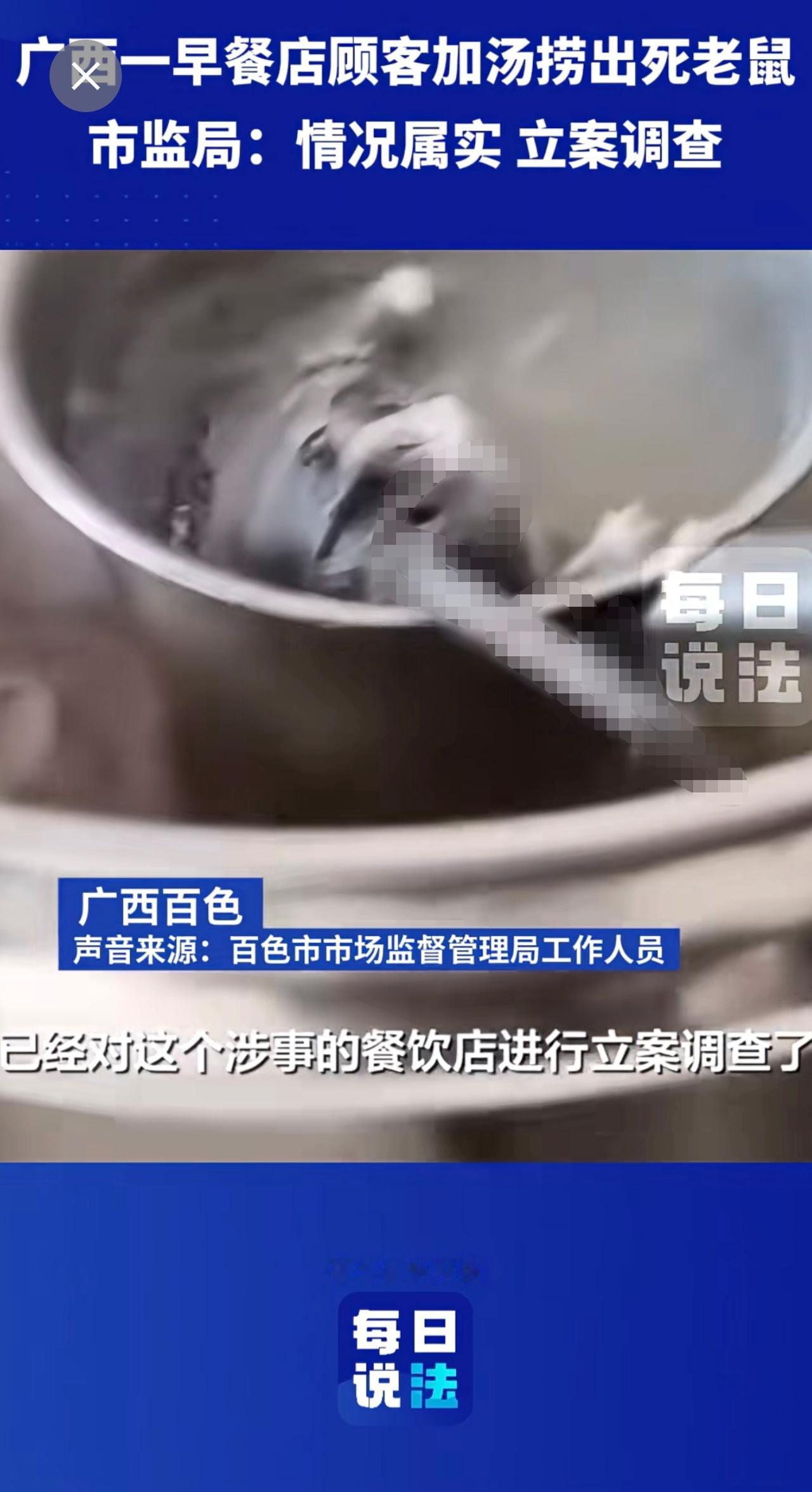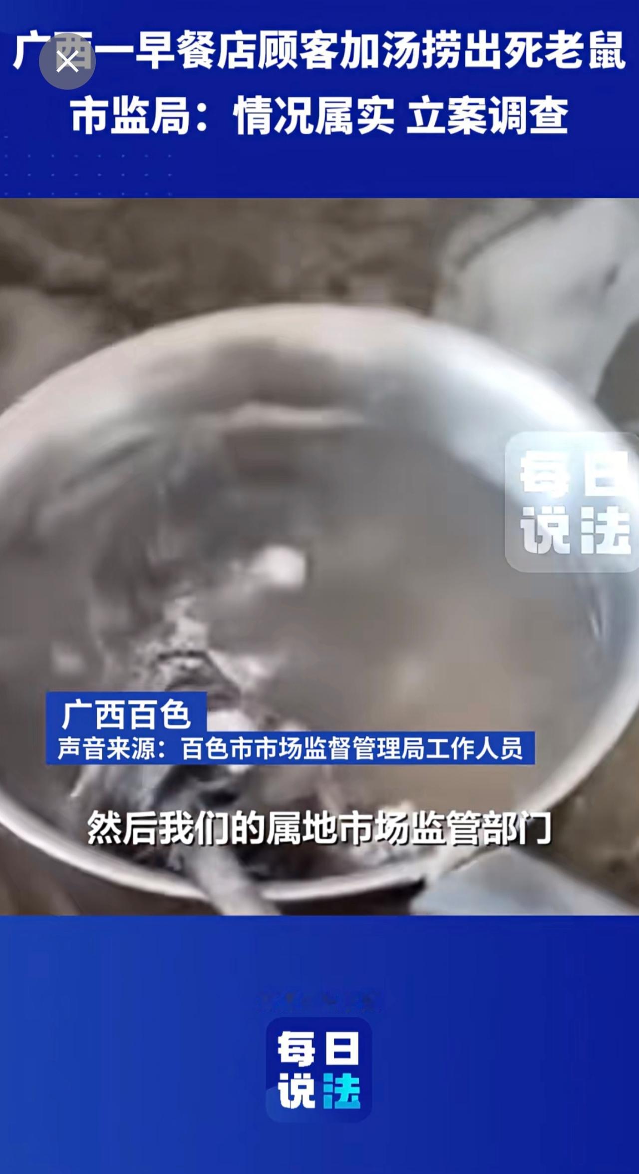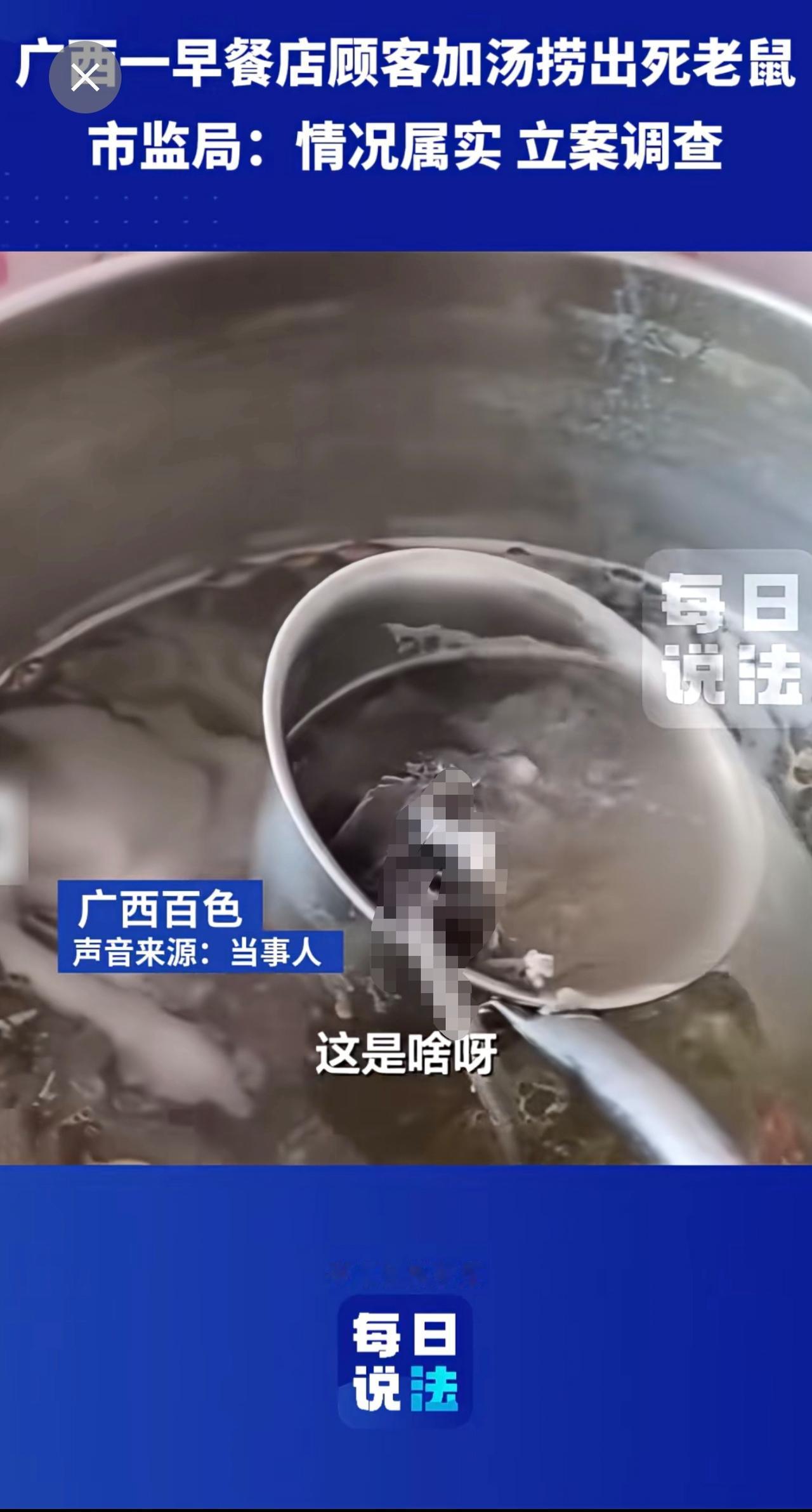 广西一早餐店顾客加汤捞出死老鼠,市监局:立案调查 早餐 死老鼠