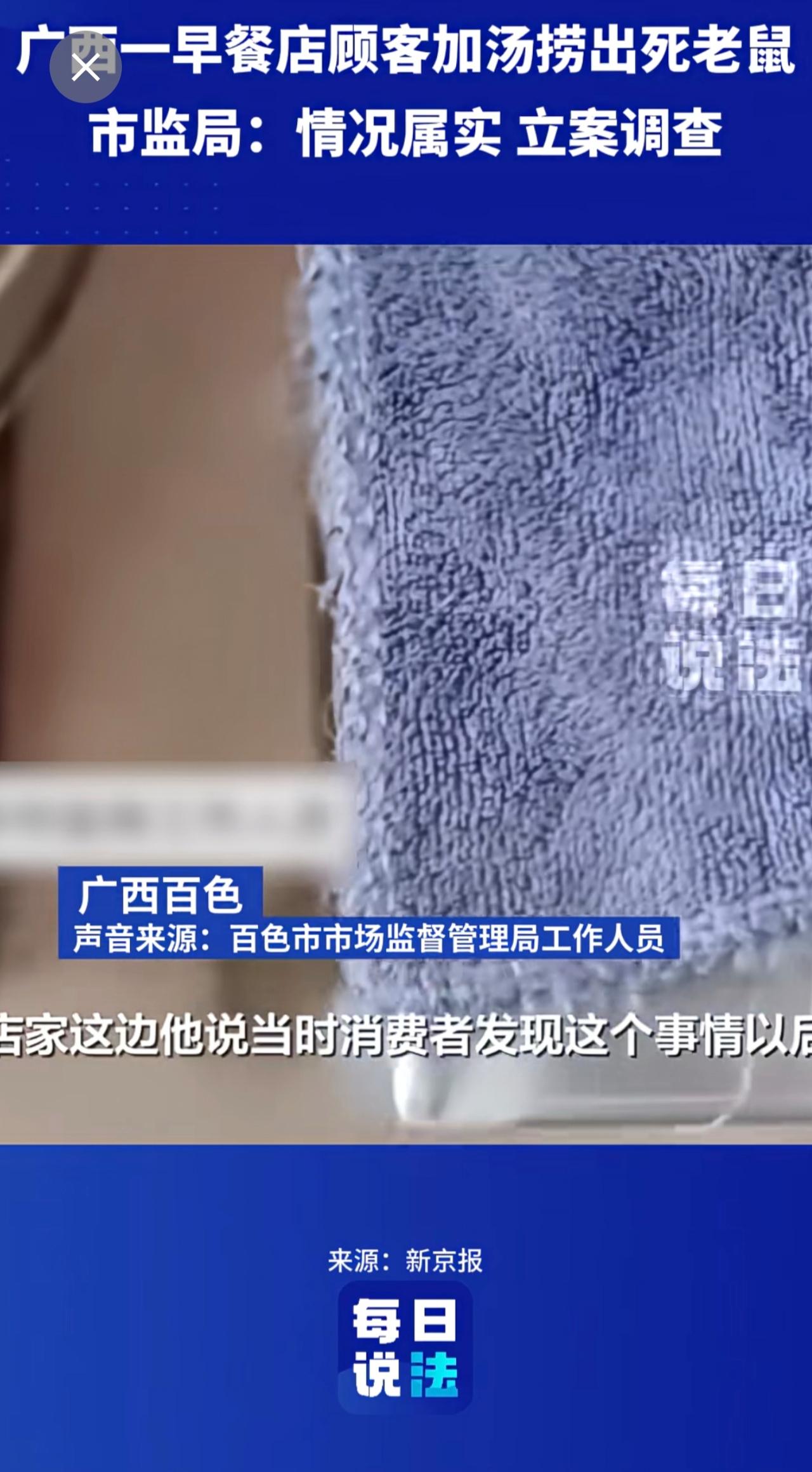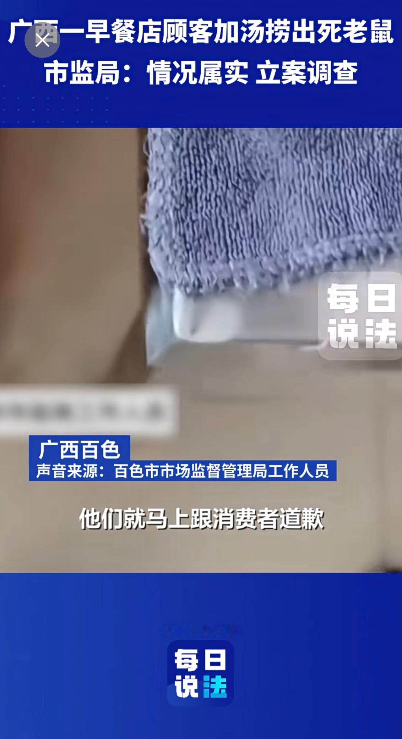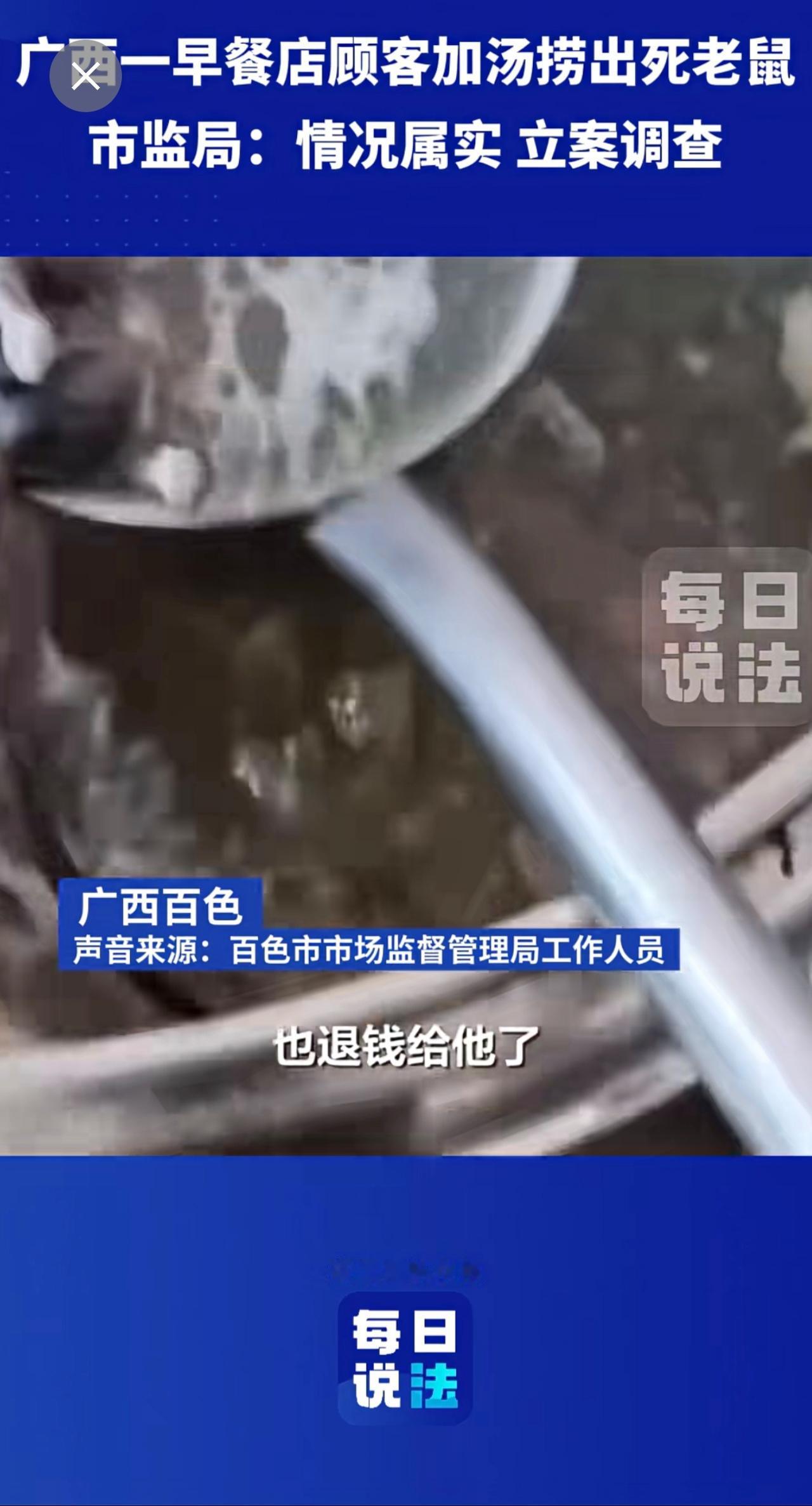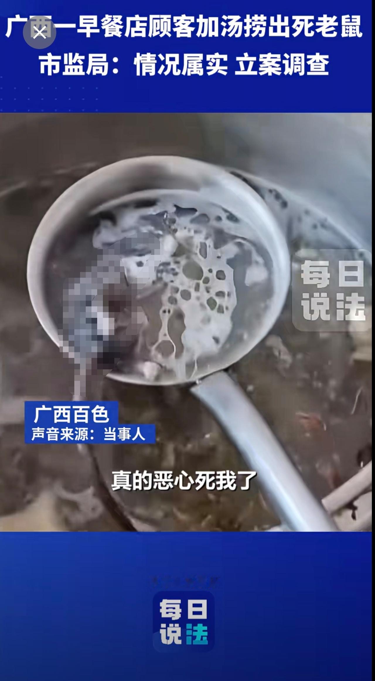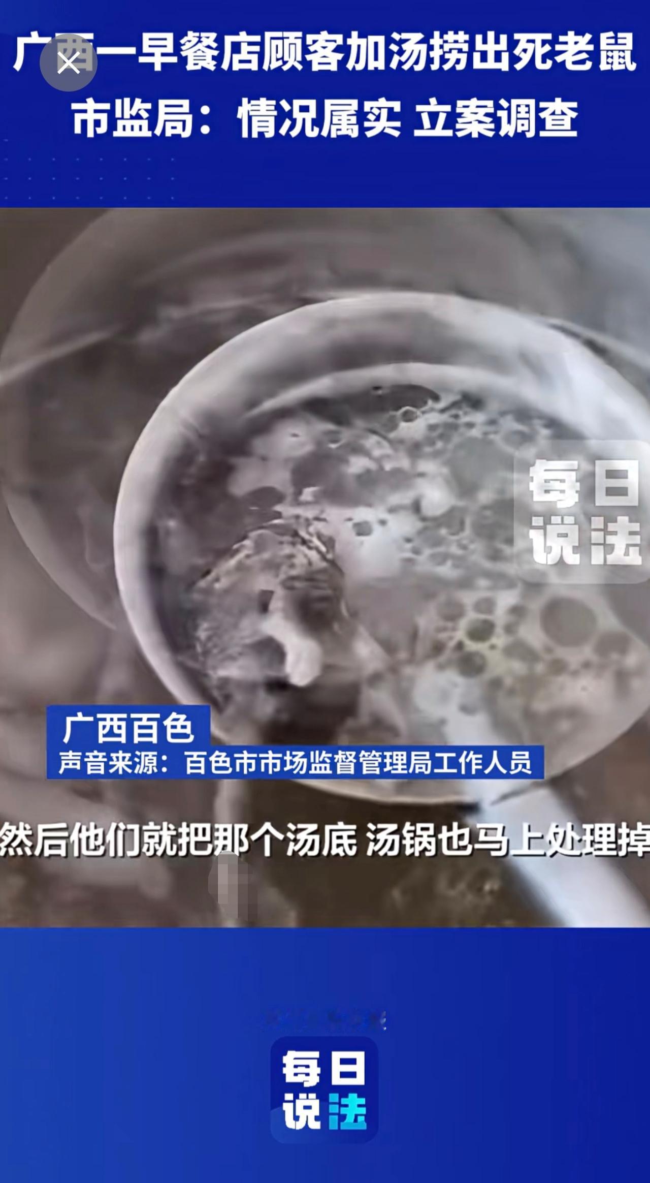 广西一早餐店顾客加汤捞出死老鼠,市监局:立案调查 早餐 死老鼠