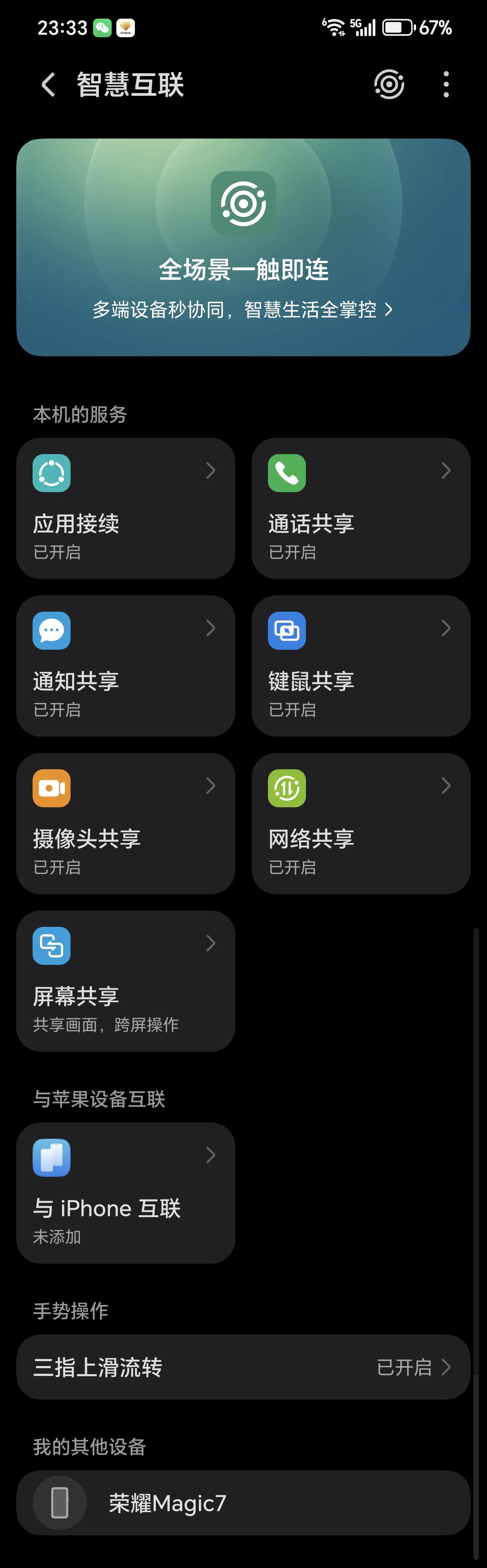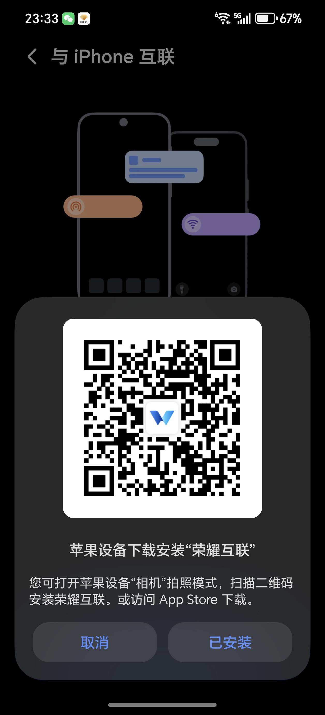 自从荣耀全品牌实现互联互通后,部分朋友还不太会用。今天先跟大家分享荣耀与 iPhone 互传文件的方法。随着 MagicOS 大版本升至 10.1.20,新旧功能一并上线:荣耀手机与 iPhone 已支持多应用通知共享、双机消息跨端提醒,大大方便双机党,也提升与苹果用户的交互效率。 设置路径: 1. iPhone 开启荣耀互联 > 与荣耀设备互联 ,即可看到二维码 2. 荣耀手机进入 设置 > 智慧互联 > 与 iPhone 互联 ,点击扫码添加。若 iPhone 未安装荣耀互联 APP,则按弹窗提示在 iphone 设备上安装;若已安装,点击已安装 3. 荣耀手机扫描 iPhone 上的二维码,发起配对申请,iPhone 同意配对 4. 连接成功后,即可实现双机间通知流转。