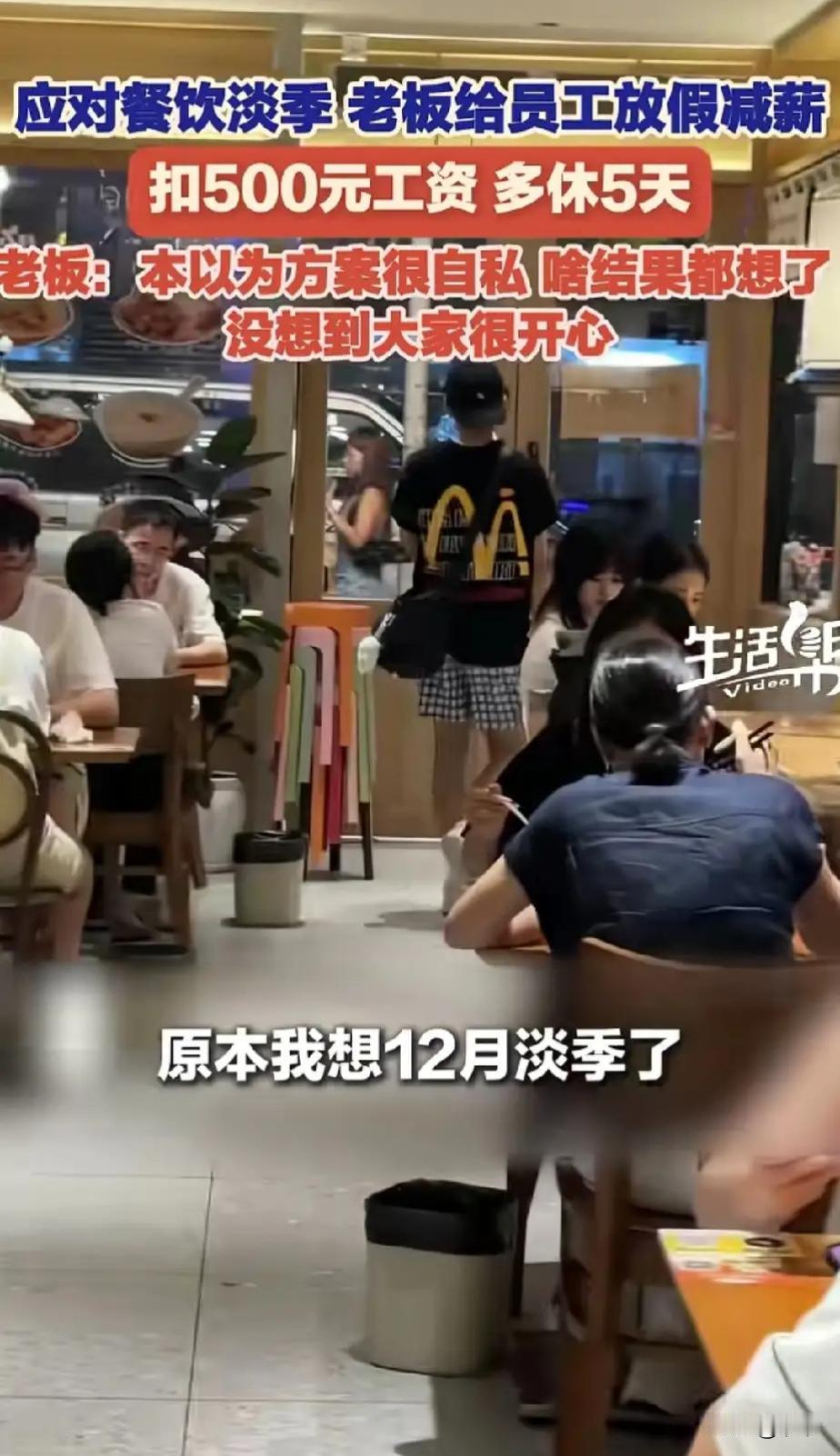 湖北一位90店主, 招了一群90后开餐厅, 餐厅的生意还算火爆, 他们相处也非常的容易, 有时候还拍个视频找找乐子, 但是也顶不住12月份餐厅进入了淡季, 生意一下子锐减, 没有办法的,他就想给员工降降工资, 本来还担心大家不同意, 没想到大家听说减500块钱就可以放几天假,居然纷纷找他要求请假, 这可把他逗乐了, 直接给大家放了10天的假, 趁着生意不太好大家可以干一些自己的事,这些都是90后, 平时由于太忙,没有假期, 现在一下子都像出笼的小鸟, 本来还愁容满面的九零后武汉小老板, 这时候又开心了起来, 大家估计都是嫌他不容易, 这才开心的放了假, 看来平时关系确实还不错, 要是别的餐饮店估计都吵起来了, 生意好的时候让员工加班, 生意淡季的时候逼迫员工休息, 这种老板最可恶了, 这武汉小老板还可以。 大家对于湖北武汉90小老板扣员工500块钱,给员工放假10天怎么看?