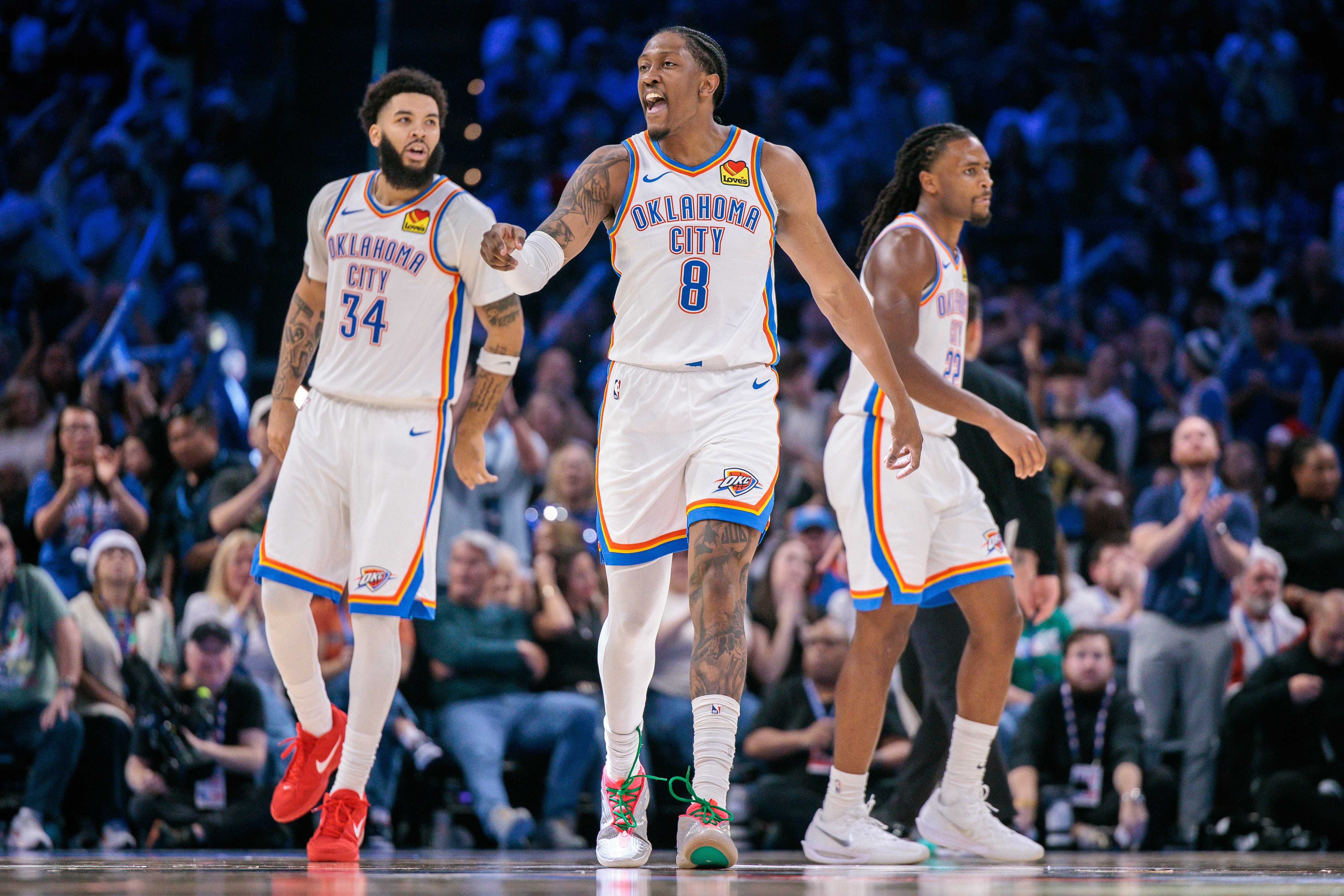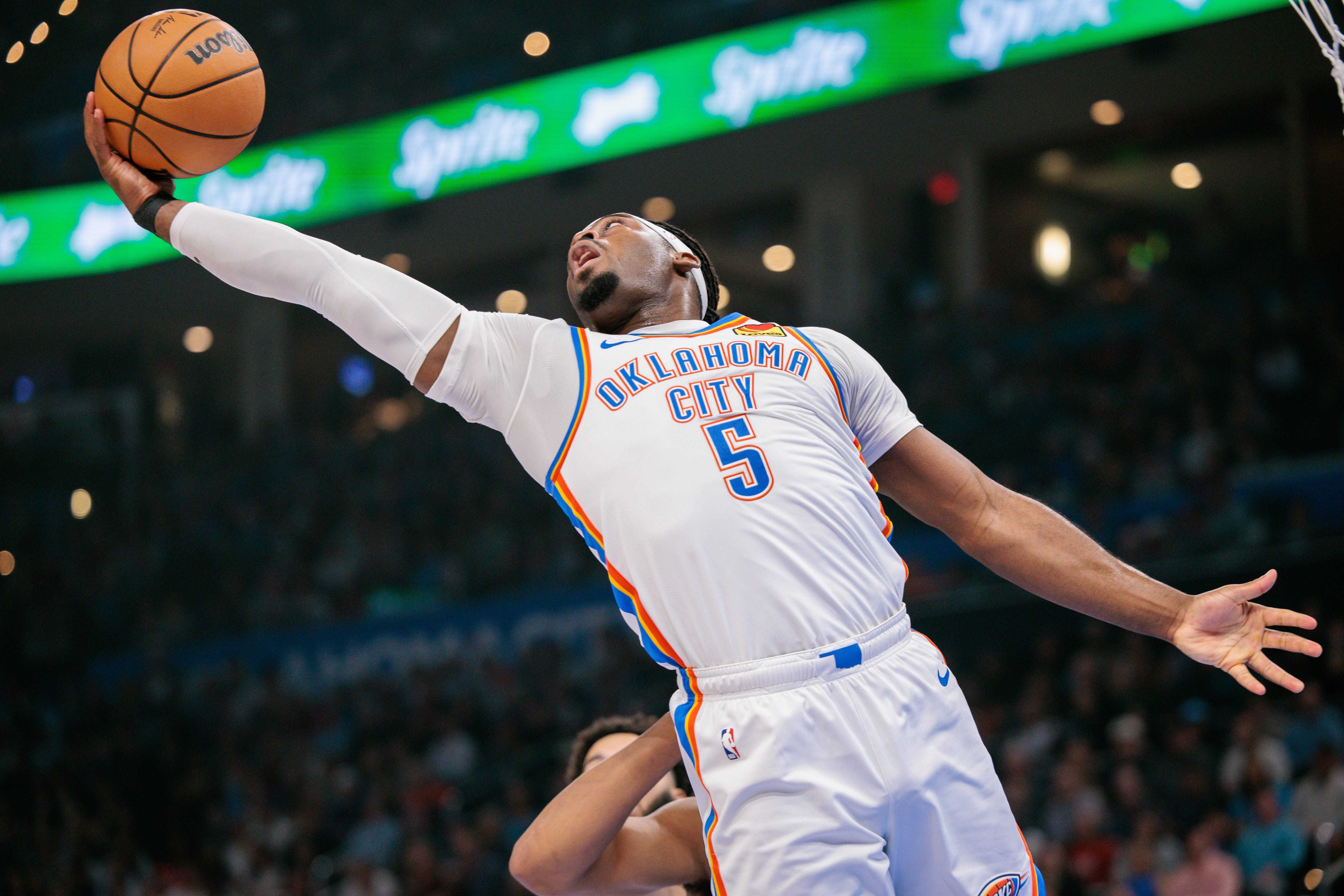 切特第一投不进但哈腾拿到篮板,随后五人盯防直接溜进去接杰伦传球扣篮得手!雷霆vs