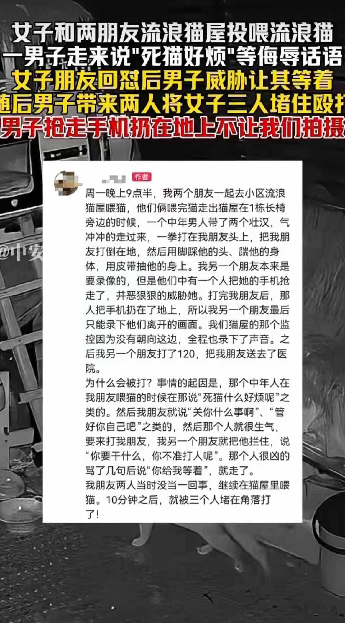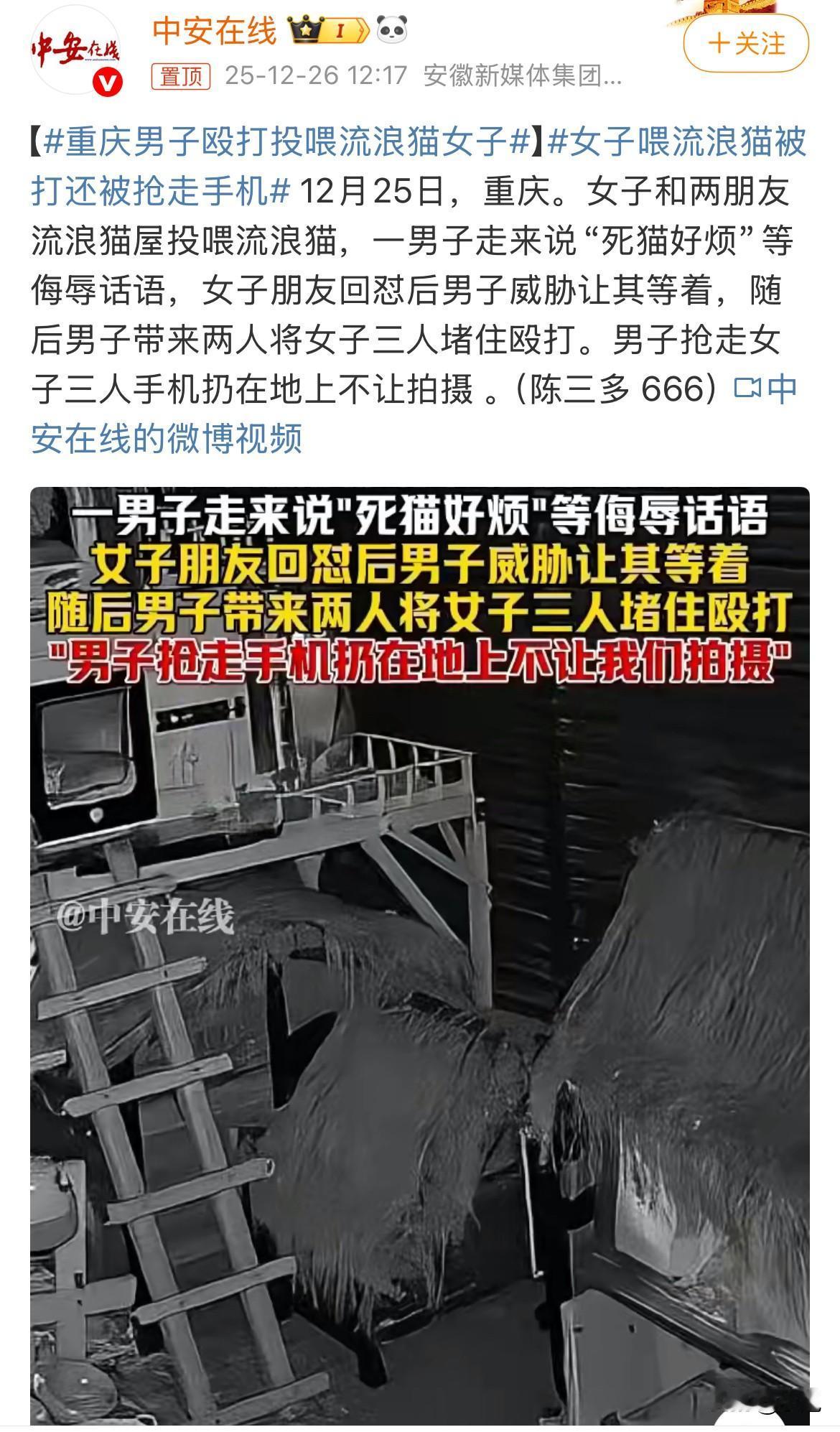 12月25号,重庆某小区,三个姑娘在小区固定的猫屋那儿喂流浪猫。结果一个中年男人走过来,开口就是一句“死猫好烦”,话里话外全是侮辱。 姑娘的朋友气不过,回了一句嘴。就这一句,惹火了那男的。他指着她们说,“你们等着”,说完扭头就走。 十分钟不到,他真的回来了,不是一个人,是带了两个帮手。三个人把那三个姑娘堵在角落,直接动手。拳打脚踢,听说还往人头上踹。女孩们想拿手机拍下来,结果手机全被抢过去,狠狠摔在地上。这就是明摆着不让留证据。 事情在网上爆出来,很多人都气炸了。这早就不是喂不喂猫的争论了,这是实打实的围殴,是暴力。因为一句话不对付,就叫人来打,还是三个男的打三个女的,这算什么本事? 有人说不该喂流浪猫,扰民。这话或许有道理,小区环境、邻居感受,这些都可以坐下来谈,找物业,商量科学管理的办法。但所有这些道理,在拳头面前都显得特别苍白。用暴力来解决分歧,这本身就是最错误的选择。今天可以因为讨厌猫打人,明天会不会因为别的看不顺眼的事也动手? 现在最新的消息是,打人的跑了,警方已经介入调查。大家都在等一个结果,等一个公道。那三个姑娘挨的打,摔碎的手机,还有她们受的惊吓,不能就这么算了。
