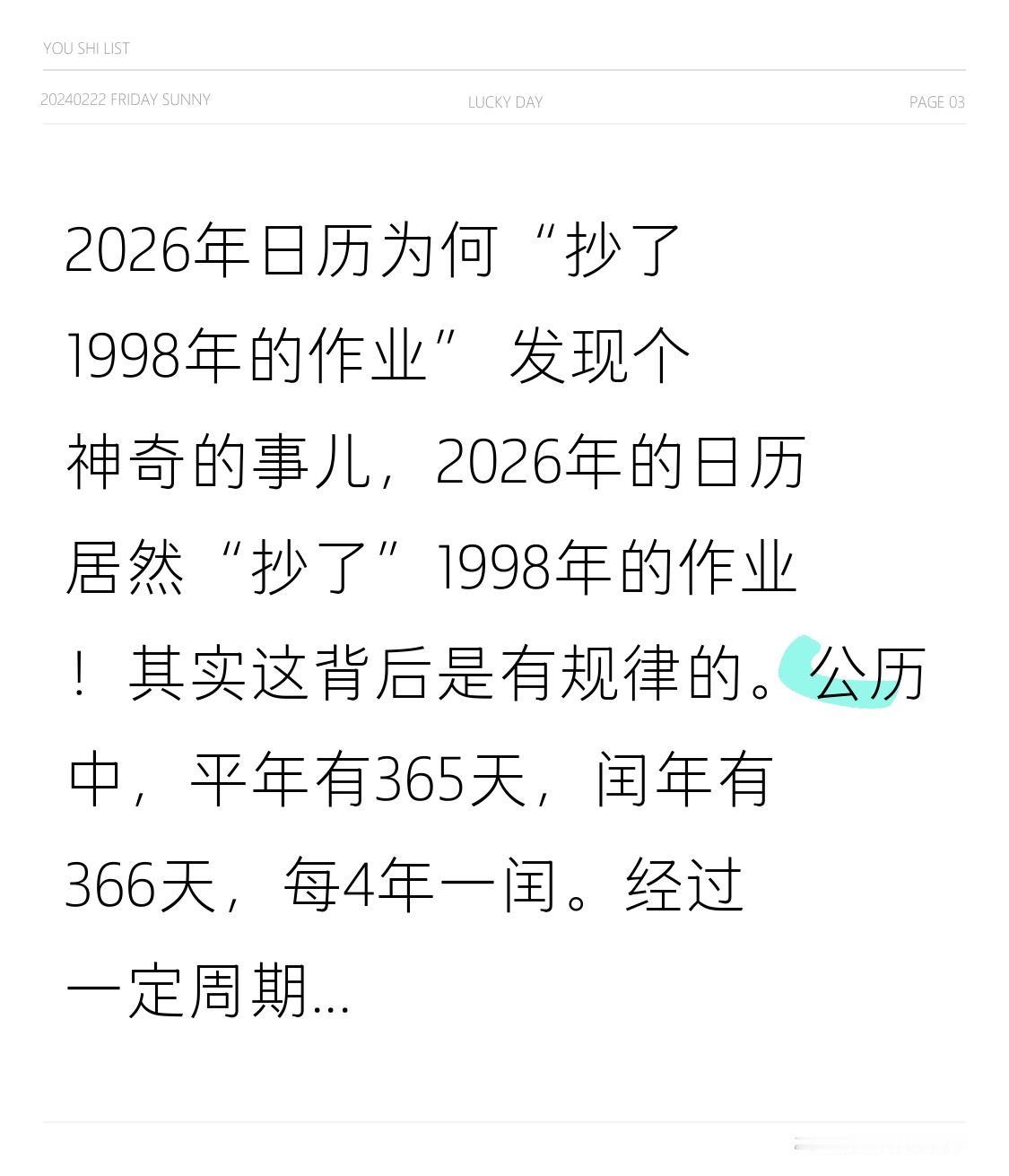2026年日历为何“抄了1998年的作业” 发现个神奇的事儿,2026年的日历居然“抄了”1998年的作业!其实这背后是有规律的。公历中,平年有365天,闰年有366天,每4年一闰。经过一定周期,日历就会重复。 1998年到2026年刚好28年,这期间经历了7个闰年和21个平年。28年的天数刚好是完整的星期数,所以日历就重合了。想想挺有意思,28年前的某一天和28年后同一天,日历一样,可生活却截然不同。说不定2026年看到日历,会勾起1998年的回忆呢。
