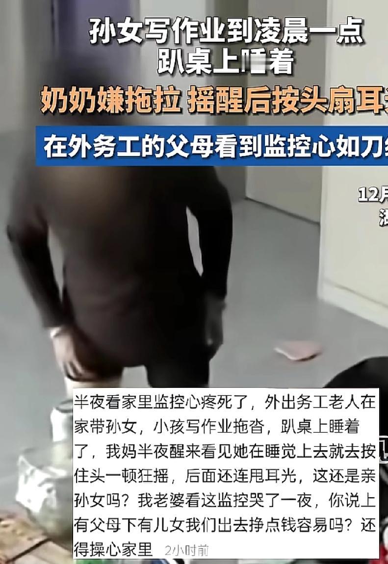 这奶奶太狠心了,作业没做又怎样,身体健康才是第一位的。还打孙女,我也是当奶奶的,根本舍不得动手。要是按她这样,那是不是每个人都能考上清华北大?考不上又该怎么办,难道就不活了? 我觉得,孩子尽力就行,健康才是最重要的。这么晚了还打孩子,会影响孩子睡眠。我儿子跟我说,他同桌学习特别努力,可就是学不会。我特别理解父母的心情,我以前自己开店做生意时,也顾不上孩子。有两次我在监控里,看到我妈在打孩子,把孩子在地上拖了好几圈,然后就是一顿猛打。孩子从沙发上起来,她又把孩子抽倒在沙发上,那种场景我真不敢相信是亲妈能干出来的。 冬天的时候,晚上七八点她自己要睡觉,就非得让孩子也睡。孩子睡不着,她就关了灯,吓唬孩子说猫来了、狼来了。后来孩子都不敢跟她一起睡了。 后来我就不做生意了,把店转了,找了份工作上班,自己管孩子,这样才放心!钱少点没关系,我不想让自己的儿子受委屈。
