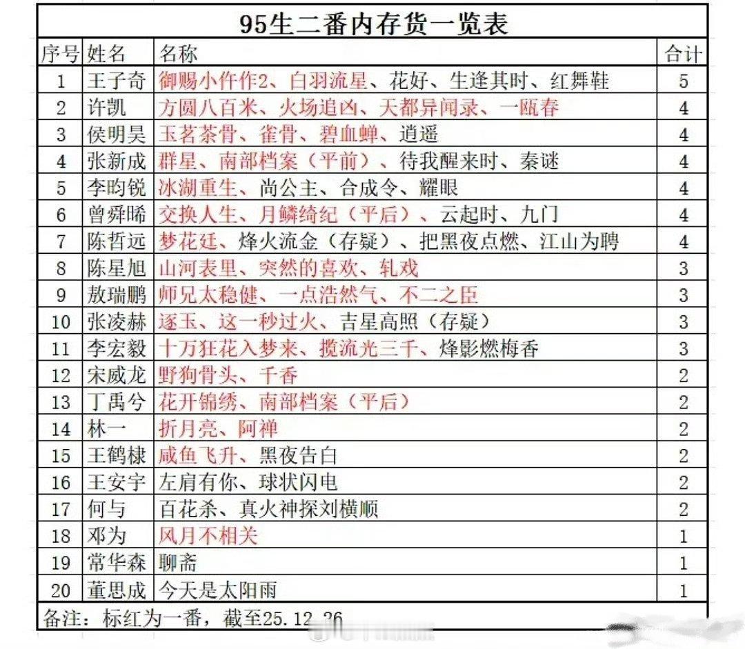 95生二番内存货数量:5部:王子奇4部:许凯侯明昊张新成李昀锐曾舜晞陈