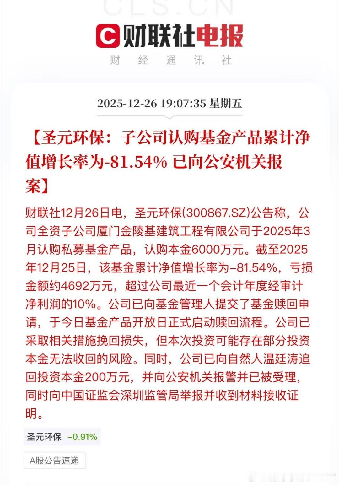 圣元环保:子公司认购基金产品累计净值增长率为-81.54%已向公安机关报案这哪个私募啊,3月至今,大牛市也能亏这么多吗