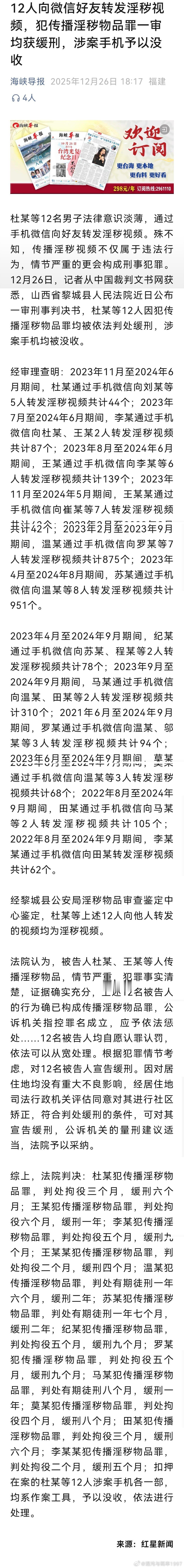 12人向微信好友转发淫秽视频,犯传播淫秽物品罪一审均获缓刑,涉案手机予以没收。还好我都不发 看都是被动的,其实我不想看
