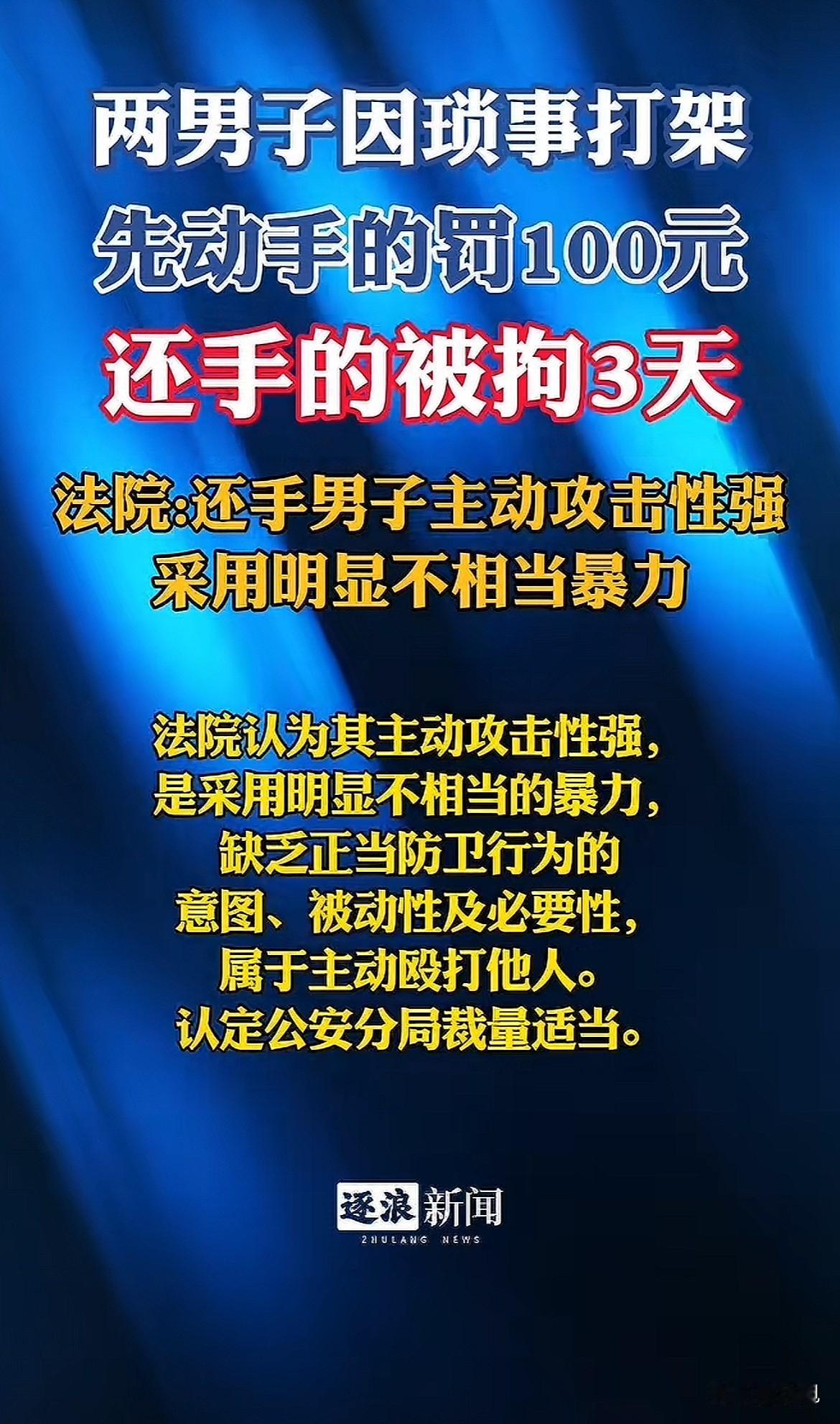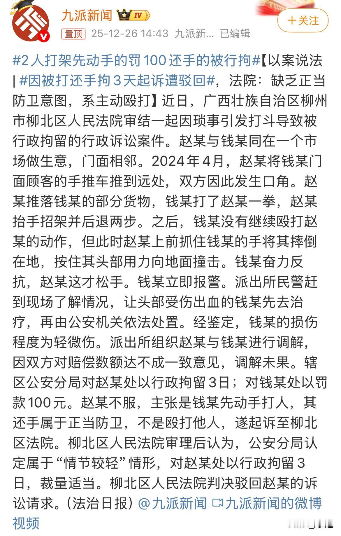 先动手的罚100,还手的却被拘3天! 在广西柳州的一个市场里,两个相邻门面的老板,赵某和钱某,因为一辆顾客的手推车吵了起来。赵某把车推走,钱某不乐意,两人从口角升级到了动手。 冲突一开始是推推搡搡。赵某先推落了钱某的部分货物。这下钱某急了,上去就给了赵某一拳。挨了一拳的赵某,当时抬手挡了一下,还往后退了两步。到这里,如果钱某停了手,或者赵某选择离开,事儿可能也就过去了。 但事情没往这个方向发展。钱某打完那一拳后,确实没再继续打。可就在这个空当,赵某突然冲了上去。 接下来的动作,彻底改变了这件事的性质。赵某抓住钱某的手,一把将他摔倒在地。这还不够,在钱某已经被制服、无法反抗的情况下,赵某按住他的头,用力往地上撞了好几下。钱某只能拼命挣扎,赵某这才松手。 等警察赶到时,钱某头上已经见了血,只能先让他去治伤。后来鉴定出来,是轻微伤。派出所试着给两人调解,但因为赔多少钱谈不拢,没调成。 最后的处罚结果,让很多人没想到:先动手打了一拳的钱某,被罚款100元。而后来动手的赵某,被行政拘留3天。 赵某当然不服。他觉得是对方先动的手,自己还手是天经地义的正当防卫,怎么就成了殴打他人,还要被拘留?他一纸诉状,把公安局告上了法院。 法院的判决书,把道理讲得很透。法官认为,问题的关键,就在于钱某打完那一拳之后,赵某还手的性质。 法院指出,在钱某停止攻击的那一刻,对赵某的现实、紧迫的不法侵害其实已经停止了。赵某本可以选择躲避、离开或者报警。但他没有。 他选择的,是立刻冲上去反击。而且,他的反击动作——把人摔倒在地后,还按住头猛撞地面——被法院认定为“主动攻击性强”,是“采用明显不相当的暴力”。这已经超出了防卫的必要限度,失去了防卫的意图,变成了主动的殴打。 正因如此,他的行为不属于正当防卫。考虑到双方都有过错,且钱某只是轻微伤,后果不算严重,公安机关认定赵某的情节较轻,拘留3天的处罚是适当的。最终,法院驳回了赵某的诉讼请求。 这个案子之所以让人讨论,是因为它戳中了很多人的一个直觉:“他先打我,我凭什么不能还手?”法院的判决,其实是在给这个直觉划出一道清晰的法律红线。 还手,不一定是正义的。当对方的侵害已经停止,危险已经解除,你再冲上去“算账”,性质就变了。法律上的正当防卫,是为了制止侵害,而不是为了报复或斗殴。 回过头看市场里那短短几分钟,赵某从最初的推车、推货物有过错,到挨了一拳后本可抽身却选择暴力还击,每一步都在把事态往更坏的方向推。而钱某,虽然因为先动手被罚了款,但对方后续更严重的暴力,反而让他成了需要报警的受害者。 冲动是魔鬼,当冲突发生时,冷静下来,判断侵害是否真的还在继续,或许比本能地挥拳更重要。因为法律保护的,是制止不法侵害的行为,而不是升级冲突的报复。