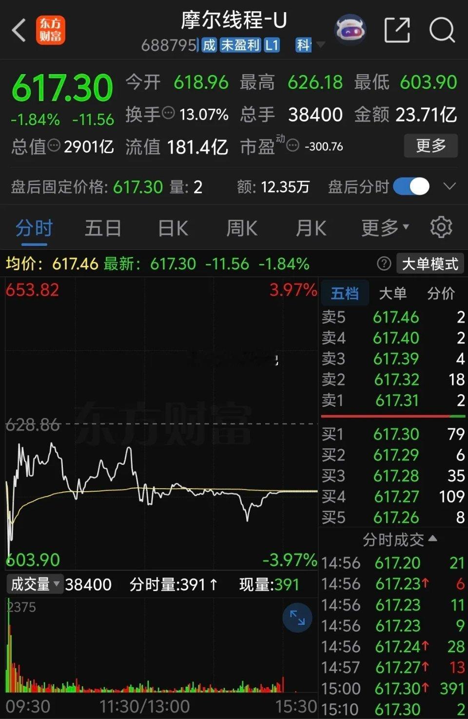 摩尔线程低开1.57%后惨烈跳水暴跌3.97%,大量恐慌盘纷纷割肉,股价直逼600关口创本轮下跌新低,今天如果不是因为600整数关口支撑可能暴跌会更加惨烈,神奇的是接近600关口后抄底资金涌入股价很快出现快速反弹,但是并没有翻红上涨,买入资金还是不敌割肉盘,好几次都是冲高回落,振幅比前段时间小了很多,成交额仅23.71亿创上市以来新低,昨天十字星没有起来,今天十字星也没有起来,人气进一步走弱,感觉下周真的很可能会跌破600关口然后去试探上市最低价556,到时候可能会有很多资金涌入抄底,追高股民惨不忍睹。