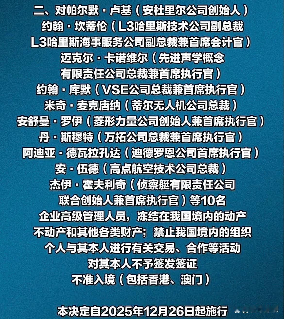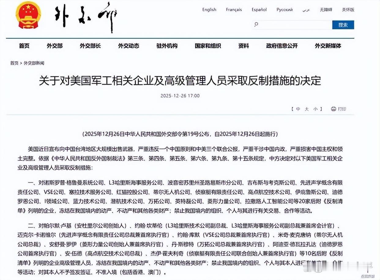 12月27日,据央视新闻客户端报道,12月26日,中国🇨🇳外交部依据《中华人民共和国反外国制裁法》发布重磅反制决定,针对美国近日大规模对台军售挑衅行径,决定对美国20家军工企业及10名高管实施严厉制裁,以铁腕捍卫国家主权与领土完整。 评论,当年中美关系正常化时,美国规定逐步减少对台军售,直至停止。 美国总统特朗普不但没有减少,反而比历届总统增加了数倍对台军售。 因此,中国🇨🇳反制理所当然的。[赞][赞][赞][赞][赞][赞]