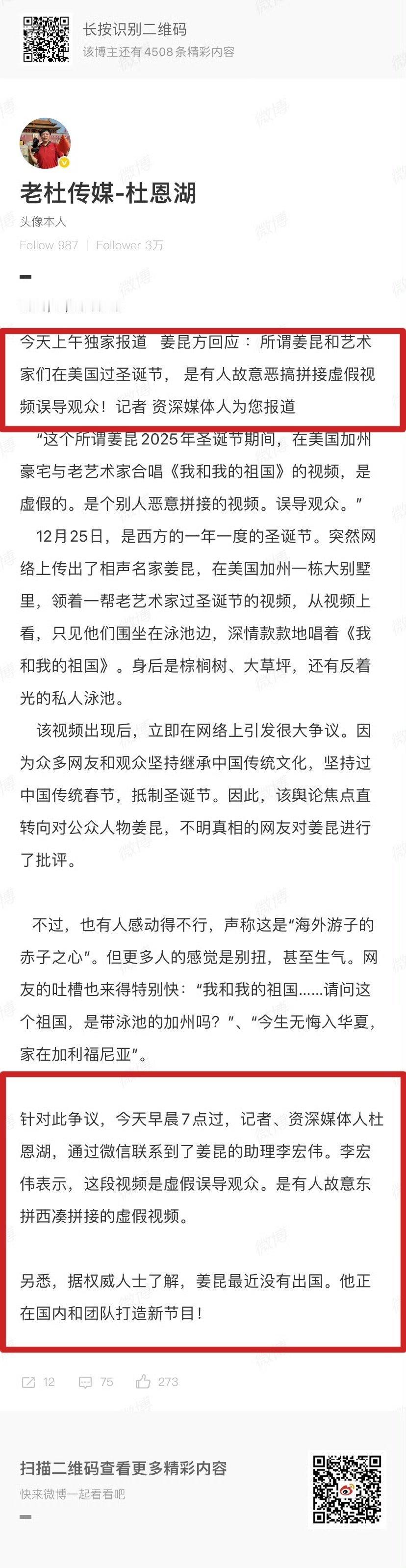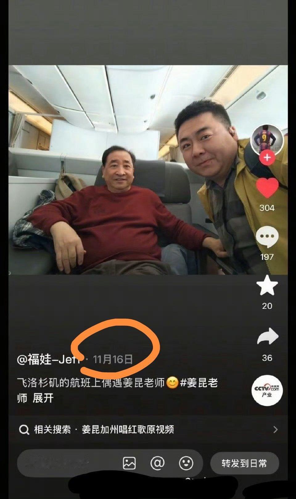 这事越来越有意思了!原视频拍摄者自己说了是19日在美国拍的……姜昆方说视频是拼接的否认自己近期出过国……然后有粉丝上月在飞美国的航班上遇到姜昆了……到底谁在撒谎?热点观点姜昆方否认在美国过圣诞