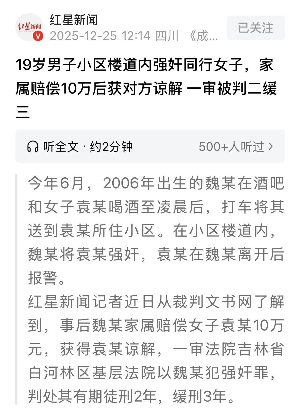 ①小伙子犯下强奸罪,家里赔了10万,获得“谅解书” ②小伙子犯下强奸罪,获刑2年缓刑3年,但污点将永远背进棺材 ③小伙子在这三年里若再犯错,还得去坐牢,这一辈子就永远毁了 真是一失足成千古恨恨呀。 大家可以展开讨论,发表发表个人意见