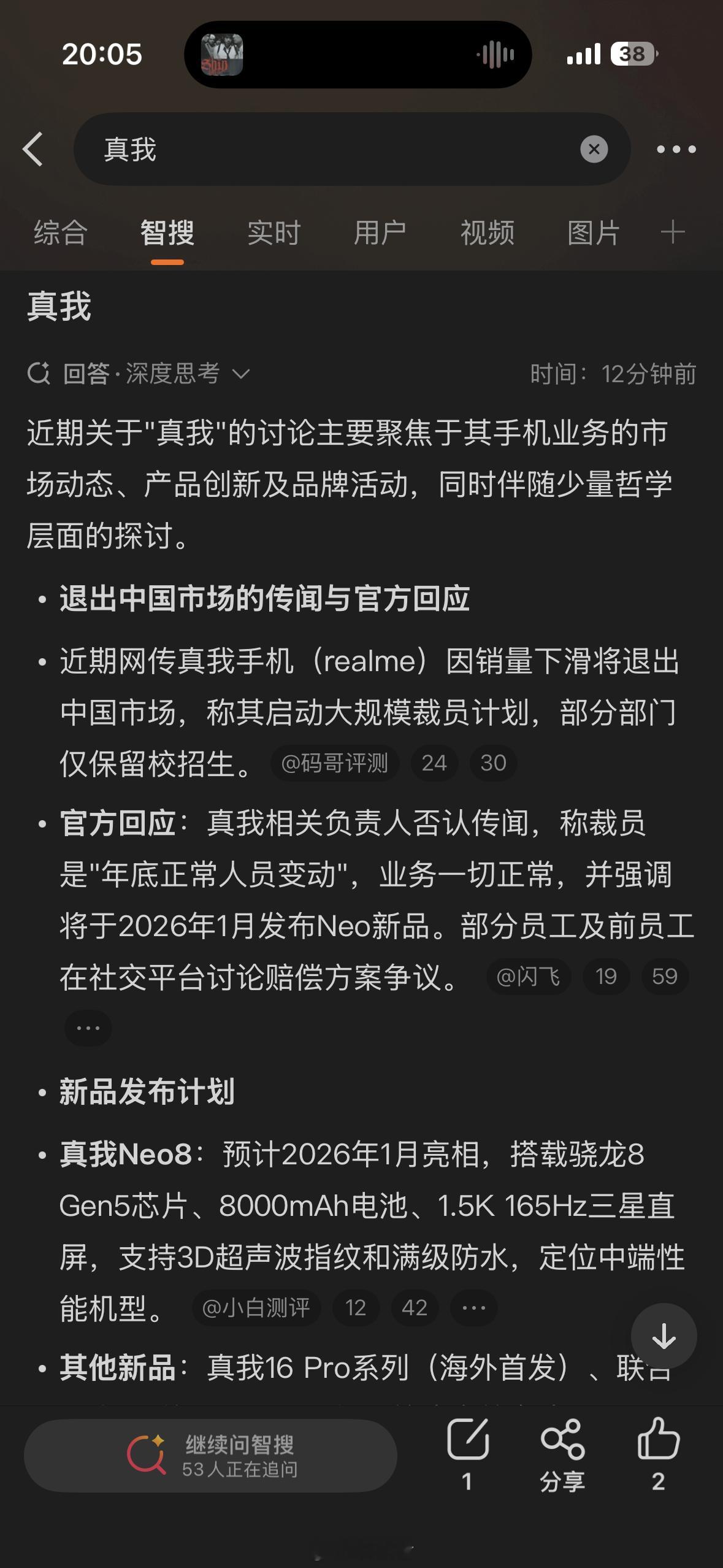 真我相关负责人称裁员是"年底正常人员变动",业务一切正常,并强调将于2026年1月发布Neo新品。都别造谣了~,但是希望相机加强一下