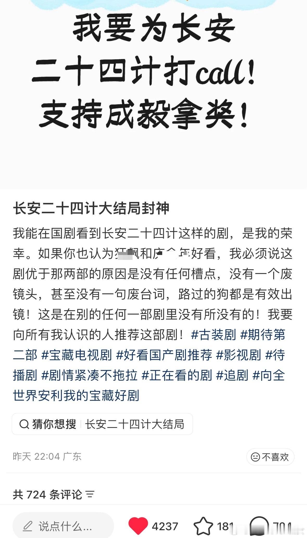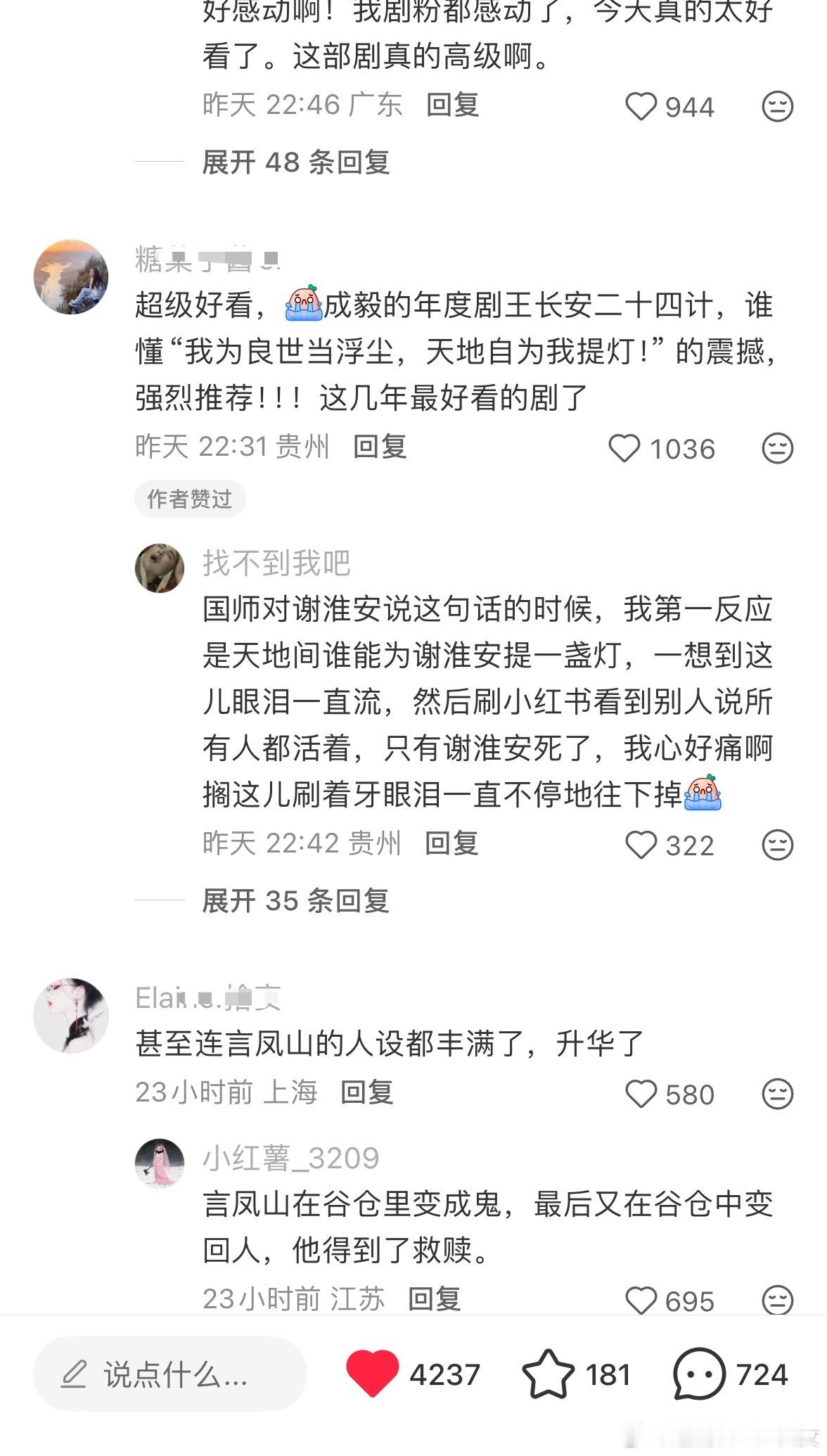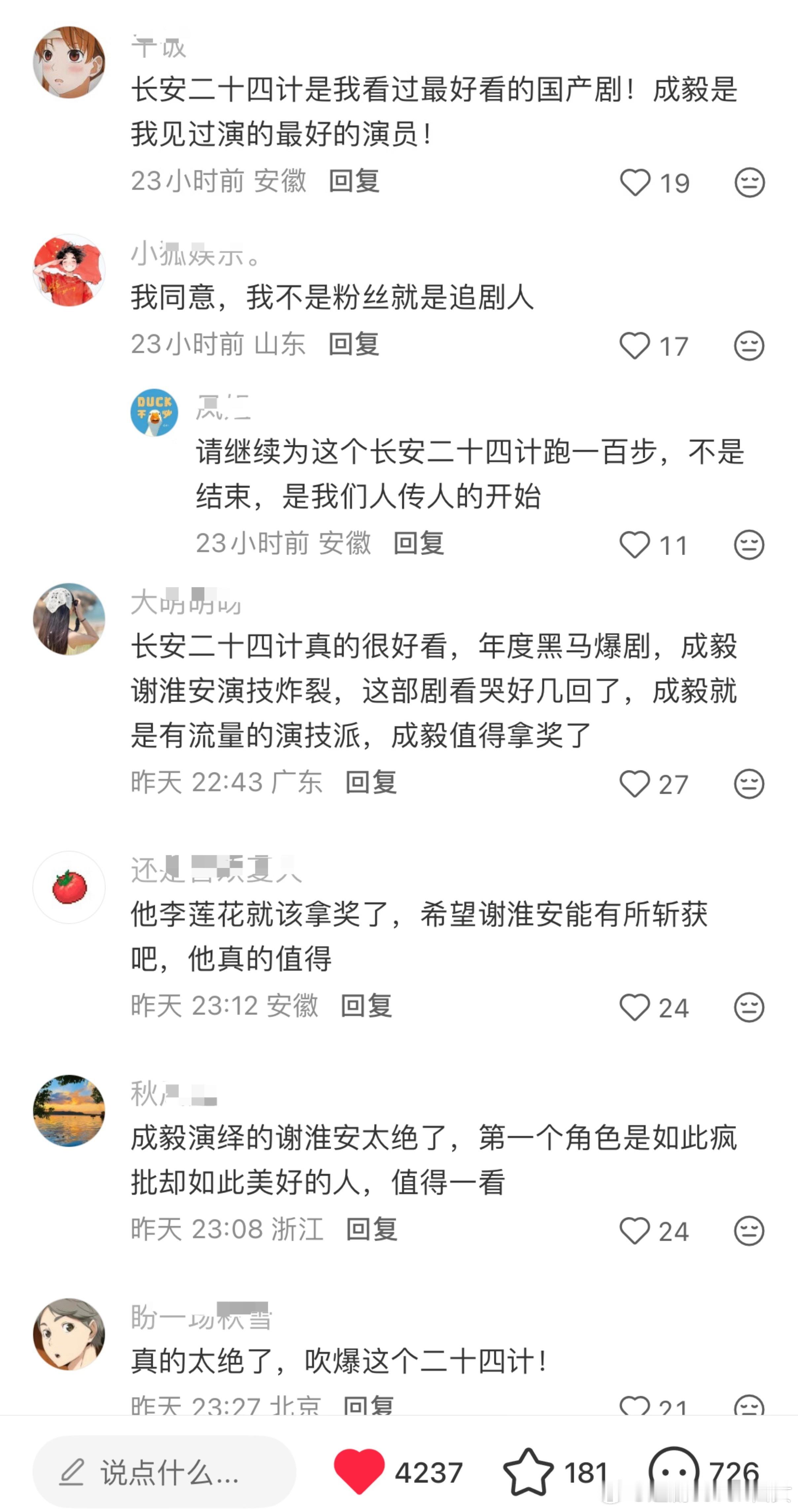 长安二十四计的路人剧粉真的是直接夸的,大结局后观众都直接给至少9分甚至满分,无论从质感,演技,剧情,配乐,美术,服道等全方位无可挑剔,甚至都不敢相信这是内娱能做出来的原创作品,整个作品太震撼了!成毅惊为天人的演技,演绎的太完美了,被观众夸这部剧定海神针,观众夸此男是神,有莲花楼这种令人叹为观止的作品后居然还有拿出更为精彩的演绎,塑造出这么满分的谢淮安。走不出的陈家谷口,走不出的雪夜刘府,更走不出的长安二十四计。不论是剧的质量,还是创作者的态度,作为观众都能感受到被尊重,尤其是在长剧产业寒冬,长安二十四计完全是提振行业信心的一部作品,给苦苦挣扎的从业者一支强心针,长安二十四计值得满分