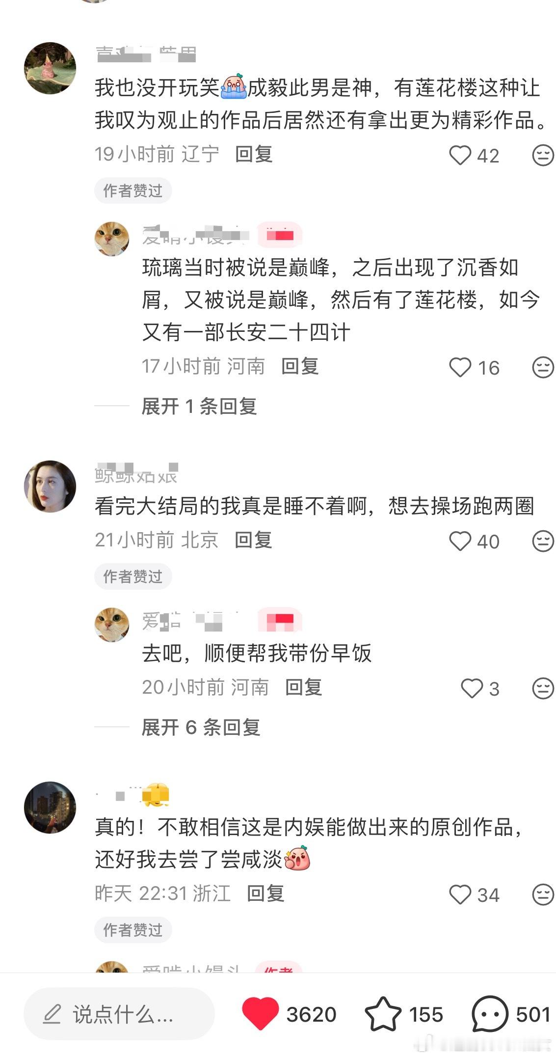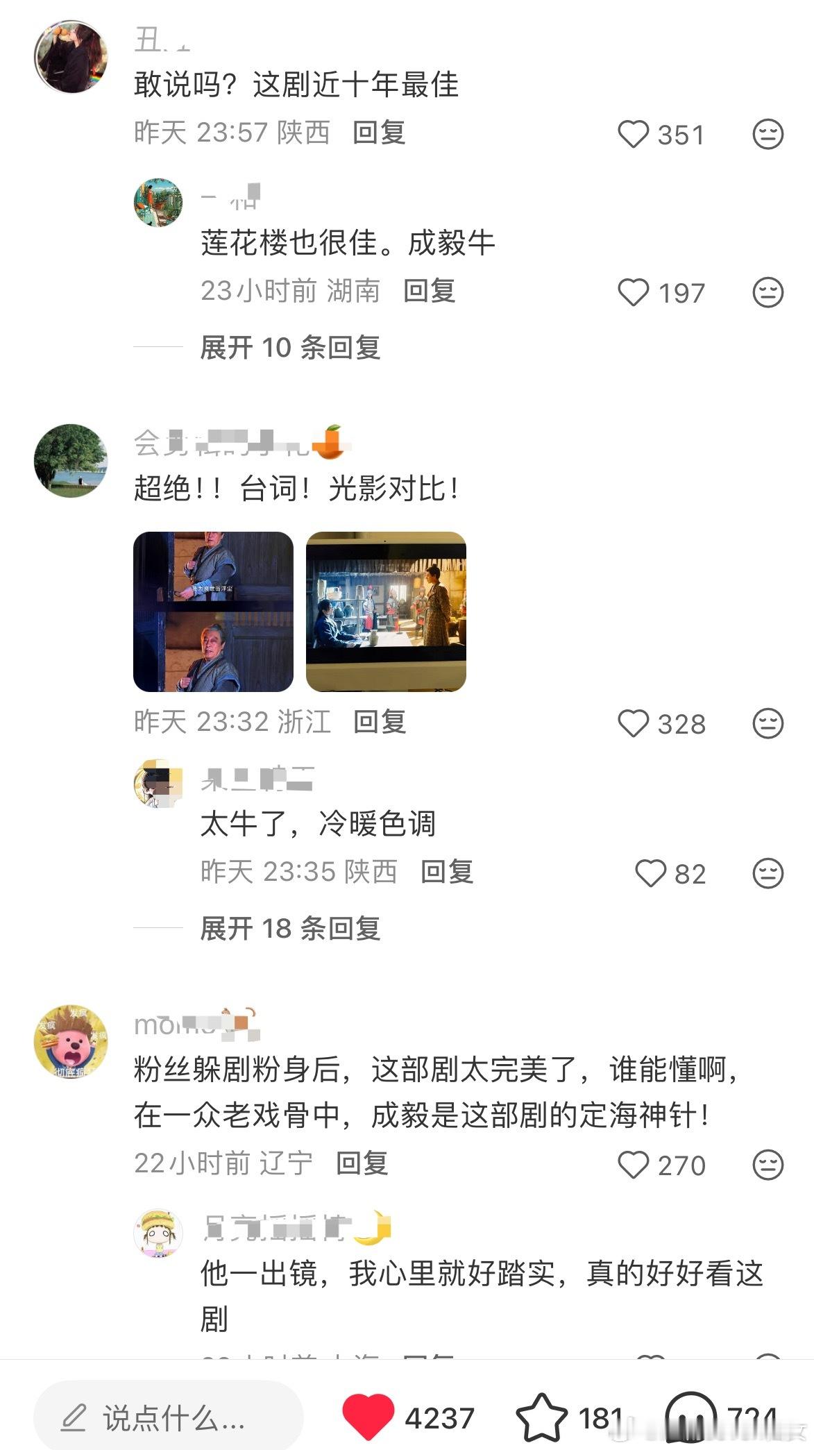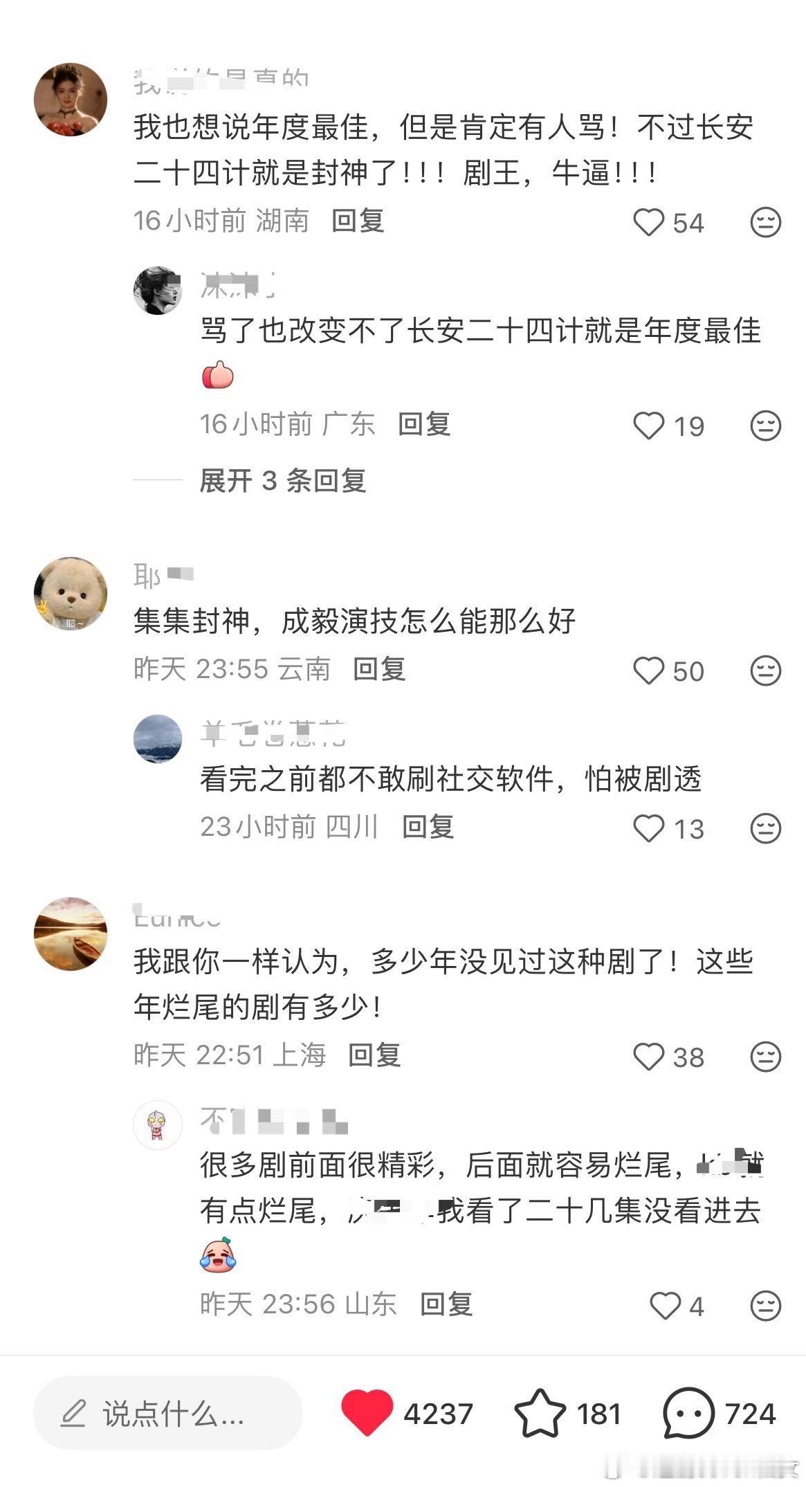 长安二十四计的路人剧粉真的是直接夸的,大结局后观众都直接给至少9分甚至满分,无论从质感,演技,剧情,配乐,美术,服道等全方位无可挑剔,甚至都不敢相信这是内娱能做出来的原创作品,整个作品太震撼了!成毅惊为天人的演技,演绎的太完美了,被观众夸这部剧定海神针,观众夸此男是神,有莲花楼这种令人叹为观止的作品后居然还有拿出更为精彩的演绎,塑造出这么满分的谢淮安。走不出的陈家谷口,走不出的雪夜刘府,更走不出的长安二十四计。不论是剧的质量,还是创作者的态度,作为观众都能感受到被尊重,尤其是在长剧产业寒冬,长安二十四计完全是提振行业信心的一部作品,给苦苦挣扎的从业者一支强心针,长安二十四计值得满分