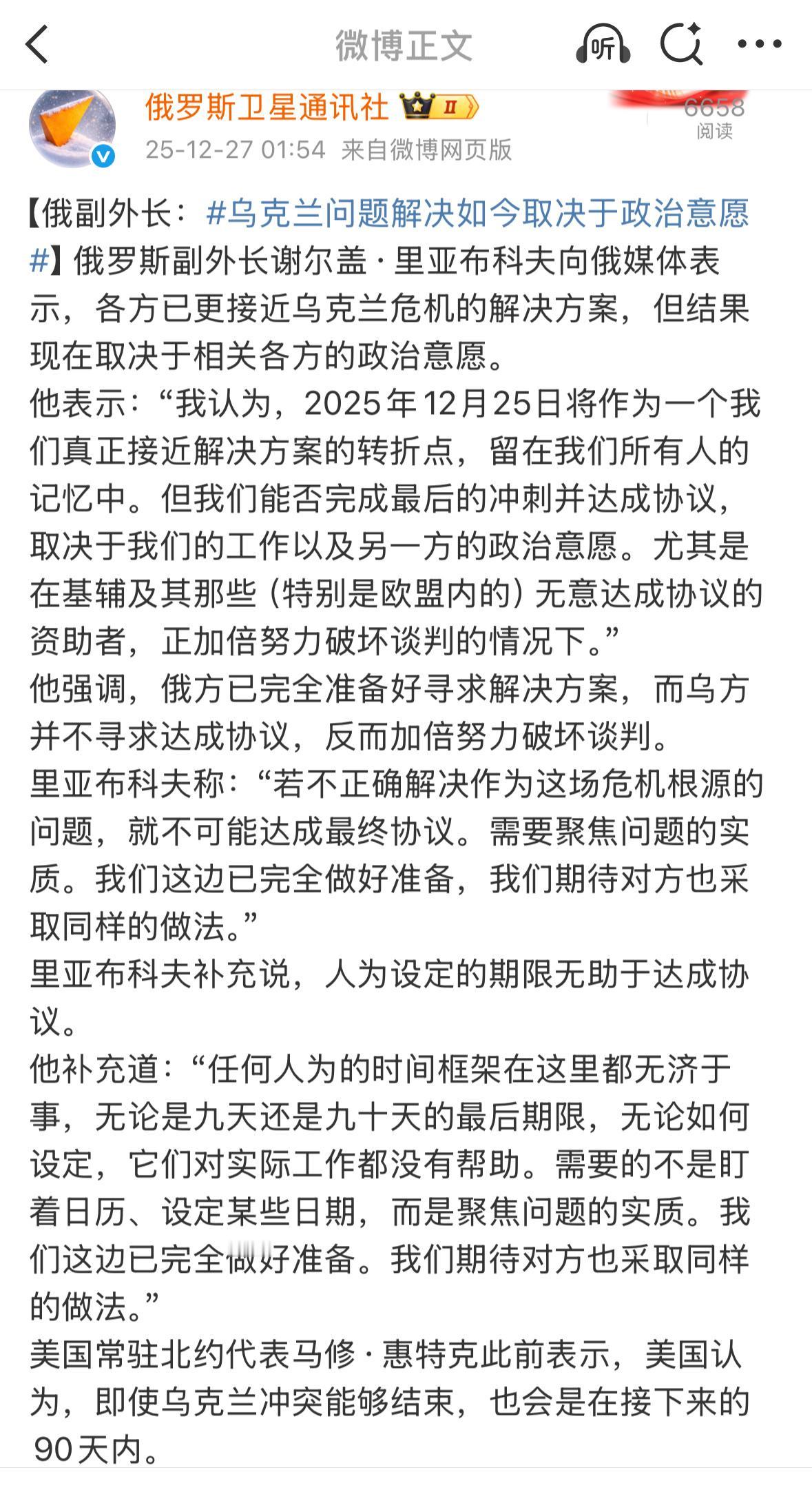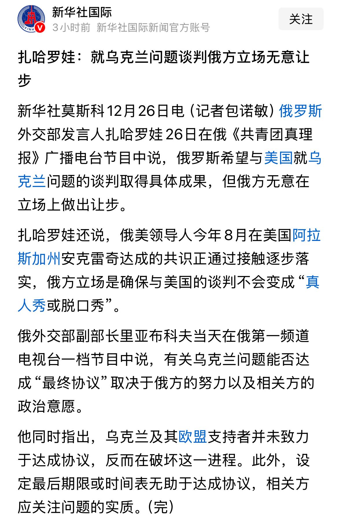 俄罗斯无意让步,只要乌克兰还想着融入欧洲,这场战争就不会停下。俄罗斯外交部发言人扎哈罗娃表示,“俄罗斯希望与美国就乌克兰问题的谈判取得具体成果,但俄方无意在立场上做出让步”。 在同一天,俄罗斯副外长谢尔盖·里亚布科夫也向媒体表示,“各方已更接近乌克兰危机的解决方案,但结果现在取决于相关各方的政治意愿”。 俄罗斯认可的解决方案只有特朗普最初提出的“28点计划”。个人觉得,这个很好理解。特朗普最初的计划是以俄罗斯的条件为基础的,它不仅承认了俄罗斯的新领土,削减了乌克兰的军队,更规定了乌克兰要恢复俄语和东正教,这对俄罗斯尤其重要。 俄乌冲突的根源是乌克兰要脱离俄罗斯融入欧洲。俄乌停战的基础是,乌克兰放弃融入欧洲。俄罗斯的条件已经放在桌面上很久了,就算乌克兰不能像白俄罗斯一样亲俄,但至少也要在俄罗斯与欧洲间保持中立,只要恢复了俄语和东正教,选出亲俄的政府,早晚还会回到俄罗斯的怀抱。只要和平计划是以乌克兰融入欧洲为基础,俄罗斯就不可能同意。