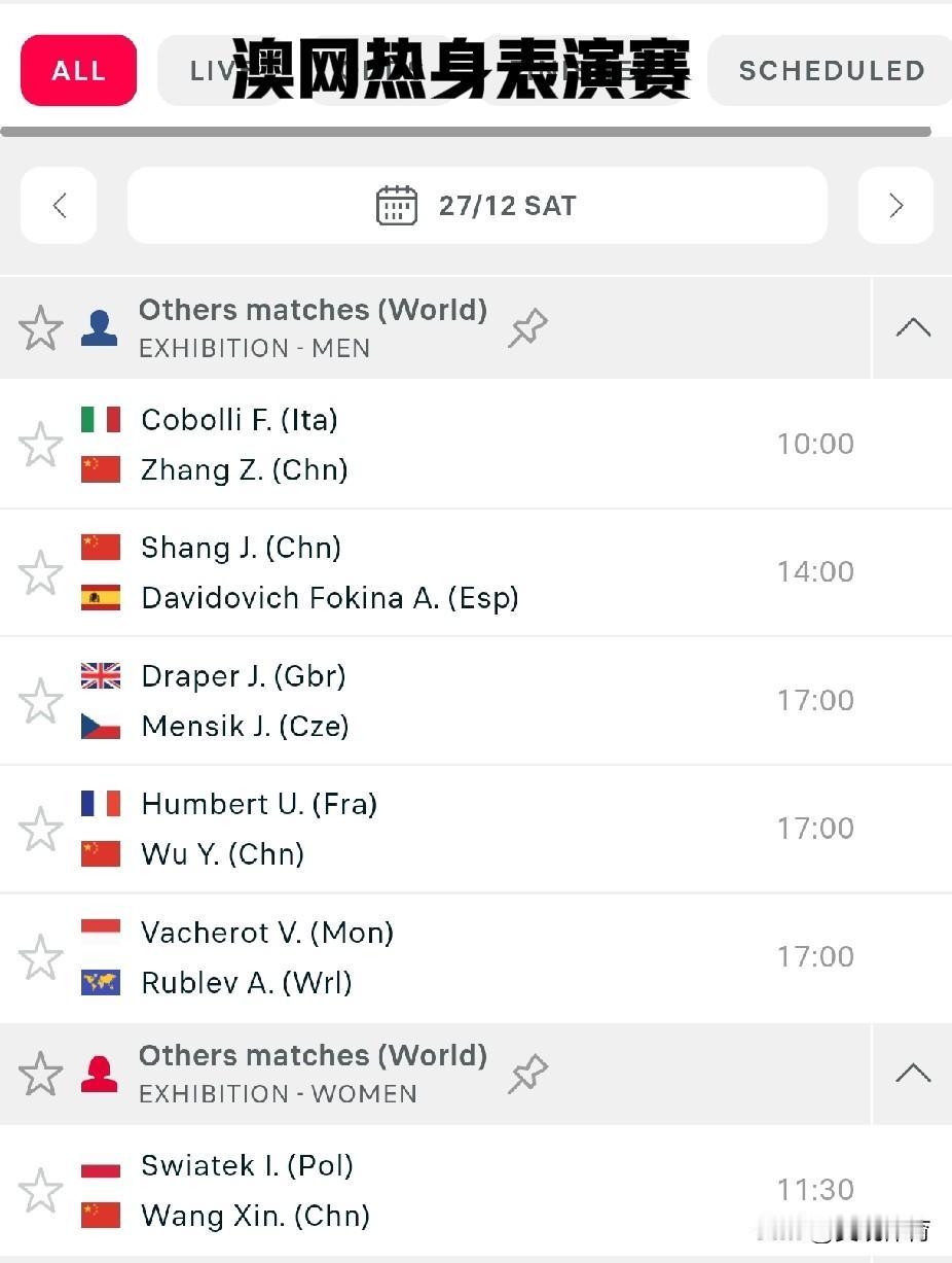 澳网热身赛:中国网球选手赛程 (北京时间,2025-12-27) 早10:00,