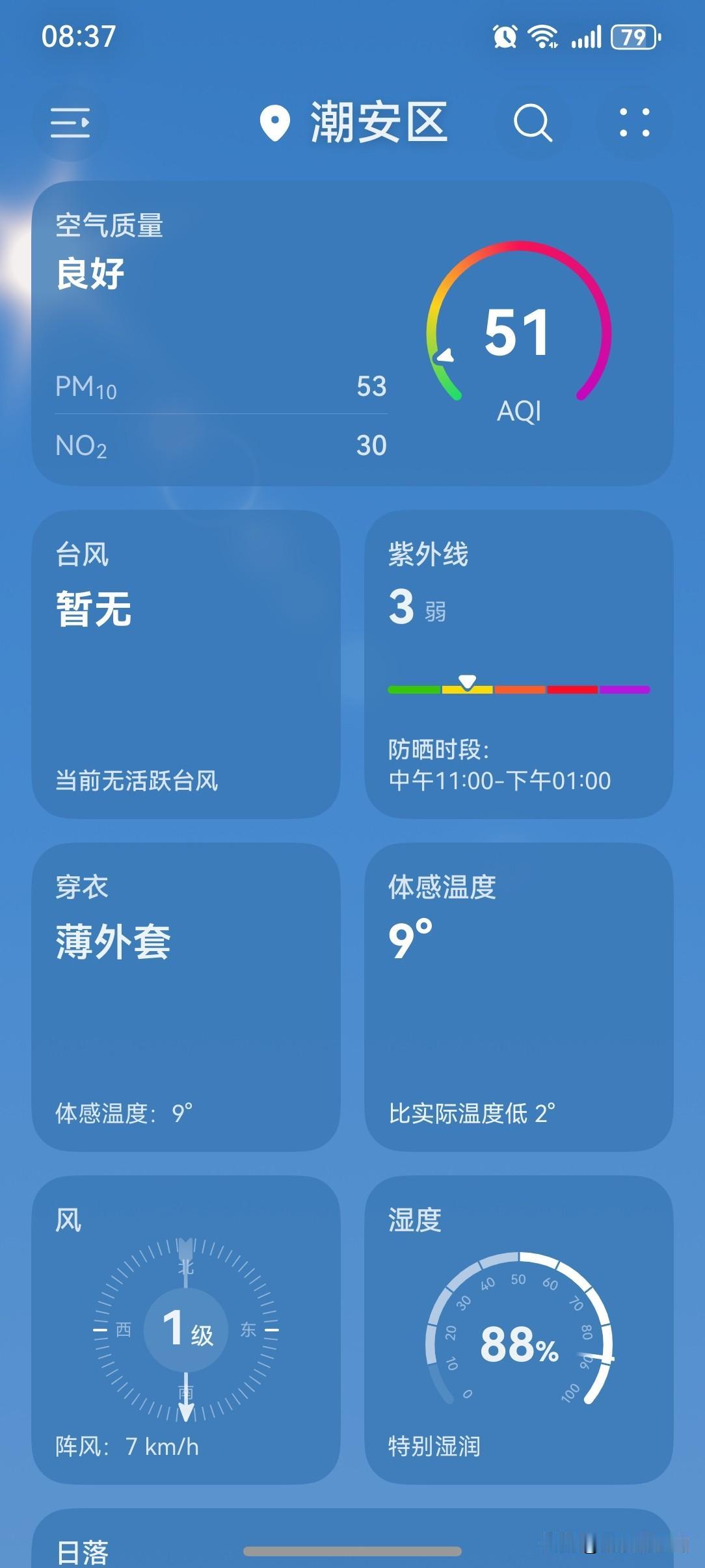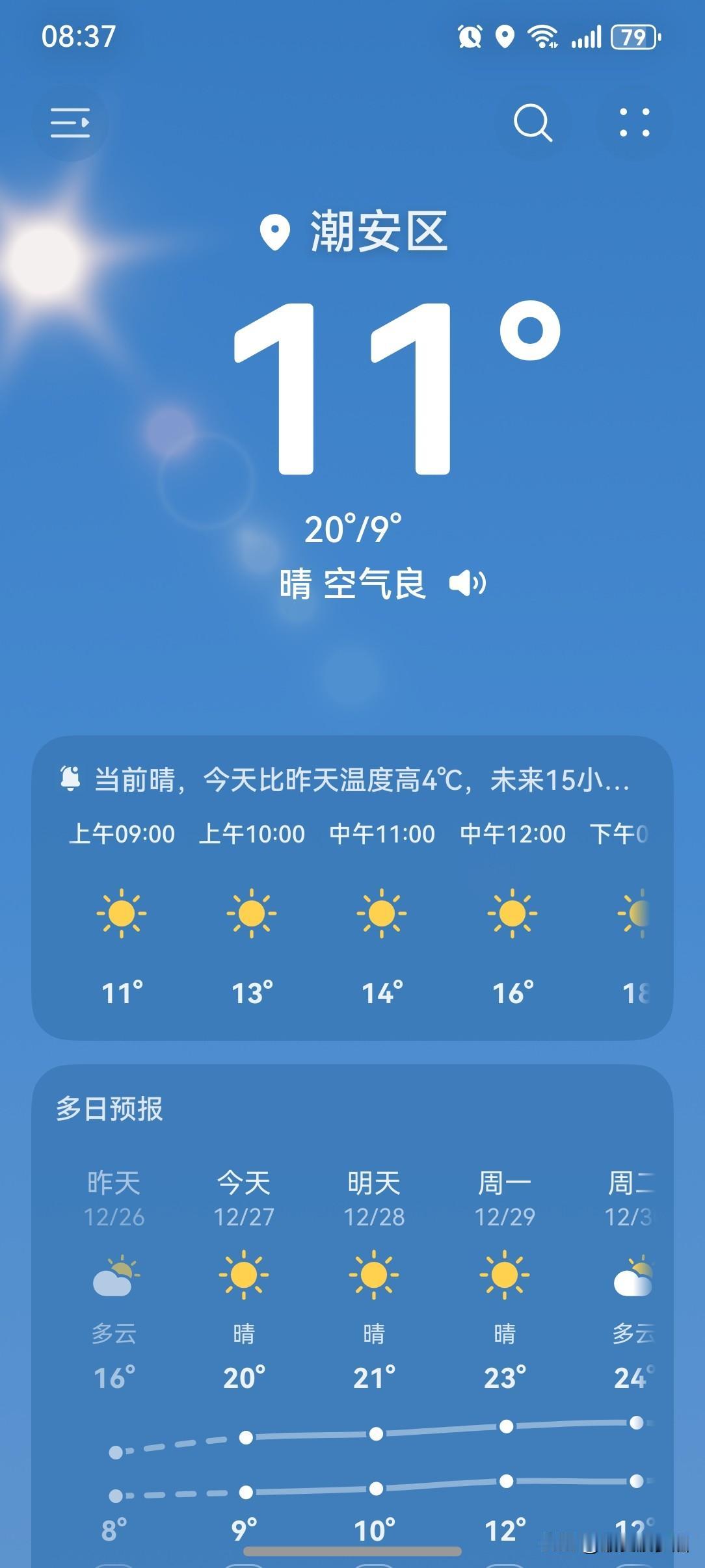 广东:冷空气余威仍在发力!今天(27日)早晨,广东还是比较寒冷的。 27日白天到29日,我省晴到多云,气温逐渐回升,早晚还需注意防寒保暖。 今天(27日),潮州喜提大好晴天,气温9~20℃,此刻气温11℃,体感温度9℃。 看看今天的天空!阳光普照,昨日的阴冷气息一扫而光,总算是来了解冻时刻啦! 早上有了阳光的加持,感觉没有昨天那么冷。只要有太阳,气温就会回升得比较快。 周末阳光已上线,宝子们!户外活动安排起来!