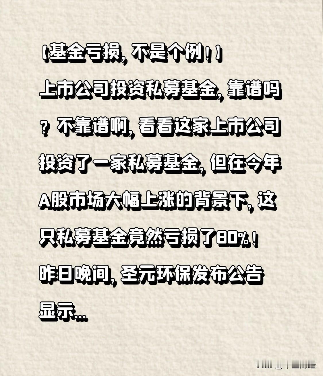 【基金亏损,并非个例!】上市公司投资私募基金,靠谱吗?显然不靠谱,瞧瞧这家上市公司,投资了一只私募基金,可在今年A股市场指数大幅上扬的背景下,这只基金竟亏损了80%! 昨日晚间,圣元环保发布公告称,其下属全资子公司认购的私募基金产品大幅亏损,该基金累计净值跌幅超81%,亏损额约4692万元,超过公司年净利润的10%! 好家伙,这只私募基金着实差劲!实际上,这也反映出A股市场结构性风险的严峻态势。并非指数上涨就能带来投资收益,相反,大幅的下跌,足以让众多私募基金亏损出局! 擦亮双眼吧,并非所有基金都能盈利,亏损的也不在少数!上述私募基金亏损绝非个例!