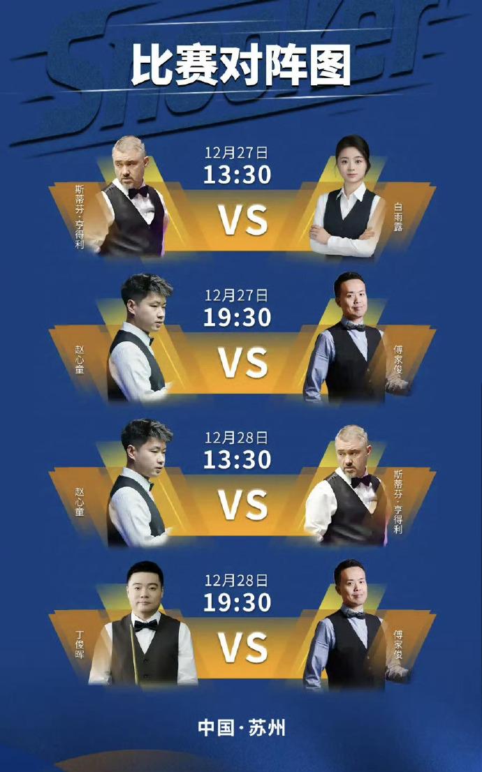 斯诺克:CBSA苏州斯诺克大师邀请赛(表演赛)今天开打! 今天13:30,白雨露对阵偶像亨德利, 19:30,赵心童对阵傅家俊!丁俊晖明天出场。