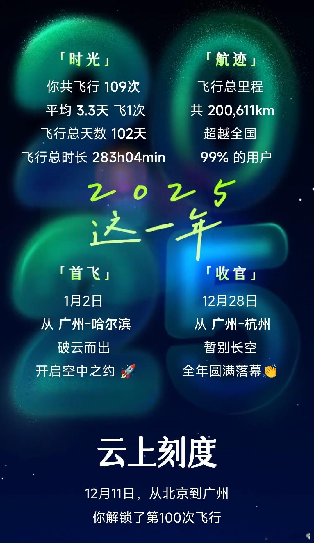 2025年飞了109次,102天,平均3.3天飞一次 强度拉满了啊!