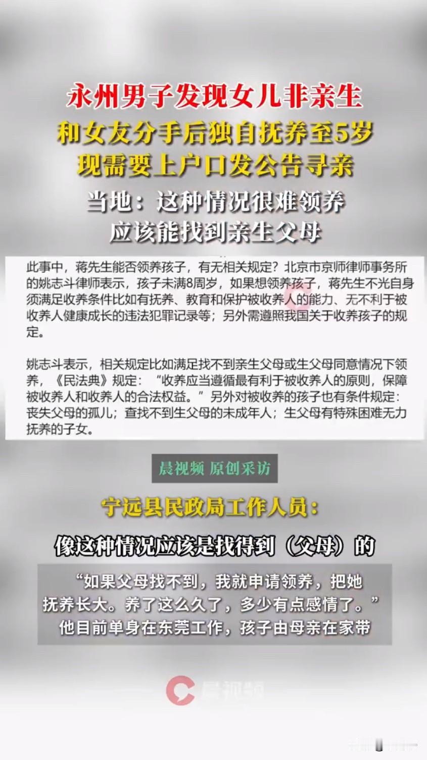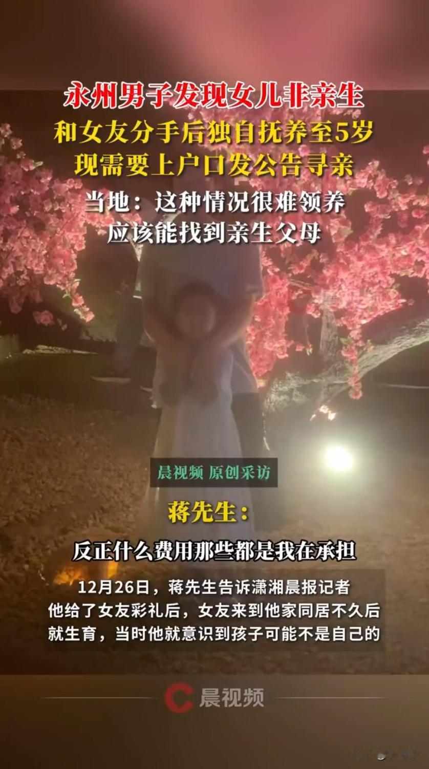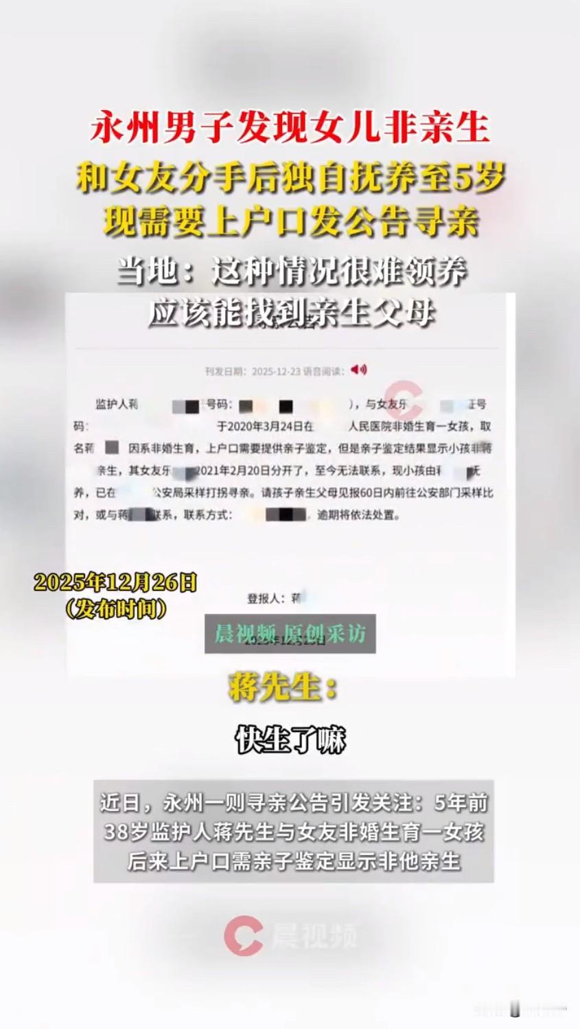 湖南永州最近有个事儿让人看了又感动又揪心,38岁的蒋先生拿着一纸寻亲公告找人,要找的不是别人,正是自己养了五年的小女孩的亲生父母,蒋先生和孩子妈妈是同县老乡,两家离得不远,当初经人介绍认识的时候,女方刚结束一段外地的感情,家里想让她嫁得近点踏实过日子,蒋先生挺上心,按当地习俗给了彩礼,两人没办婚礼也没领证,就这么同居在了一起。 同居才半年左右,女方就生下了一个女婴,那时候蒋先生心里就犯过嘀咕,觉得相处时间太短,孩子可能不是自己的,但看着嗷嗷待哺的小家伙,他还是没多想,一门心思照顾母女俩,可好景不长,因为女方还和前男友有联系,再加上一些家庭矛盾,没过多久两人就闹掰了,女方干脆利落地带走了所有联系方式,从此杳无音信,蒋先生曾跑到女方家找过,对方父亲只说女儿外出了,既没人来接走孩子,当初给的彩礼也没退回,他没办法,只能自己扛起抚养孩子的担子。 这五年里,蒋先生一直单身,为了赚钱养家,他常年在广东打工,孩子就交给老家的母亲帮忙照看,眼看着孩子到了该上小学的年纪,没户口可不行,他才赶紧去派出所办手续,没想到按规定必须做的亲子鉴定,硬生生捅破了他当年的猜测——孩子确实和他没有血缘关系,这个结果没让蒋先生放弃孩子,反而更着急给她办户口、找归宿,于是就有了那则寻亲公告,上面写着请孩子的亲生父母在规定时间内来采样联系,要是逾期没来,就只能依法处置。 蒋先生说,养了这么久早就有感情了,要是真找不到孩子的亲生父母,他就申请领养,一定把孩子抚养成人,可事儿没那么简单,当地派出所工作人员告诉他,孩子现在没法上到他的户口上,只能先上镇里的集体户口,而登报寻亲是办集体户口的必经程序,民政部门那边也给出了回应,说孩子的亲生父母按理说应该能找到,他们这种不愿抚养的行为可能涉嫌遗弃,就算要送养,也得优先考虑孩子的亲生亲属,不能直接送给蒋先生这样非婚未育的人。而且异性领养还有年龄相差40岁之类的规定,蒋先生的情况想顺利领养,难度确实很大。 律师也说了,收养得遵循“最有利于被收养人”的原则,蒋先生不光得证明自己有抚养能力、没不良记录,还得等确认找不到孩子亲生父母才行。现在大家都在盼着孩子的亲生父母能主动出现,要么承担起抚养责任,要么好好协商孩子的未来。而蒋先生这五年不求回报的养育,明明没有血缘关系,却始终没丢下孩子,这份超越血缘的责任感,让不少人都为他点赞。寻亲 寻亲小孩 来源:晨视频