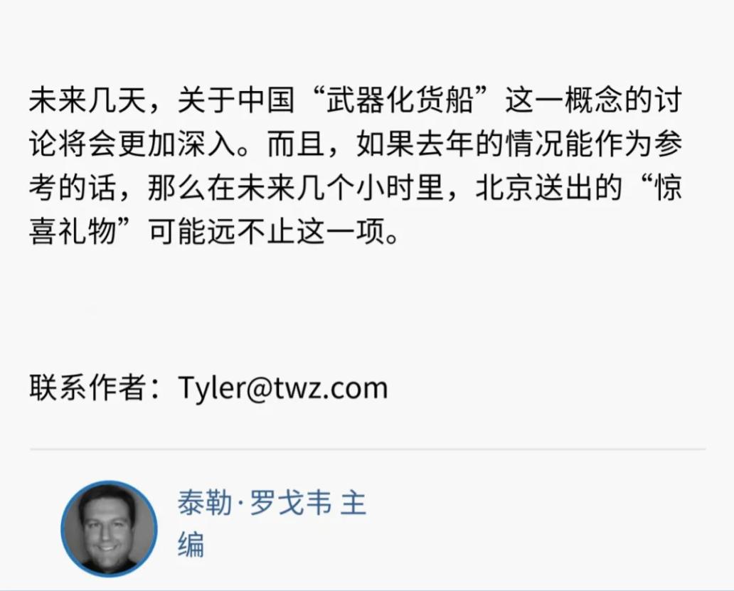 美媒:中国武装货船现身,配备60个垂发单元,中国还会有“圣诞惊喜”。美国《战区》网站报道称,中国一艘中型货船上,出现了大量的火力单元,包括舰桥前方安装了,一个大型旋转相控阵雷达,以及另一个穹顶雷达或通信系统,在舰艏附近还出现了一座 1130 型 30 毫米近迫武器系统(CIWS),用于对付来袭威胁,尤其是巡航导弹的最后防御。 不得不说,美国人的焦虑是真的。他们算过一笔账:这艘船的60个发射单元,理论上能装60枚鹰击-18反舰导弹,齐射威力相当于三分之二艘伯克级驱逐舰。 更让他们睡不着的,是中国手里的"造船密码"——2023年全球60%的新船订单在中国,美国连1%都不到。 战时动员起来,8000艘商船随便改个零头,就是支能发射几千枚导弹的"海上游击队"。 这种"民船变武库"的剧本,美国人自己想了十年都没敢拍,中国却在黄浦江里搭出了片场。 可军事逻辑不是算术题。货轮天生的短板摆在那儿:18节的航速追不上驱逐舰,光秃秃的甲板藏不住雷达波,60个发射单元打光了就得回港装填——真当打仗是打游戏换弹夹? 历史上的武装商船巡洋舰,比如英国"卡纳德轮船公司"的改装船,二战时被德国潜艇击沉了20多艘,血的教训写着:民船改军舰,天生是脆皮。 中国军工再缺钱,也犯不着把导弹往货轮上堆——055大驱的垂发单元都空着俩坑呢,犯得着跟货轮较劲? 美国人选择性忘记的是,他们自己才是"集装箱导弹"的祖师爷。 2019年DARPA就搞过"导弹货船"项目,往标准集装箱里塞"战斧"导弹,还在圣迭戈港演过"即插即用"的好戏。 现在中国把类似概念做成模型,他们就跳脚说"破坏海战规则"。这种双标背后,是对中国工业执行力的恐惧。 同样的图纸,美国造船厂要三年憋不出一艘护卫舰,中国能在三个月内把模型船焊出来,还顺带把雷达、近防炮、垂发系统的接口都标准化了。 更有意思的是船上的标语。"海洋复兴"几个大字,像极了航展上的概念模型说明牌。 军事专家扒过细节:雷达罩用的是玻璃钢仿真件,垂发单元的导轨没有火药灼烧痕迹,连近防炮的供弹链都是塑料做的。 这哪是实战装备,分明是给潜在客户看的"模块化火力解决方案"——就像车企展示可拆卸的SUV改装套件,告诉买家"我这车能拉货能越野,看你需要哪种配置"。 但美国人最怕的不是这艘船,而是藏在船背后的"军民转换按钮"。 2024年武直-10在民船上起降的视频,已经让他们见识了民用平台的军事潜力。 现在这艘货轮,相当于把"直升机甲板"换成了"导弹发射场",证明中国真的能把"战时动员"从口号变成实操。 想想看,台海冲突时,一艘挂着巴拿马国旗的货轮突然在高雄外海展开垂发系统,这种"薛定谔的威胁",比十艘航母更让对手头疼。 当然,中国军工没那么天真。他们清楚货轮的先天缺陷:没有区域防空能力,缺乏数据链支持,生存时间按分钟计算。 所以这艘船的真实定位,更像是"近海火力充电宝"——战时部署在岛礁附近,给登陆部队提供火力支援,打完就撤到岸基防空圈里。 就像二战时的坦克登陆舰,不追求远洋作战,只负责把火力投送到关键地点。 美媒现在的反应,像极了看见邻居买了把新锤子,就喊"他要拆我家墙"。他们忘了中国家门口的货轮,本质上是防御性的技术储备。 真正让他们坐立不安的,是中国用民用造船产能搭建的"海上长城"。 当全球每三艘新船就有两艘Made in China,当8000艘商船都能随时变成"移动炮台",这种工业底蕴带来的战略纵深,才是比60个垂发单元更震撼的"圣诞礼物"。 说到底,黄浦江里的这艘船,不过是中国军力发展的一个逗号。它没打算当什么"幽灵武库舰",只是在告诉世界:我的商船能拉货,也能在必要时亮肌肉。 至于美国人爱怎么解读,那是他们的选择题——毕竟,当你的工业产能是对手的200倍时,连模型船都能变成战略威慑。这大概就是西方人过圣诞节时,最不想拆开的那个礼物盒吧。