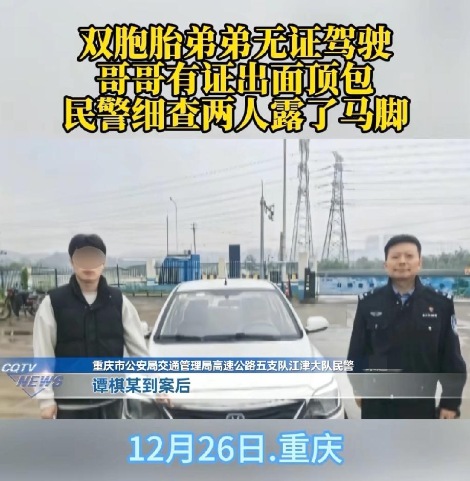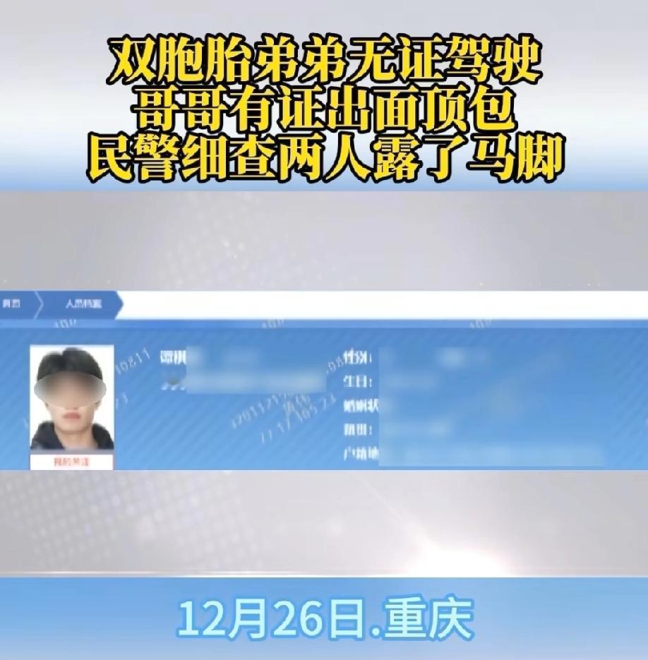 重庆,民警收到卡口预警信息,疑似一男子无证驾驶车辆上高速。民警迅速联系车主,车主一口咬定,她儿子是有证驾驶,还拿出儿子的驾驶证,照片也非常相像。民警经过信息比对,发现确实是双胞胎弟弟无证驾驶,哥哥却出面顶包。为了让真相水落石出,民警仅用一招,就让男子说出真话,原来,弟弟还在上大学,自我感觉可以,就私自驾车回学校。 12月26日下午6点左右,市公安局交通管理局高速公路五支队江津大队的民警正忙着日常执勤,突然一条卡口预警信息弹了出来。 预警信息提示,在S6渝泸高速公路上,一辆渝牌轿车的驾驶人涉嫌无证驾驶,被监控抓拍了个正着。 民警不敢耽搁,赶紧联系上了这辆车的车主杜女士,想了解一下无证驾驶的具体情况。 没想到,电话那头,杜女士语气很笃定,一口咬定开车的是自己儿子谭森某,还说儿子有正规驾照,绝对不是无证驾驶。 为了证明自己没说谎,杜女士还特意把谭森某的驾驶证照片发了过来。 可谁知,这一招并没能瞒天过海。 民警对照着预警信息里的驾驶人照片一看,俩照片上的人长得几乎一模一样,眉眼、脸型没半点差别,乍一看真是同一个人。 民警随即在公安系统里核实谭森某的信息,发现他确实在四川南充考取了驾驶证,系统预留的照片也和杜女士发的、预警里的照片高度吻合,而且驾驶资格也处于正常状态。 这时候,换谁看都觉得是监控误报,可民警心里总觉得有点不对劲,按说有证驾驶不该触发无证预警,这里头说不定有猫腻。 抱着严谨的态度,民警又仔细核查了预警信息里无证驾驶人员的身份证号码,这一查可查出了关键线索。 预警信息的身份证号和谭森某的前16位完全一样,只是最后两位不同,而且还是同一个地区的户籍。 民警心里立刻冒出了一个念头,难道是双胞胎兄弟? 为了验证猜想,民警又联系上了谭森某,仔细询问他近期的活动轨迹。 电话里,谭森某一开始还挺镇定,说自己一直在浙江跟着妈妈杜女士打工,最近回过重庆。 可民警接下来的一句话,直接让他慌了神:我们能查到你近期的活动轨迹,你确定回过重庆吗? 谭森某心里咯噔一下,他知道公安系统的轨迹查询可不是闹着玩的,再硬撑下去迟早露馅。 原本想着帮弟弟扛下来,没想到这么快就被民警识破,他只好吞吞吐吐地承认,自己最近确实没回重庆,当天开车的其实是他的双胞胎弟弟谭棋某。 民警随后联系上了谭棋某,一见到民警,谭棋某就知道瞒不住了,老老实实地承认了自己无证驾驶的事实。 原来,谭棋某还在上大学,目前正在考驾照,练了几次车之后,他就自我感觉驾驶技能不错,觉得上路没问题,于是就私自开着家里的车回学校,没想到刚上高速就被监控抓拍了。 事发后,谭棋某心里又慌又怕,赶紧给哥哥谭森某打了电话求助。 谭森某想着兄弟俩是双胞胎,长得一模一样,自己又有驾照,说不定能蒙混过关,帮弟弟逃过处罚,于是就和妈妈杜女士一起出面顶包,可没成想还是没能逃过民警的火眼金睛。 了解清楚事情的来龙去脉后,民警对谭棋某进行了严厉的批评教育。 谭棋某也认识到了自己的错误,态度十分诚恳,一个劲地说以后再也不敢这么冲动了。 考虑到他认错态度良好,民警依法对其作出了1000元罚款的处罚,同时也对他的家人进行了安全教育,坚决杜绝无证驾驶的情况发生。 《道路交通安全法》第九十九条规定:未取得机动车驾驶证、机动车驾驶证被吊销或者机动车驾驶证被暂扣期间驾驶机动车的,由公安机关交通管理部门处二百元以上二千元以下罚款,可以并处十五日以下拘留。 本案中,双胞胎弟弟谭棋某虽在考驾照、自认为驾驶技能合格,但未取得正式驾驶证,不具备法定驾驶资格,私自驾车上高速的行为已构成无证驾驶。 无证驾驶不仅是对自身安全的漠视,更严重危害高速公路公共安全。高速公路车速快、车流大,无证驾驶者缺乏应急处置经验,极易引发恶性事故。 因此,民警对谭棋某作出1000元罚款,未并处拘留,已经是从轻发落了。 《治安管理处罚法》第六十条规定:伪造、隐匿、毁灭证据或者提供虚假证言、谎报案情,影响行政执法机关依法办案的,处五日以上十日以下拘留,并处二百元以上五百元以下罚款。 哥哥谭森某明知弟弟无证驾驶,却谎称自己是驾驶人,杜女士配合提供其驾驶证照片佐证,二人共同意图误导民警调查,干扰交管部门依法办案。 这样的顶包行为会拖延办案进度、浪费行政资源,甚至可能导致违法者逃脱制裁,严重者还会涉嫌包庇罪。 好在,谭森某在民警核查活动轨迹时主动坦白,未造成严重后果,民警对其与杜女士以批评教育、安全教育为主,也算是法外开恩。