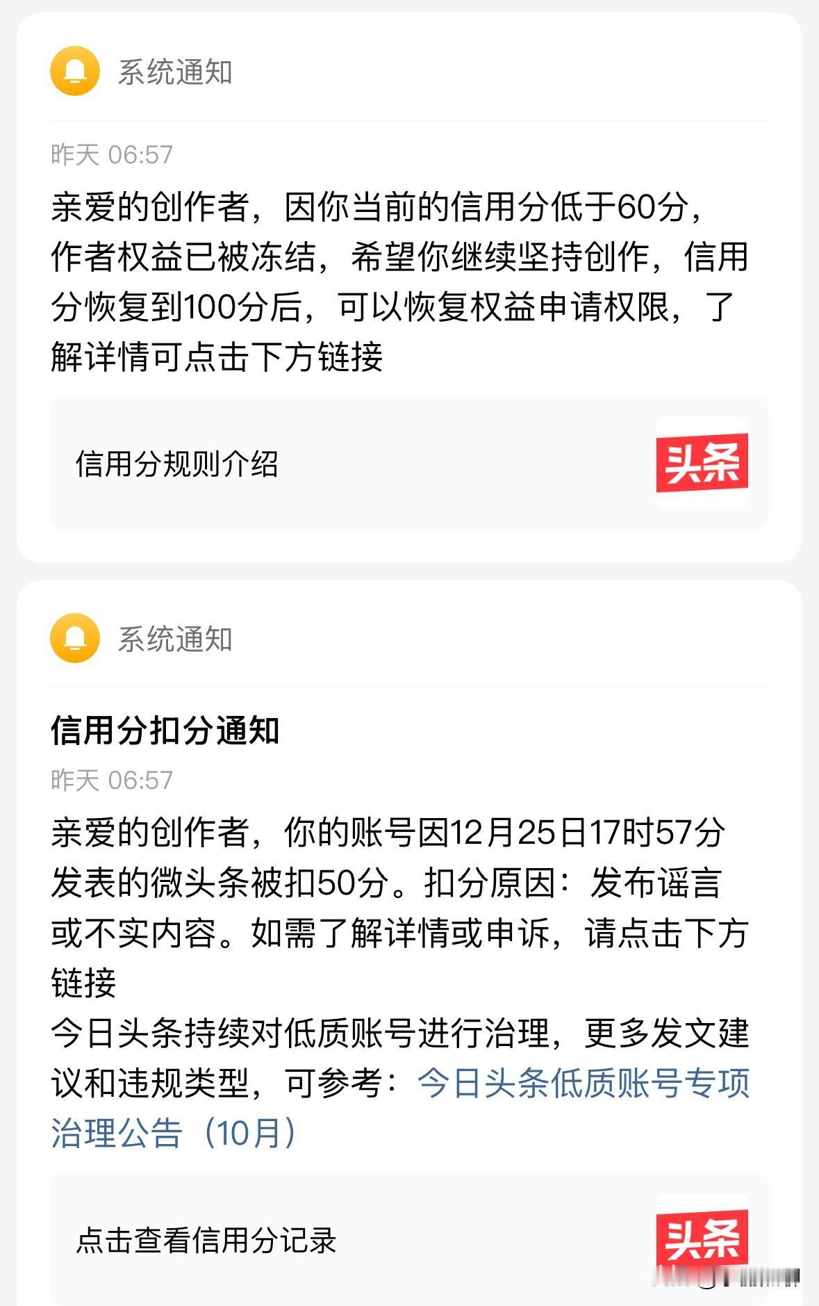 天塌了,这不是完了吗! 昨天一天太忙了,就下午的时候匆匆忙忙的写了两篇文章。 未读消息有好多都没顾得上回复,今天终于闲下来了,本想着把未读消息回复完后,再好好写几篇文章。当我兴致勃勃的点开头条的未读消息时,我看到我的头条信用分前天竟然被扣了50分。 当时我都傻眼了,这不是完犊子了吗?这还有什么补救的措施吗?