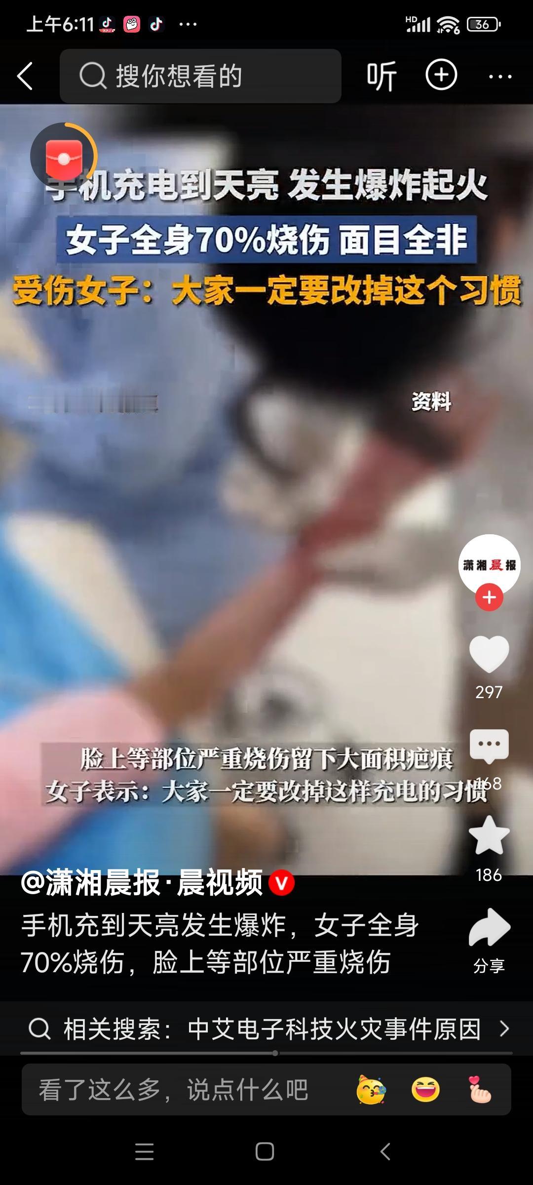 震惊!女子彻夜充电引发火灾,手机爆炸瞬间变“火药桶”!生命危在旦夕! (素材来自网络) 2025年12月26日,湖北一名年轻女子的平凡夜晚竟然变成了一场生死攸关的灾难。事情的始末令人心惊肉跳,也再次敲响了我们对手机充电安全的警钟。 事情发生在一个普通的夜晚,女子像往常一样,将手机放在枕边准备休息。她习惯性地将手机连接到充电器上,没想到这次却成了噩梦的开始。午夜时分,女子进入梦乡,手机还在悄无声息地充电。然而,令人难以置信的是,充电器突然发生了自燃,火焰迅速蔓延,瞬间引燃了被褥。 火光冲天,浓烟滚滚。家人被惊醒,慌忙扑灭火焰,但为时已晚。火势迅速蔓延,导致女子全身70%的重度烧伤,伤势极其严重。救护车迅速将她送往医院抢救,目前仍在重症监护室接受治疗。 这起事故引发了社会的广泛关注,也再次提醒我们:手机充电安全绝非小事! 近年来,随着智能手机的普及,充电已成为人们日常生活中不可或缺的一部分。然而,许多人对充电安全的重视远远不够。数据显示,因充电引发的火灾事件逐年增加,尤其是在夜间充电时,风险更是大大提升。 据专家分析,手机充电爆炸的原因主要有以下几方面: 1. 劣质充电器和数据线:许多消费者为了省钱,使用非原装或低质量的充电器和数据线。这些产品可能存在电路短路、过热等隐患,极易引发火灾。 2. 过度充电或长时间充电:不少人习惯将手机充满后仍然插着电源,甚至彻夜充电。这种长时间过度充电会导致电池过热,逐渐损坏,甚至爆炸。 3. 电池质量问题:一些非正规厂家生产的电池存在安全隐患,内部材料不达标,极易发生短路、膨胀甚至爆炸。 4. 环境因素:充电时环境温度过高、通风不良,也会增加火灾风险。 特别值得注意的是,华为、苹果等品牌手机偶尔也会出现爆炸事件,但多数是使用非原装配件或在不安全环境下充电导致。去年,一起华为手机在夜间充电时突然爆炸的事件曾引发热议。 面对频发的充电爆炸事件,我们必须采取措施,确保自己和家人的安全。 首先,选择正规品牌的原装充电器和数据线。虽然价格可能略高,但质量有保障,能有效避免短路和过热风险。 其次,避免长时间夜间充电,尤其是在枕边、被褥上充电。专家建议,充满电后及时拔掉充电器,避免过度充电造成的电池损伤。 再次,避免在高温、潮湿或通风不良的环境中充电。保持充电区域干燥、通风良好,是预防火灾的重要措施。 此外,定期检查手机电池的状态,如出现膨胀、发热、异常发光等情况,应立即停止使用,及时更换电池。 最重要的是,提升安全意识。不要贪图一时的方便,将手机放在枕边或床上充电,更不要在睡觉时长时间充电。 这起湖北女子的惨剧再次敲响了警钟。手机爆炸不仅会造成财产损失,更可能危及生命。过去几年里,类似的悲剧屡见不鲜:有人在夜间充电时突然爆炸,导致严重烧伤甚至死亡。 有网友回忆起自己曾经遇到的类似事件:“我曾在夜里充电,结果手机突然起火,差点酿成大祸。”也有人在社交平台上分享了自己的经验:“一定要用原装充电器,不要贪图便宜,安全第一。” 更有一些专业人士呼吁:相关部门应加强对手机充电设备的监管,严厉打击假冒伪劣产品,确保市场上的充电器和电池符合安全标准。 这起湖北女子夜间充电爆炸事件,给我们敲响了警钟。无论是日常生活还是工作学习,手机已成为我们不可或缺的工具,但安全使用更应放在首位。 我们应牢记:不要在枕边或被褥上充电,不要长时间夜间充电,选择正规品牌的配件,定期检查电池状态。只有这样,才能最大程度地保障自己和家人的生命财产安全。 让我们共同努力,拒绝“手机充电爆炸”的悲剧再次发生。安全用电,从点滴做起,让科技为生活带来便利的同时,也守护我们的生命安全! 遇到充电异常、发热或异味时,立即停止使用,及时更换电池或充电器,切勿贪图一时的便利而忽视安全。愿每个人都能平安度过每一个夜晚!手机充电器着火 手机充电器火灾