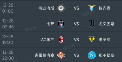 北京时间12月28日,明天的意甲第17轮安排了4场比赛,赛程如下: 第一场01:00,乌迪内斯PK拉齐奥 乌迪内斯和拉齐奥的积分很接近,乌迪内斯21分暂列第12名,拉齐奥以23分暂列第8名,本场的价值对于双方提升名次不言而喻。 第二场03:45,比萨PK尤文 比萨是升班马,也是保级球队,11分排在倒数第二,对于老牌球队尤文来说必须要力争三分。目前尤文以29分暂列第5名,距离第4的罗马只差1分,距离榜首的国米只差4分。 第三场19:30,AC米兰PK维罗纳 AC米兰是冲击冠军的球队,目前以32分暂列第二。过去4场比赛仅1胜,状态波动,杯赛和超级杯都被淘汰 第四场22:00,克雷莫内塞PK那不勒斯 那不勒斯目前以31分暂列第3名,近期他们在意大利超级杯决赛中2-0战胜博洛尼亚夺冠,客场PK第11名的克雷莫内塞力争三分。