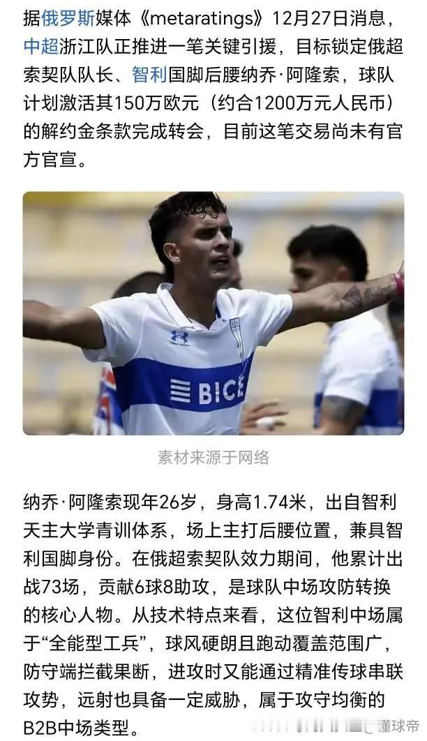 浙江队又有大鱼?俄媒:中超浙江队锁定俄超索契队队长、智利国脚后腰纳乔·阿隆索,转会费约1200万元人民币。 刚刚报道120万美金拿下韩国国脚朴镇燮,再花150万欧买智力国脚,加上队内米特里策,这个外援配置是中超最好的,新赛季是要干大的,就是奔着冠军去的。 但是有一点,这个智力国脚也是后腰,和卢卡斯一个位置,难道浙江要双后腰外援。中超