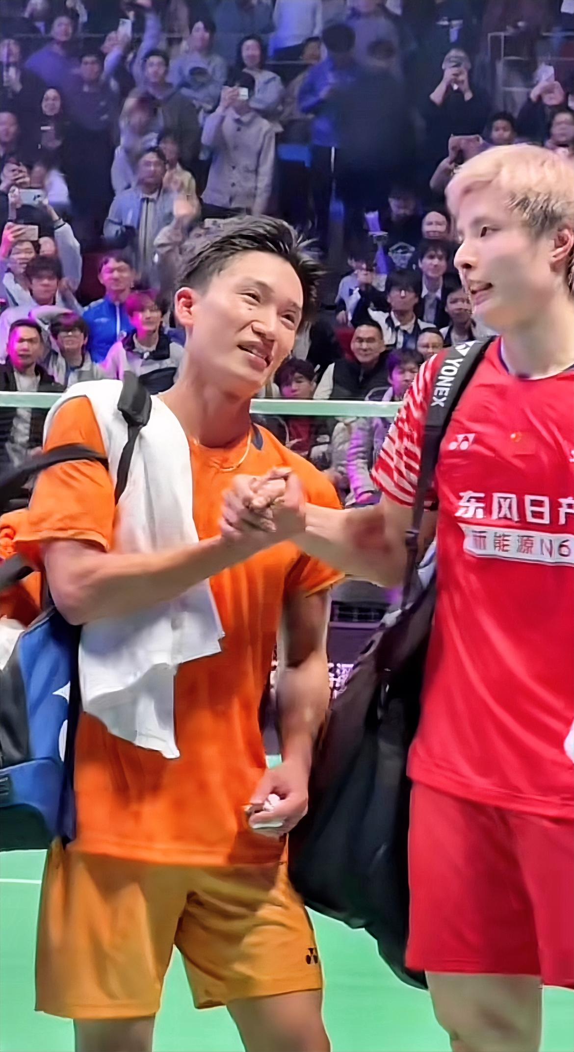 2025天王杯焦点战:石宇奇VS桃田贤斗。 新科世锦赛男单冠军对阵前世锦赛冠军,以为会是一边倒的局面,没想到比分还咬得很紧,退役这么久还能和现役世界第一打成这样已经很不错了。 本来可以有桃田时代的,无奈天妒英才! 看得出桃田贤斗对离开赛场还是很不舍得的,最后在比赛结束时石宇奇主动拥抱对手也是很暖心的。[心]