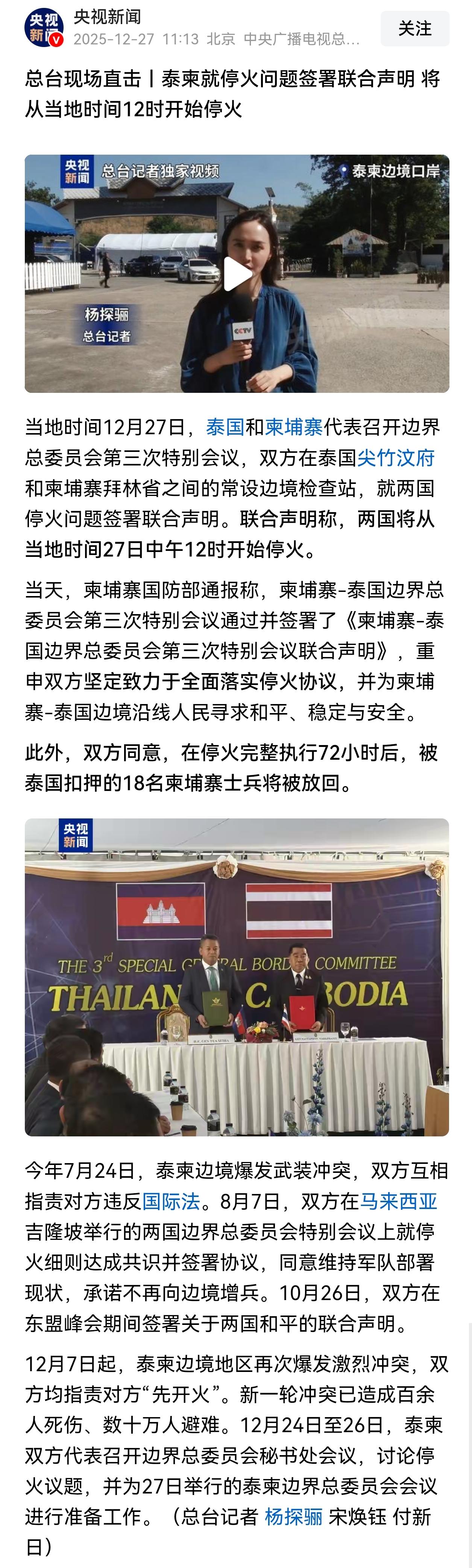 泰柬冲突终于在今天按下停止键了。在泰柬停火斡旋中,中国的力量是不能忽视的,也是在中国派出特别代表后,泰柬两国都表达了停战的意愿,这才有了这次的泰柬两国停战声明。 要知道,在中国之前,特朗普也曾喊话泰柬两国停战,但直接被忽视,并没有阻止战火延续。笔者一直坚信今日一个中国已经不是往日的中国了,但依然有许多人不相信,他们仍然相信国外的一些虚假的宣传,仍然觉得我们与美国,与西方发达国家相去甚远。但现实总是一再打脸,硬刚美国的关税战,我们赢了。对日本的交锋,也让他们明白,走军国主义道路是行不通,也是不可能的,年年都去参拜靖国神社的高市早苗,昨天就没有去参拜。还有就是这次的泰柬冲突,在美国调停失败后,我们在东盟的框架内斡旋成功了。 相信未来会有更多国际事务期待中国的声音,也会有更多实例证明中国已经走向了国际舞台中央了。