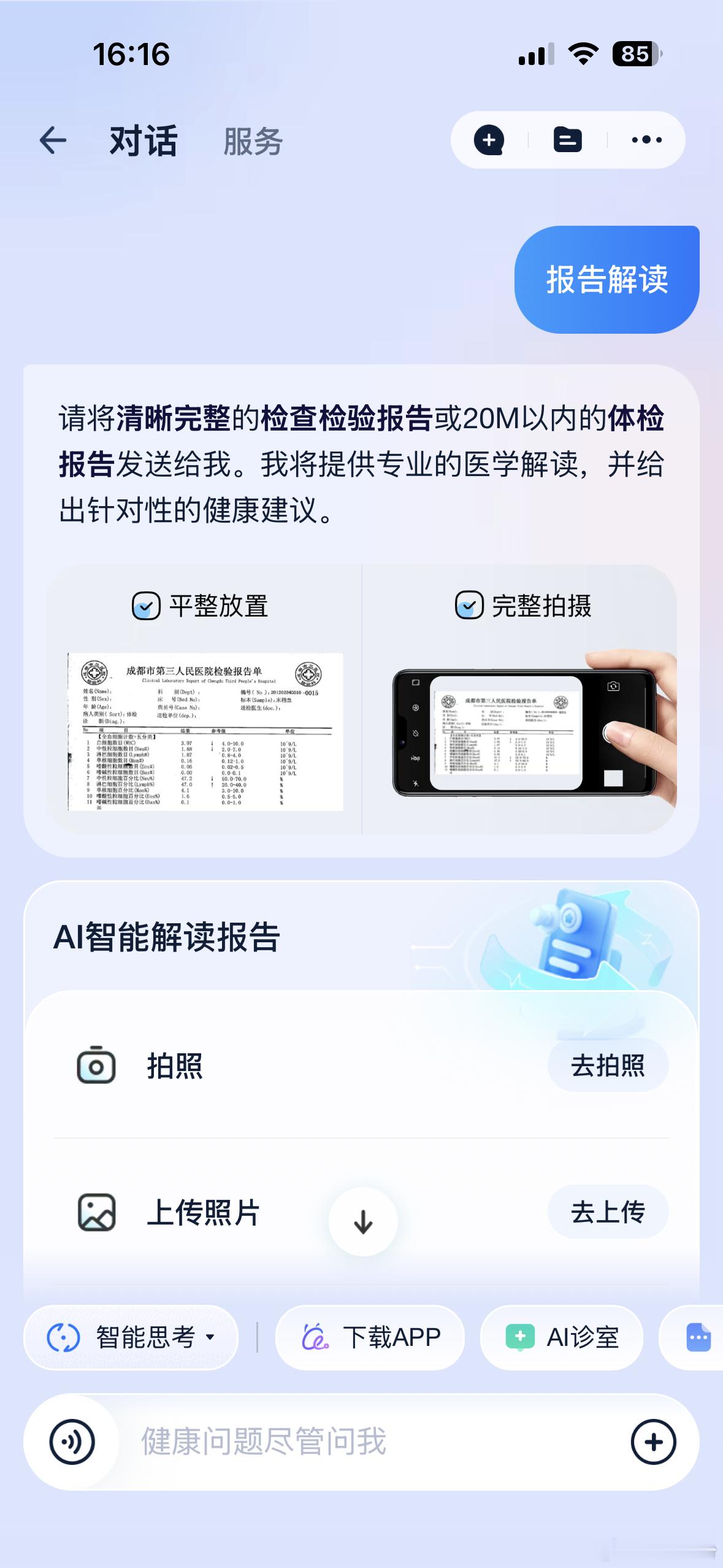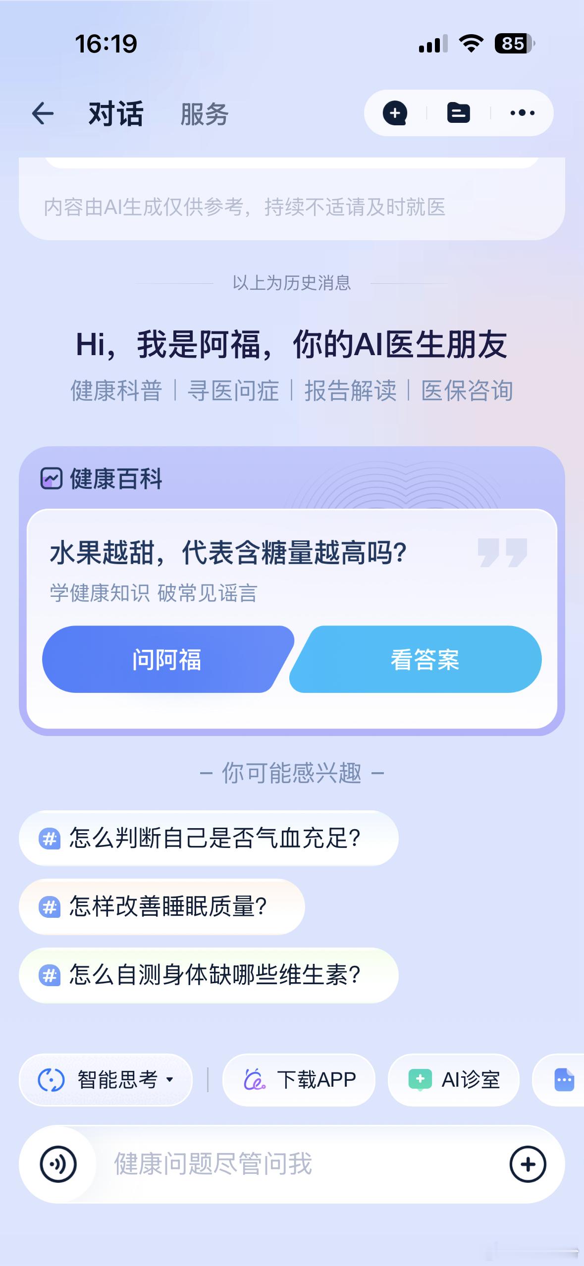 AI医生请回答 一起用阿福解决各种健康小问题!老是在等电梯的时候,看到何炅打的那个蚂蚁阿福的广告,我就在想,真有那么好用吗。 回家我就打开支付宝试了试,轻轻松松找到蚂蚁阿福的界面。 服务项目真不少啊:健康科普,对医问症,报告解读,医保咨询。。。 几乎涵盖了健康知识的方方面面。 刚好我前几天做了个体检,可以拿来试一试。 我截了体检报告中的一断,发给阿福看。 神了,阿福几秒钟就给我解读了出来,比起医生模模糊糊跟我讲的几句话,阿福的回答就太具体了,他详细分析了我的每一项指标的含义,有哪些风险,以及今后该怎样做,一条条交待得清清楚楚。 感觉以后我的健康搭子就是他了。 阿福,我的AI医生朋友,我会常常来看你的。
