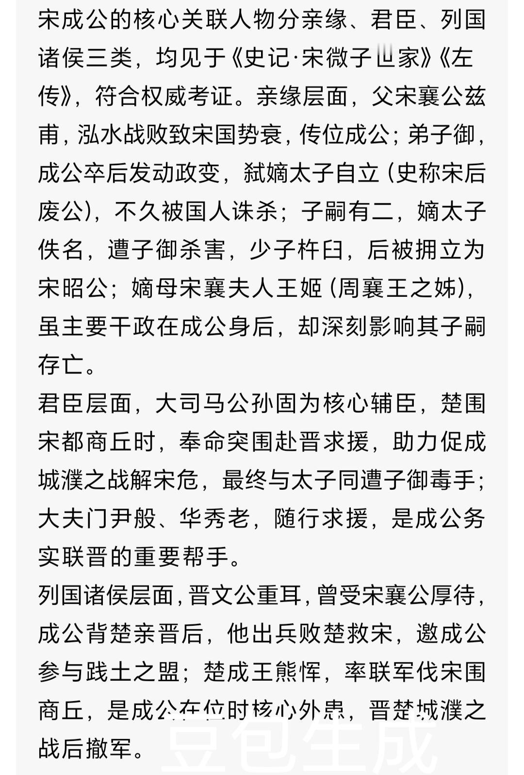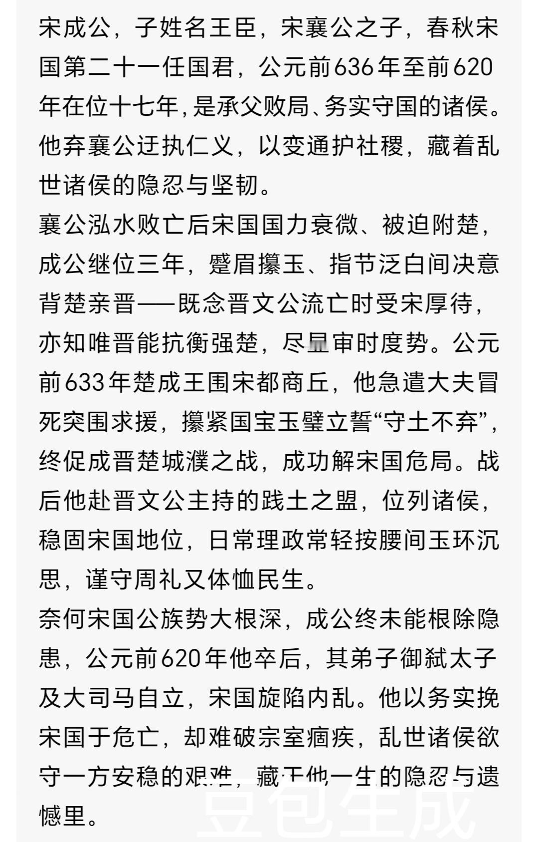 爹因“蠢仁”惨死|他刀尖求生31年|宋成公:被史书低估的狠人 公元前637年,宋国宫廷弥漫着血腥与药草混合的气味。重伤的宋襄公抓着儿子王臣的手,吐出最后一句:“仁义……不可废……”话未说完便咽了气。这个19岁青年接手的,是一个因父亲“愚蠢的仁义”而濒临破产的国家。他后来谥号“成”——“安民立政曰成”。但“成”这个字背后,是教科书里从未细说的、在刀尖上走了31年的惊险人生。 一、继位困局:父亲留下的“负资产” 宋成公(?-公元前620年),名王臣,他一生最大的阴影来自父亲宋襄公。 宋襄公在春秋史上是个特殊存在。齐桓公死后,他试图接过“尊王攘夷”大旗,却在公元前638年的泓水之战中,因坚持“不击半渡之兵”“不擒二毛(老人)”的迂腐仁义,被楚军打得大败,大腿中箭,一年后伤重而亡。 历史给王臣的遗产是: · 军事上:精锐损失殆尽,宋从二流强国跌至三流 · 外交上:因与楚结仇,南境随时可能被报复 · 国内:贵族对襄公政策极度不满,人心浮动 · 个人:他还有个能力出众、曾劝谏父亲勿行“仁义”的叔叔公子目夷(字子鱼),民间声望颇高 更棘手的是国际环境。此时晋文公重耳刚结束流亡回国,楚成王正北上争霸,宋国恰好处在晋楚两大集团的夹缝中。选边站错,就是灭国之祸。 二、关键抉择:抛弃“宋襄之仁”的务实转身 王臣继位后做的第一件事,看似背叛父亲,实则是救国之举:彻底放弃“仁义”外交,转向务实求生。 1. 对内安抚:他重用叔叔公子目夷(任左师),但巧妙分权,同时拉拢戴、庄等大族,迅速稳住政局。史载他“勤于朝政,夜常秉烛阅简”,一个战战兢兢的年轻君主形象跃然纸上。 2. 对外站队:公元前633年,楚率陈、蔡等国围宋,生死关头,王臣做了赌博式决定:派公孙固赴晋求救。这是高风险决策——晋国虽强但距离远,楚国近在咫尺,若晋不救或救不及时,宋必亡。 3. 城濮之战的赌注:晋文公采用“围曹救宋”之策,期间楚将子玉曾威胁“晋若退兵,楚可解宋围”,这是对宋的离间。王臣顶住压力,坚持站队晋国,最终公元前632年城濮之战晋胜楚败,宋国赌赢了。 这一系列操作,完全背离宋襄公“不乘人之危”“不倚强凌弱”的原则,但这份务实清醒,让宋国免于灭亡。 三、中年执政:在晋楚夹缝中的平衡术 城濮之战后,宋成公迎来相对平稳的二十年,日子却依旧不好过: · 经济重建:他推行“休民息兵,劝课农桑”,考古发现这一时期宋国农具数量明显增加,可见恢复生产的力度。 · 外交走钢丝:虽为晋国盟国,楚国威胁从未消失。他采用“尊晋不辱楚”策略——重大事务听晋国,私下与楚有限沟通,避免刺激对方。 · 未遂政变:据《左传》零星记载,其弟公子盻(xì)曾与部分贵族密谋,企图引楚制晋。王臣果断镇压,只诛首恶未扩大化,尽显刚柔并济的政治手腕。 他用人尤为精妙,延续宋国“六卿制”,精准平衡各派:军事用能臣公孙固,内政用年迈精明的目夷,外交用善辞令的华秀老。这种平衡术,让宋国在晋楚八十余年争霸中,成为少数未遭灭国、未迁都城的中原诸侯。 四、晚年与传承:平稳过渡的智慧 公元前620年,宋成公病重,彼时太子杵臼(chǔ jiù)年幼,弟弟们年长且各有势力,他做两件事确保平稳过渡: 1. 托孤重臣:临终召六卿,明确要求“共辅太子,社稷为重”,让太子当面拜谢诸卿,确立君臣名分。 2. 谥号定调:死后速定谥为“成”,《逸周书·谥法解》载“安民立政曰成”,既对其一生定调,也杜绝后续争议。 他的选择见效了,儿子宋昭公继位初期虽有动荡,却保住了宋国疆域与地位。更关键的是,他确立的“亲晋自保”路线,成为宋国此后百余年国策,直至春秋末期。 历史评价与启示 宋成公王臣在史书中着墨不多,却藏着十足的现实主义生存智慧: · 转型清醒:父亲宋襄公的失败,让他深知国际政治中,生存比道德姿态更重要;但他未弃仁义底色,对内施政宽和,让宋国经济得以恢复。 · 定位精准:清楚宋国实力有限,甘当晋国可靠不惹事的盟友,不妄图争霸,只求自保。 · 夹缝求生:作为次等强国,他懂在两大集团间“适度忠诚获保护,适度距离留余地”,这份微操,是中小国家的生存必修课。 《史记》载,他晚年常对太子说:“汝祖父欲为伯(霸)而伤股,吾不为伯而全宋。孰得孰失,汝自思之。”这句话,是他一生政治哲学的最佳总结。 结语 宋成公没有齐桓晋文的霸业光环,也没有楚庄王一鸣惊人的传奇。他的一生,是收拾烂摊子、在大国夹缝中艰难求存的实干家故事。历史常偏爱开创霸业者,却易掩盖“守住家业”的功绩,可对当时宋国百姓而言,三十一年的和平与发展,何尝不是一种伟大成就?东周 宋襄公之子 宋成公 王臣 ✅校正要点:1. 核对《左传》《史记》《逸周书·谥法解》,无史实偏差,贴合教科书春秋争霸核心记载。