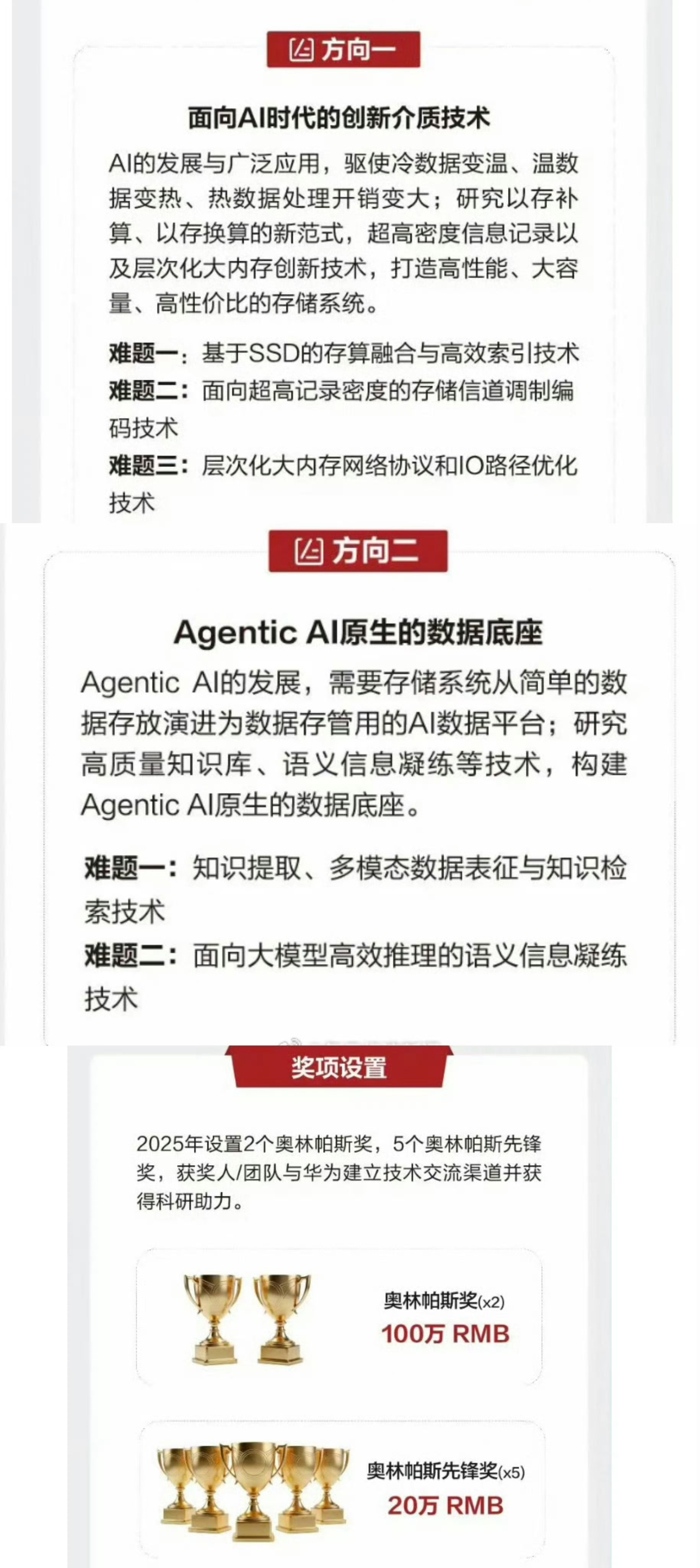 华为悬赏300万元求解AI难题看这几个AI的题目,相比较这300万的求解悬赏,怎么感觉提出的AI问题价值更高呢。每个问题的定义都非常牛逼,甚至能看到华为对未来存储技术发展方向的判断,感觉发出来就是用来表达华为的远见和引导业界的研究方向的。至于奖金,更像是一种鼓励。