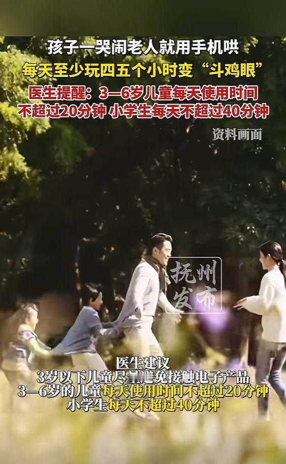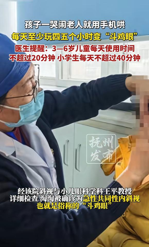 “悲剧还是发生了!”近日,湖北武汉,一对夫妻因工作忙,就把5岁的女孩交给爷爷奶奶带,老人见女孩一哭闹,就用手机哄她,每天至少都要给女孩玩四五个小时,结果女孩成了“斗鸡眼”,去医院诊断为急性共同性内斜视!网友:这下后悔了吧! 有一对在外打工的年轻夫妻,最近那可是肠子都悔青了,这俩人平时工作那叫一个忙,经常加班到深夜,实在是没那个精力去照顾刚满5岁的闺女,没办法,他们就把孩子送回了老家,交给了爷爷奶奶带着,本来想着老人带孩子能细心点,结果没想到,这一送竟然把好好的孩子给送出了毛病。 爷爷奶奶那是真心疼孙女,可这孩子毕竟年纪小,容易哭闹,每次孩子一哭,老两口就没了招,为了图个省心,干脆就把手机塞给孩子,让她看动画片、刷短视频。 你别说,这招还真灵,孩子一拿到手机,那哭声立马就停了,变得安安静静的,久而久之,这手机就成了老两口带娃的“法宝”,也成了孩子的“电子保姆”。 刚开始的时候,老人也没觉得这有啥不对,心里还想:“只要孩子不哭不闹,玩会手机怕啥?”慢慢地,这就养成习惯了。 孩子每天一睁眼就要手机,吃饭的时候得看着手机才肯张嘴,晚上睡觉前还得抱着手机刷半天,这一天累计下来,孩子看手机的时间最少也得有四五个小时,有时候大人忙起来,孩子甚至能抱着手机连续看上半天都不带动窝的。 虽然夫妻俩偶尔跟家里视频,看见孩子老拿着手机,也提醒过老人别让孩子看太久,可老人总是一句“没事,孩子乖就行”给挡回去了,根本没把这话往心里去。 直到大概半个月前,夫妻俩抽空回老家看望孩子,这一看可把他们吓坏了,他们发现女儿看东西的时候,两只眼睛的黑眼珠子总是不由自主地往中间跑,这明显就是那种“斗鸡眼”的样子啊!而且孩子还总跟他们说:“爸爸妈妈,我怎么看眼前的东西有两个影啊?我看不太清楚。” 这下夫妻俩可坐不住了,赶紧带着孩子去医院检查,眼科医生详细问了问孩子平时的生活习惯,最后给出了诊断结果:这是急性共同性内斜视。 医生说了,导致这就病的主要原因,就是孩子长时间近距离地盯着手机看,导致两只眼睛的调节集合功能失衡了。 医生解释说,像这种学龄前的孩子,眼睛的融合功能还没发育完全呢,长时间盯着那个小小的手机屏幕,眼睛就会一直处在那种高度紧张的调节状态,内直肌的劲使得太大了,时间一长,眼球就会往里偏。 这病可不仅仅是影响孩子长得好不好看,更重要的是可能会损伤孩子的立体视觉,严重的甚至会引起弱视,那时候后悔都来不及。 现在这情况,医生建议先通过戴那种专门的光学矫正眼镜来改善视觉质量,还得配合做视功能训练,后续还得看恢复得怎么样,再评估是不是需要动手术。而且这治疗周期可不短,少则几个月,多则好几年,孩子得遭老罪了。 看着孩子鼻梁上架着厚厚的矫正眼镜,每天还得耐着性子做那些枯燥无味的视功能训练,夫妻俩是又心疼又后悔。 他们一边抹眼泪一边说,要是早知道会这样,就算工作再忙、再累,也得把孩子带在身边自己照顾,绝对不能把手机当保姆扔给孩子。 爷爷奶奶在一旁也是满脸的愧疚,一个劲儿地念叨:“都怪我们老糊涂了,图省事,不该让孩子看那么长时间手机啊!” 这事儿传到网上以后,网友们也是议论纷纷,不少人直言:“这下后悔也晚了啊!老人带娃确实容易图省心,但这电子产品真不能当保姆用啊!”“5岁的孩子每天看四五个小时手机,那眼睛能受得了吗?这事儿家长和老人都有责任,都太大意了!” 也有热心的网友分享了眼科医生的建议:像3到6岁这个年龄段的孩子,每天玩电子产品的时间最好别超过1个小时,而且还得拆成好几次看,每次看完还得让孩子往远处看至少6米以外的东西,缓解一下眼睛疲劳。 其实现在这种家庭挺普遍的,家长忙着赚钱养家,老人带娃有时候确实力不从心,就把电子产品当成了“哄娃神器”。 但是大家得知道,这儿童的眼健康那是容不得半点马虎的,0到6岁可是斜视治疗的黄金期,一旦错过了这个时间段,再想恢复双眼视功能可就难了。 医生也特别提醒,家长不管工作多忙,都得重视孩子的用眼习惯,别让孩子长时间近距离用眼,每天得保证孩子有2个小时以上的户外活动时间,要是发现孩子眼睛有点偏斜、喜欢眯着眼看东西或者歪着头看,一定要赶紧带去医院检查。 这一场图省心的“手机哄娃”,最后让孩子遭了这么大的罪,也给咱们所有的家长都敲响了警钟,电子产品这东西不是完全不能碰,但必须得严格控制时间,还得做好引导。 千万别让这“电子保姆”最后害了孩子的健康,毕竟孩子的成长只有一次,有些伤害一旦造成了,那是想挽回都挽回不了的。 对此你怎么看? 信源:杭州网