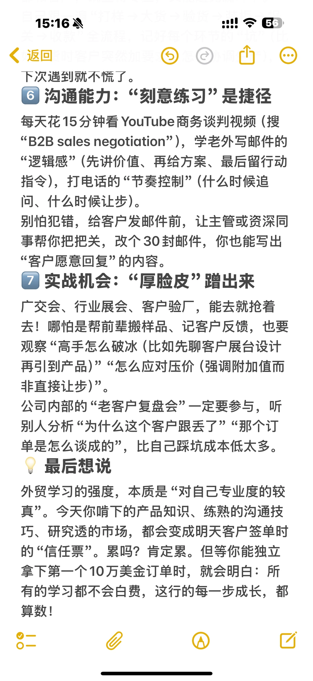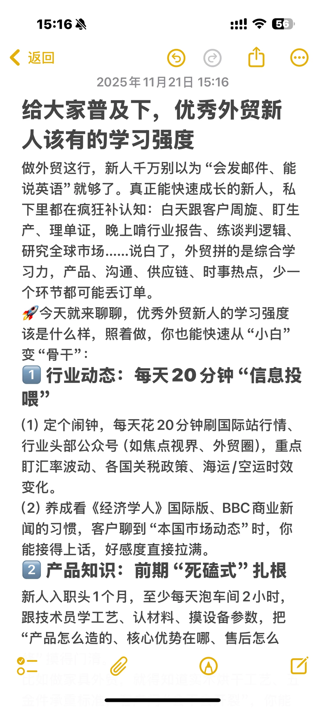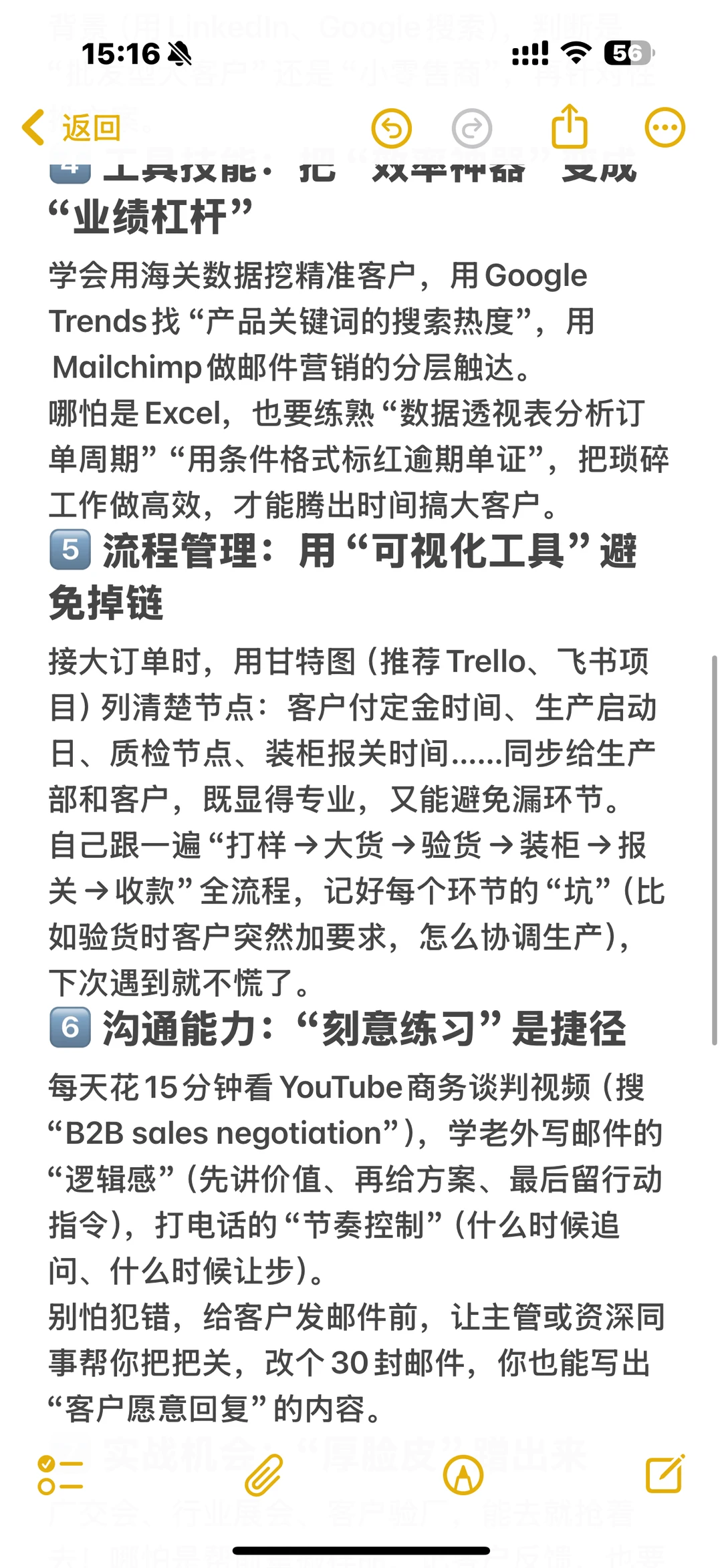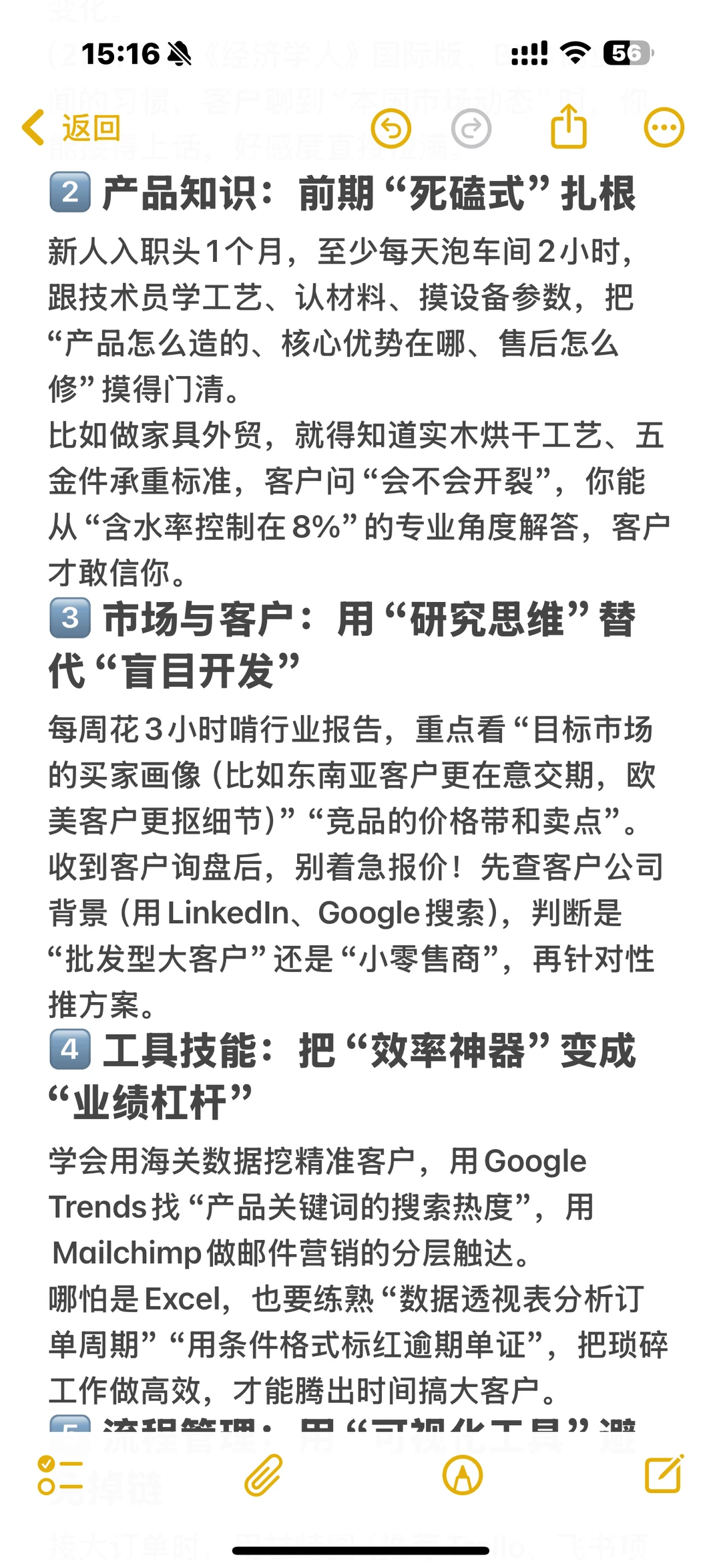 做外贸这行,新人千万别以为“会发邮件、能说英语”就够了。 真正能快速成长的新人,私下里都在疯狂补认知: 白天跟客户周旋、 盯生产、 理单证, 晚上啃行业报告、 练谈判逻辑、 研究全球市场…… 说白了,外贸拼的是综合学习力,产品、沟通、供应链、时事热点,少一个环节都可能丢订单。