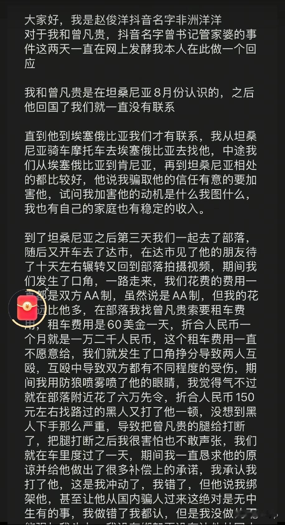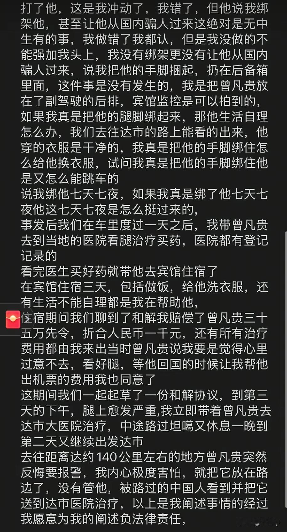 非洲洋洋自述和曾凡贵的前因后果 他说根本不是让曾凡贵去诈骗 俩人合伙拍视频,费用说好的AA制, 因为租车的费用,非洲洋洋花的钱比曾凡贵花的多,于是他找曾凡贵要钱, 曾凡贵不给,俩人打了起来,都有受伤 非洲洋洋气不过 花钱找了路过的非洲人把他打了一顿,没想到非洲人太狠了 把他的腿打断了,非洲洋洋带着他去医院,有监控视频为证,并祈求曾凡贵的原谅,俩人还起草了一份谅解协议 随着曾凡贵的腿伤愈发严重,非洲洋洋就带着他去大医院治疗,在路上曾凡贵后悔了说要报警,非洲洋洋害怕了 就把他放到了路边,没有管他,直到福建的一位大哥发现救了他 他还说以上都是事实,愿意为他的阐述负法律责任 到目前为止曾凡贵都没有回应此事的前因后果,至于到底是不是网传的那样, 只能等有关部门的调查了。