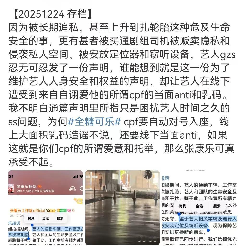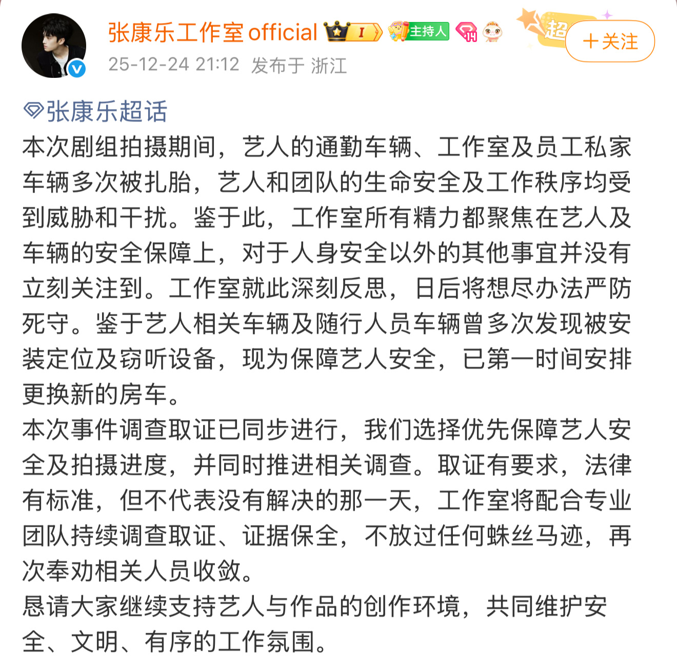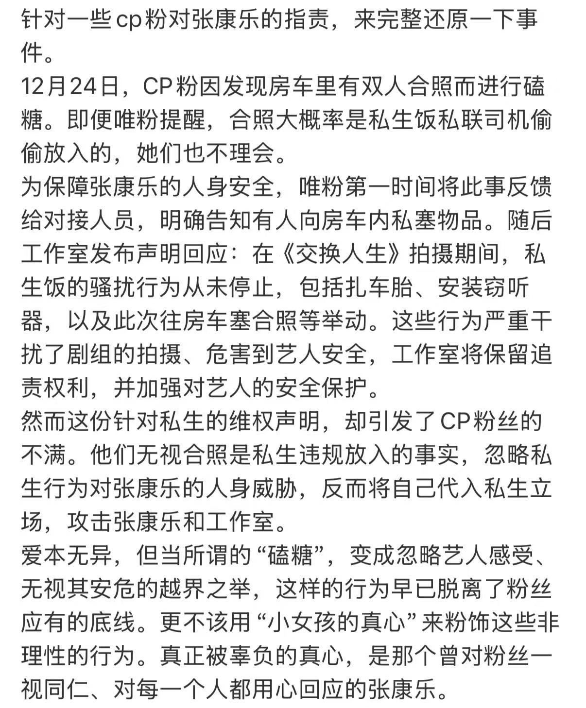 张康乐在拍新戏期间的房车被放了cp物料……工作室发文说拍摄期间还频发使用车辆被扎胎甚至被安装定位器的情况。这种无底线的行为危害他人安全了,以所谓“粉丝”的名义做私生行为,真的太可怕了。追星应有尺度,呼吁大家抵制私生,理性追星。张康乐工作室私生事件回应