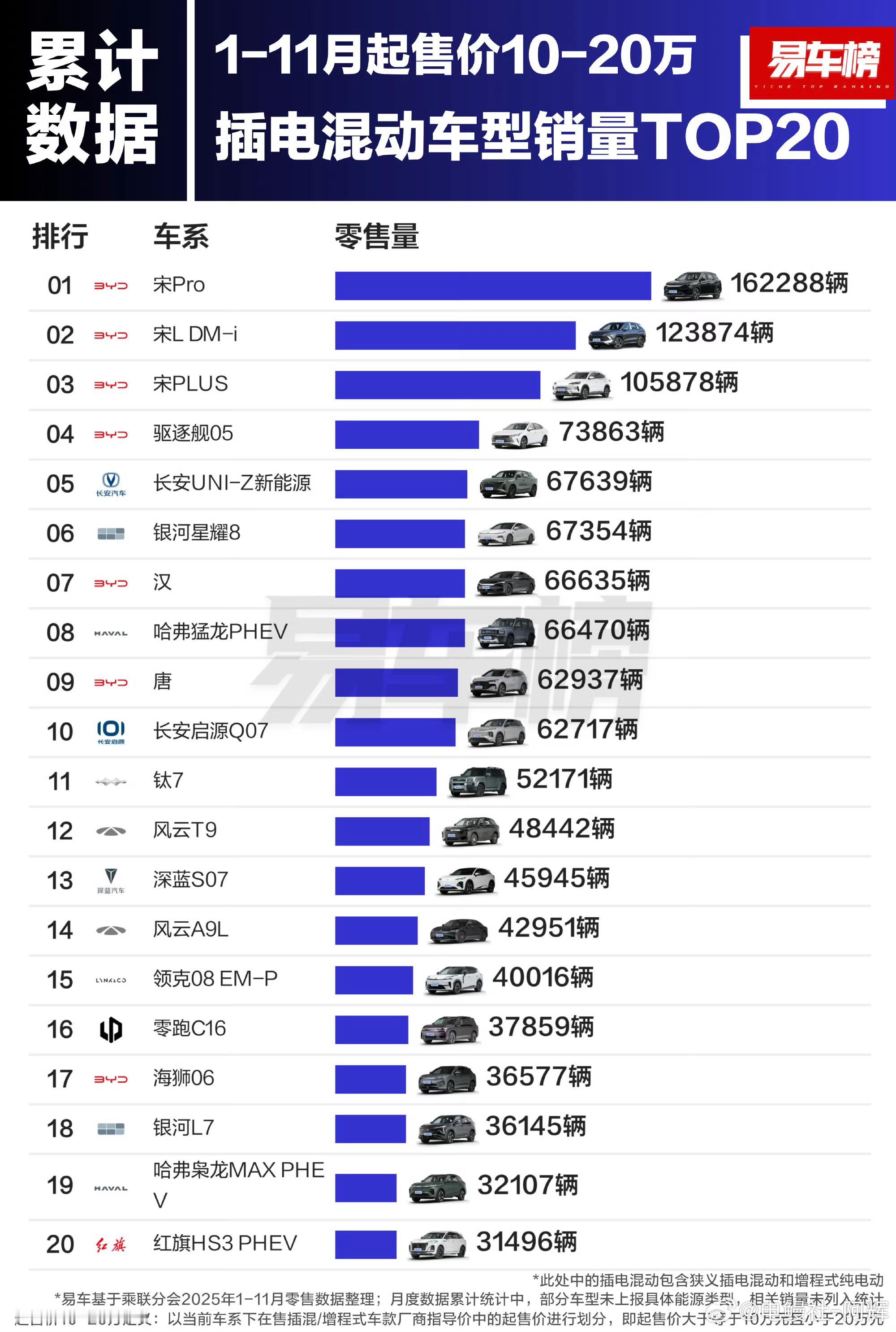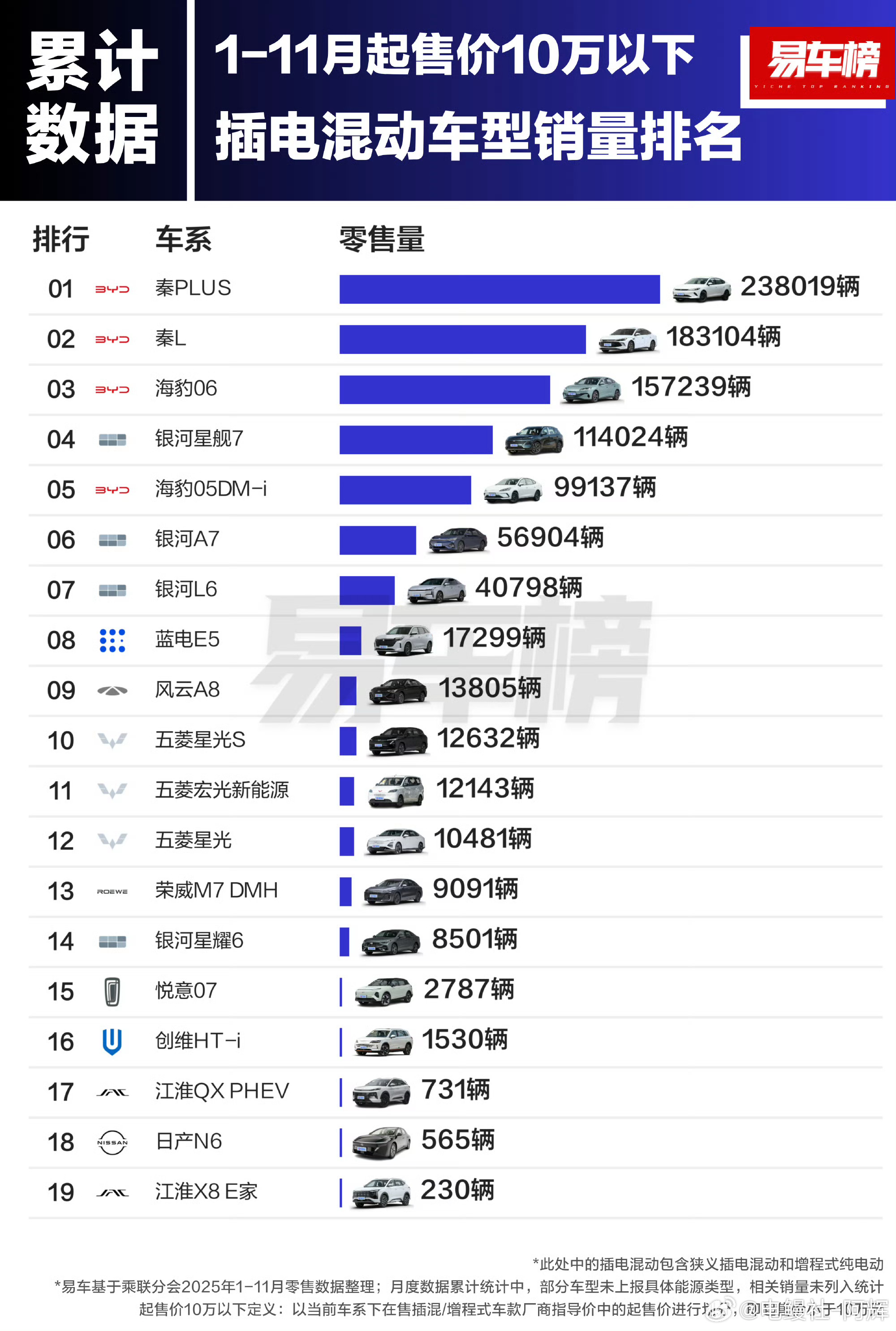 2025年1-11月各价区插电混动车型销量TOP20根据易车整理的乘联分会零售数据显示:迪厂在混动领域强的一批!!起售价10万以下插混车型差不多被比亚迪 吉利 五菱包揽了,销量前3名分别为:秦PLUS、秦L、海豹06,销量分别为238019辆、183104辆、157239辆起售价10-20万插混车型销量几乎被比亚迪包揽,前三名分别为:宋Pro、宋L DM-i、宋PLUS,销量分别为162288辆、123874辆、105878辆注意:此处中的插电混动包含狭义插电混动和增程式纯电动