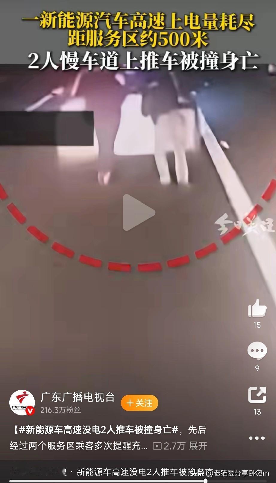 别拿生命赌续航 广东交警刚曝光一起惨剧:司机林某开着新能源车跑高速,明明知道电量只够跑80公里,乘客劝他先充电,他偏不听!结果半路电量耗尽,停在高速慢车道,两人下车推车想“硬扛”,结果被大货车追尾,当场没了命! 出发前林某自己都说电量只剩80公里,乘客劝他充电,他满不在乎的说:“能撑到下一个服务区!” 高速上连过两个服务区,乘客急得多次提醒:“赶紧充吧!”林某就是不停车,坚信能撑到下个服务区。 最终害人害己,刚到第三个服务区前500米,车彻底趴窝。两人居然下车推车!结果才推了20米,大货车视线受限根本来不及躲,直接撞上!两人当场死亡,货车司机也跟着遭殃…… 网友怒骂: “这司机是拿命在赌啊!高速推车?脑子进水了吧! 乘客也倒霉,摊上这么个‘自信哥’,提醒了还不听……” 血的教训!侥幸心理真要命,安全规则不是摆设! 交警紧急提醒+正确操作: 电车高速没电,记住3步保命: 第一立即靠边:能开就赶紧进应急车道,打双闪! 第二放警示牌:车后150米摆三角牌(白天至少150米,晚上200米+)! 第三人要撤到护栏外,打电话:12122高速救援或400厂家电话或保险公司,等专业人员来! 高速推车=送命!货车盲区大,车速快,根本来不及反应! 续航焦虑别硬撑:高速耗电比市区高25%-30%,预留20%余量才安全! 司机林某的一时侥幸,不仅害了自己和同伴,还连累了无辜的司机。 新能源车方便,但安全规则不能丢!开电车跑长途,提前规划、预留电量、遇事冷静,这才是对家人和自己负责! (文章素材来自广东广播电视台,侵删)