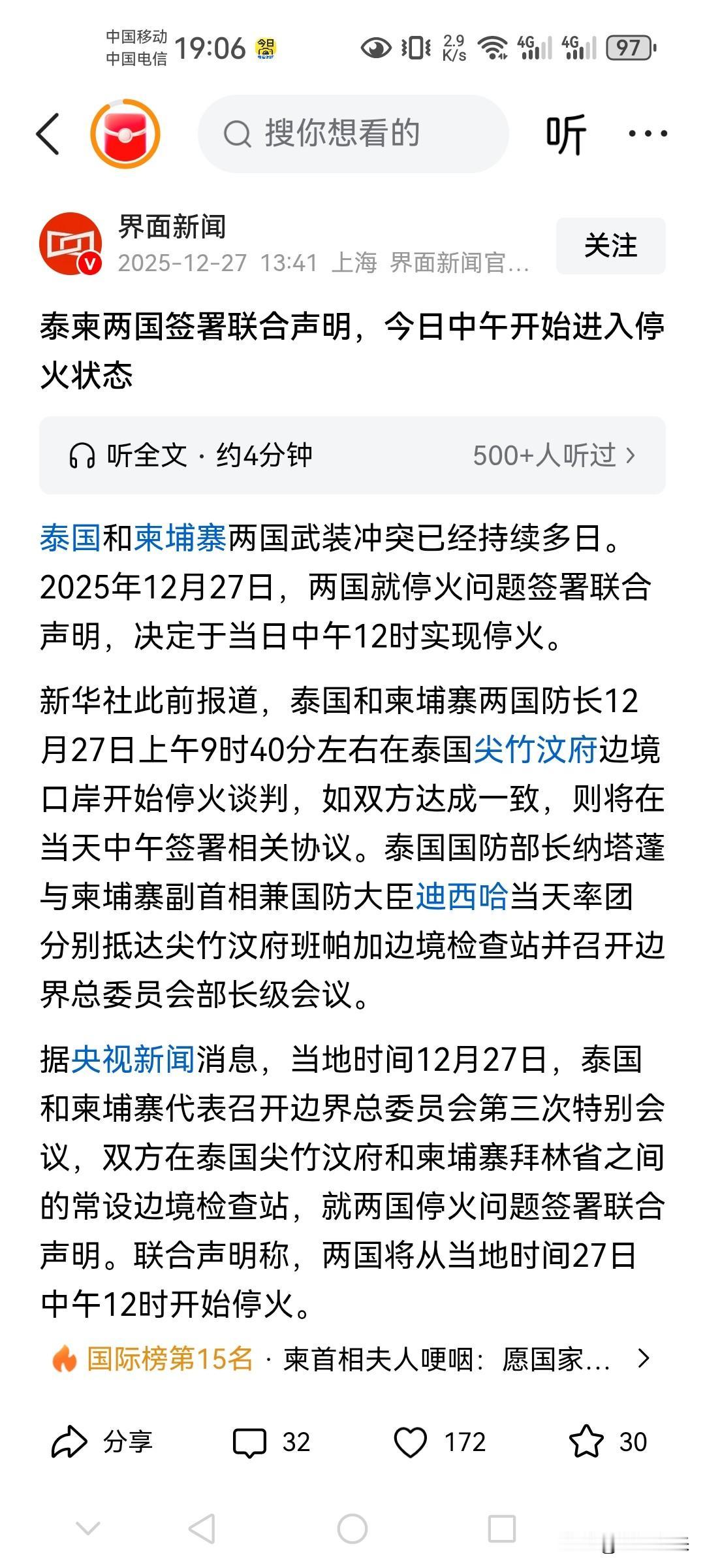 泰国和柬埔寨冲突,谁来都不好使! 只有中国出面斡旋,双方才能做下来好好谈!并且效果立竿见影! 柬埔寨和泰国都不给美国面子,但是维唯独要给中国面子!毕竟都是中国的邻居,作为东方大国,这次出面解决邻居的纠纷,可以说手到拈来!一个国家的实力决定国家地位! 这不泰国和柬埔寨宣布停火,泰国国防部长和柬埔寨国防部长共同签署了停火声明,今日开始正式停火!停火生效后,泰国释放扣押的柬埔寨士兵! 战争受伤的都是老百姓,俩个国家也不愿意持续打,需要一个大国给双方搭线,给彼此台阶,这事就妥了!泰国柬埔寨局势